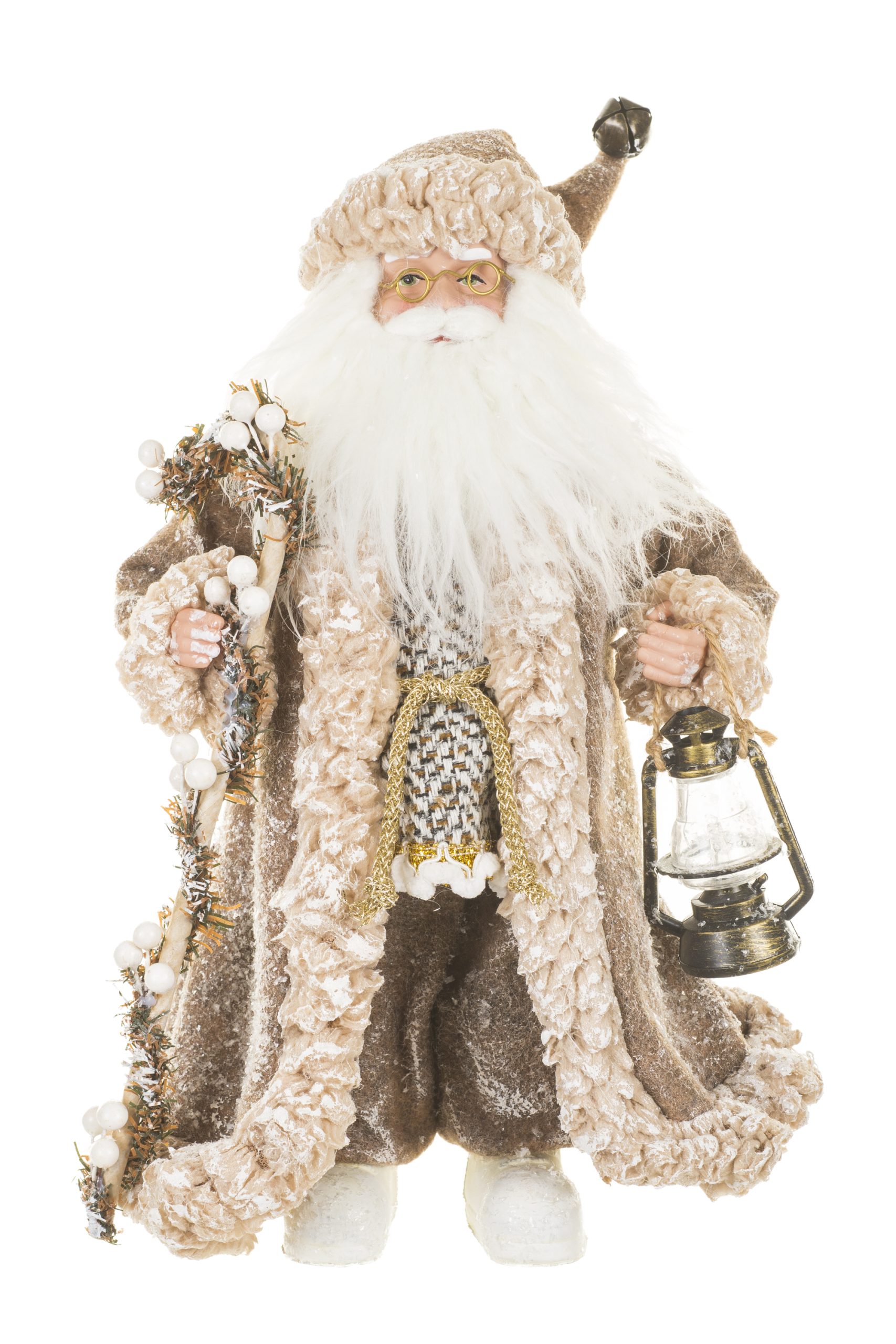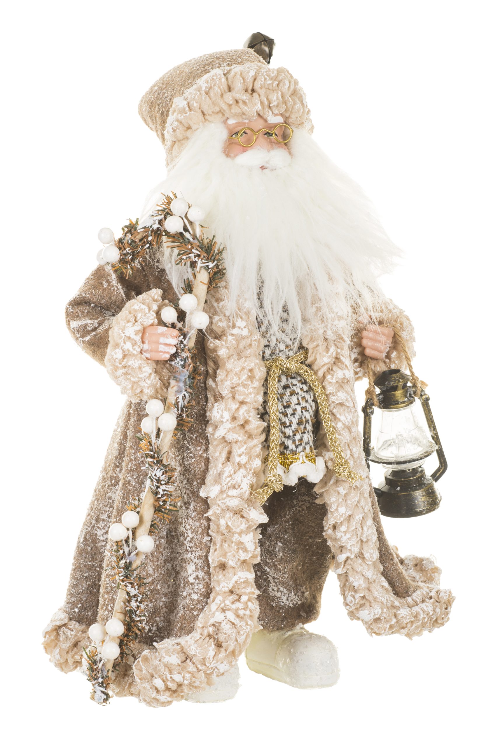 • Description: 13.5" Almond and Cream Papermache Santa Figurine with Frosted Pine Entwined Staff & Blacklustre Lantern