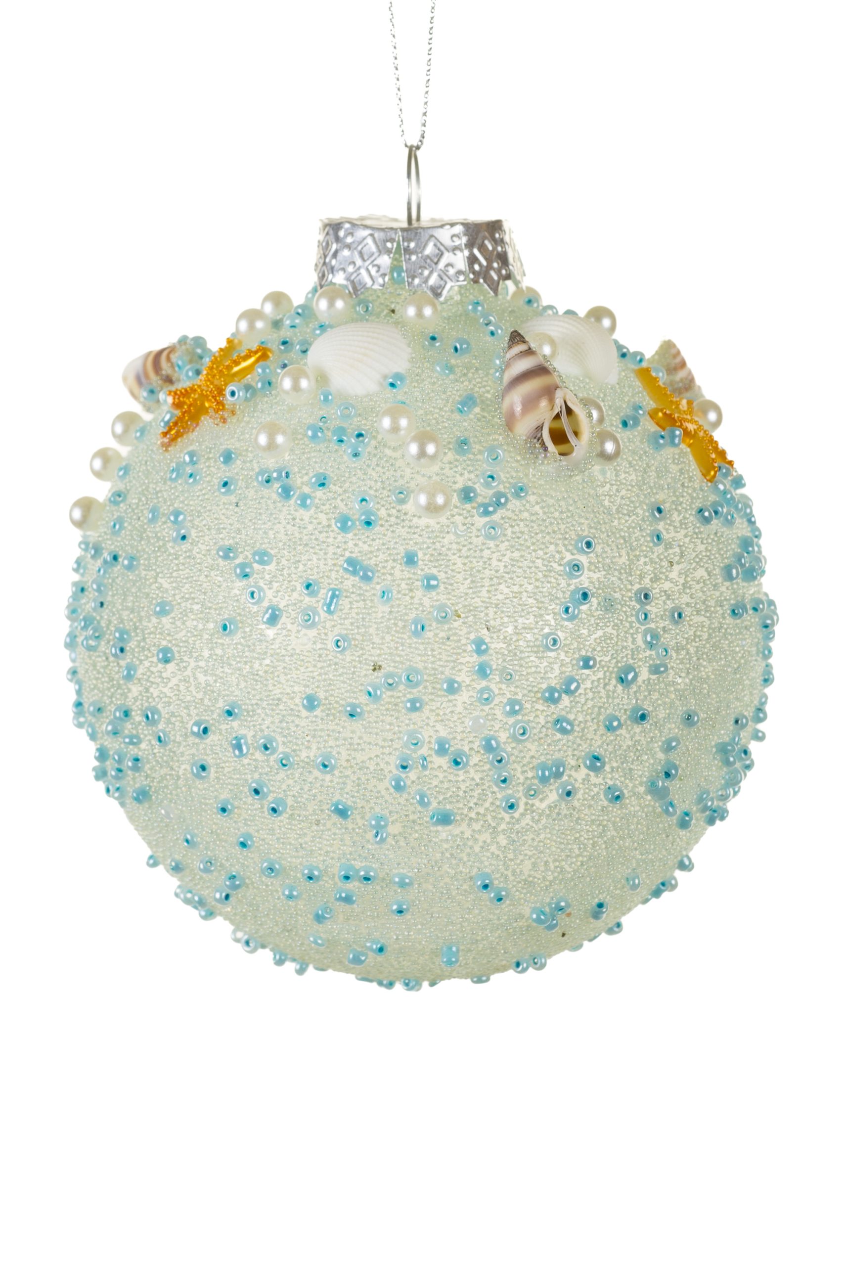 • Description: 3.75" Aqua Glass Ocean Bauble Ornament with Shells & Starfish