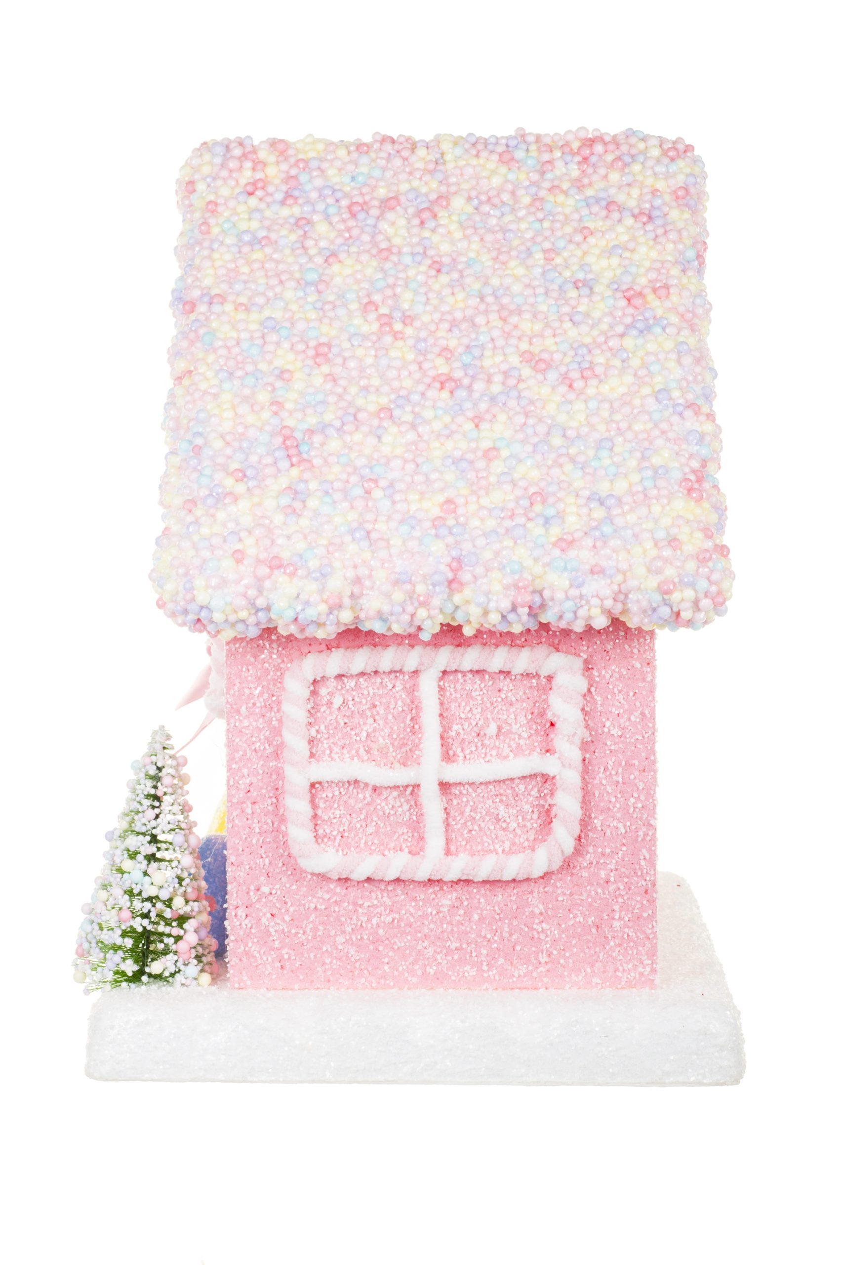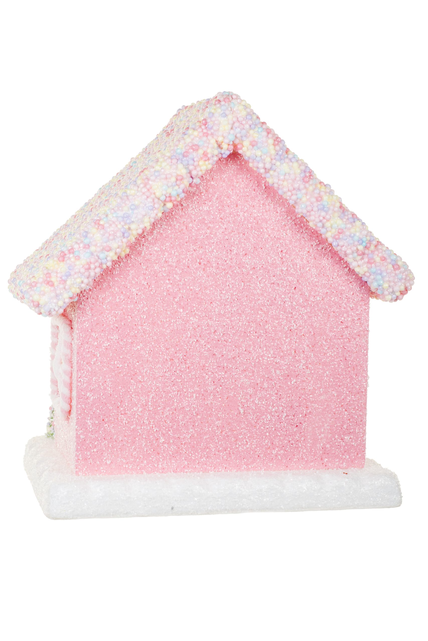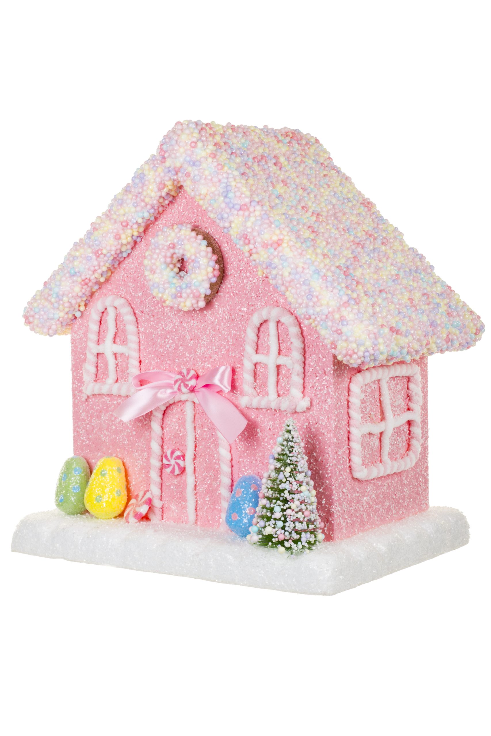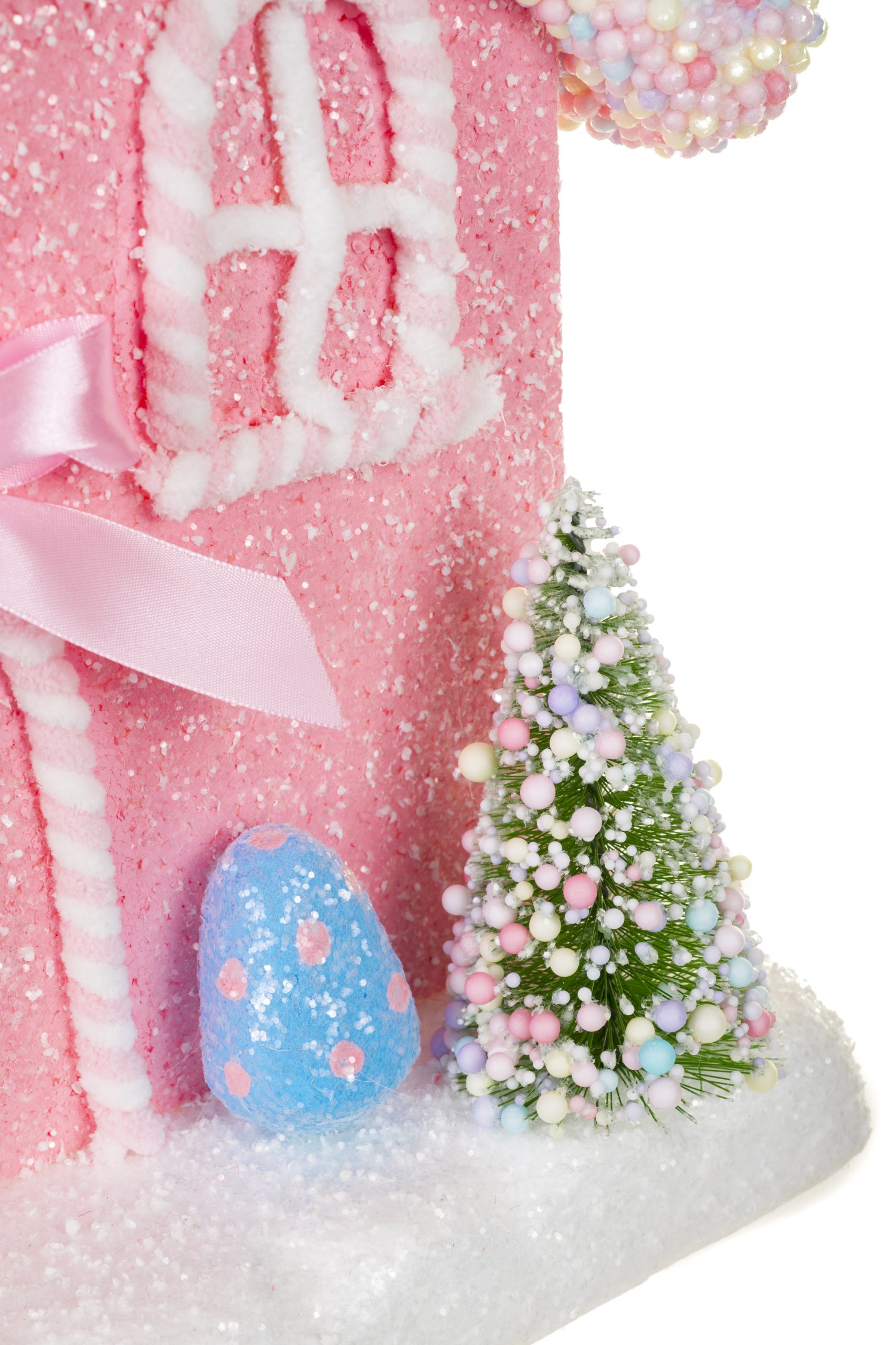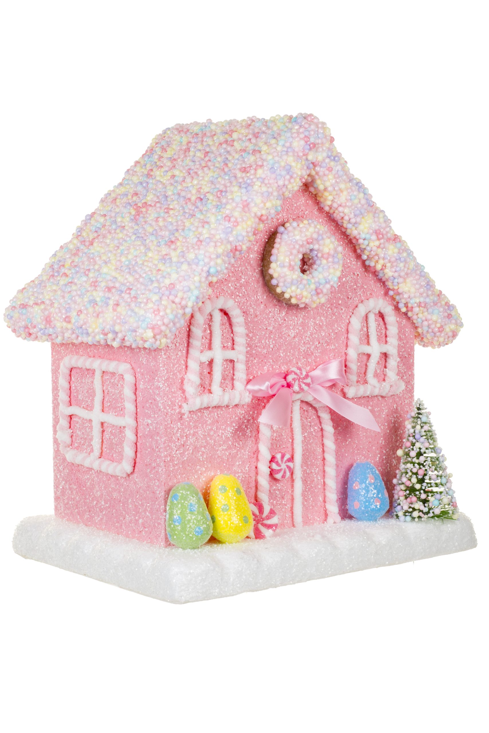 • Description: 15.75" Glittery Baby Pink and White Foam Candy House Decoration with Gum Ball Roof & Mini Eggs