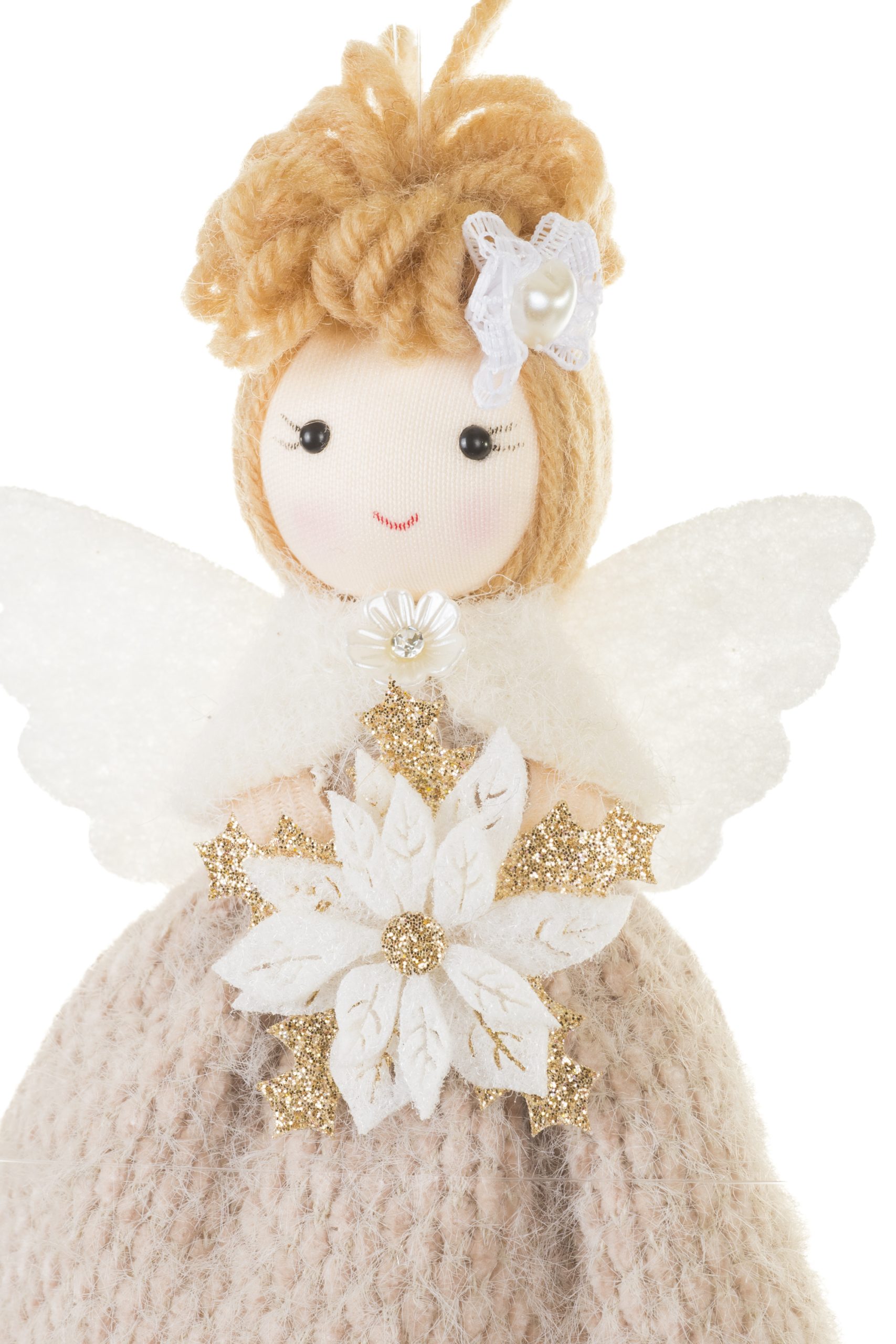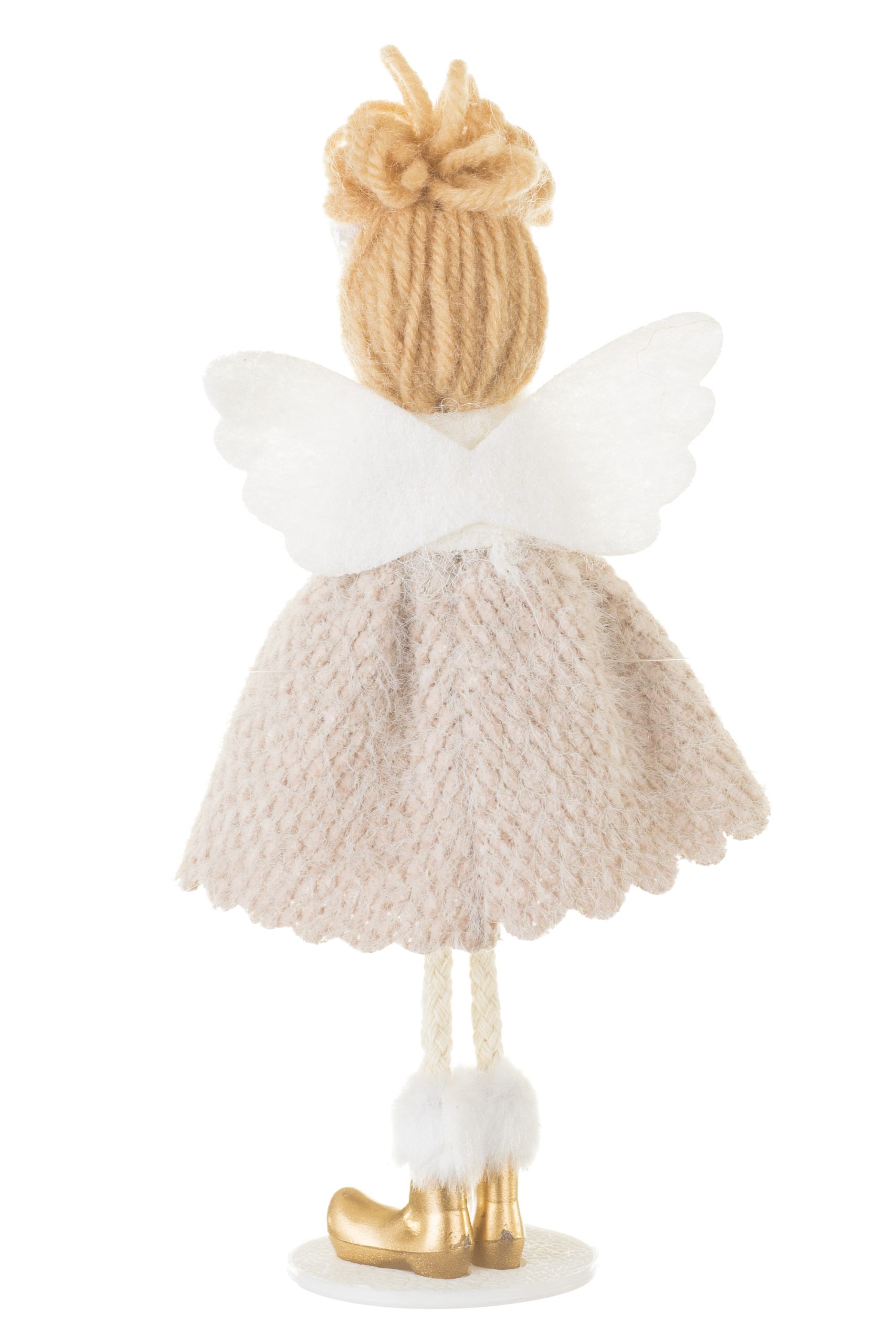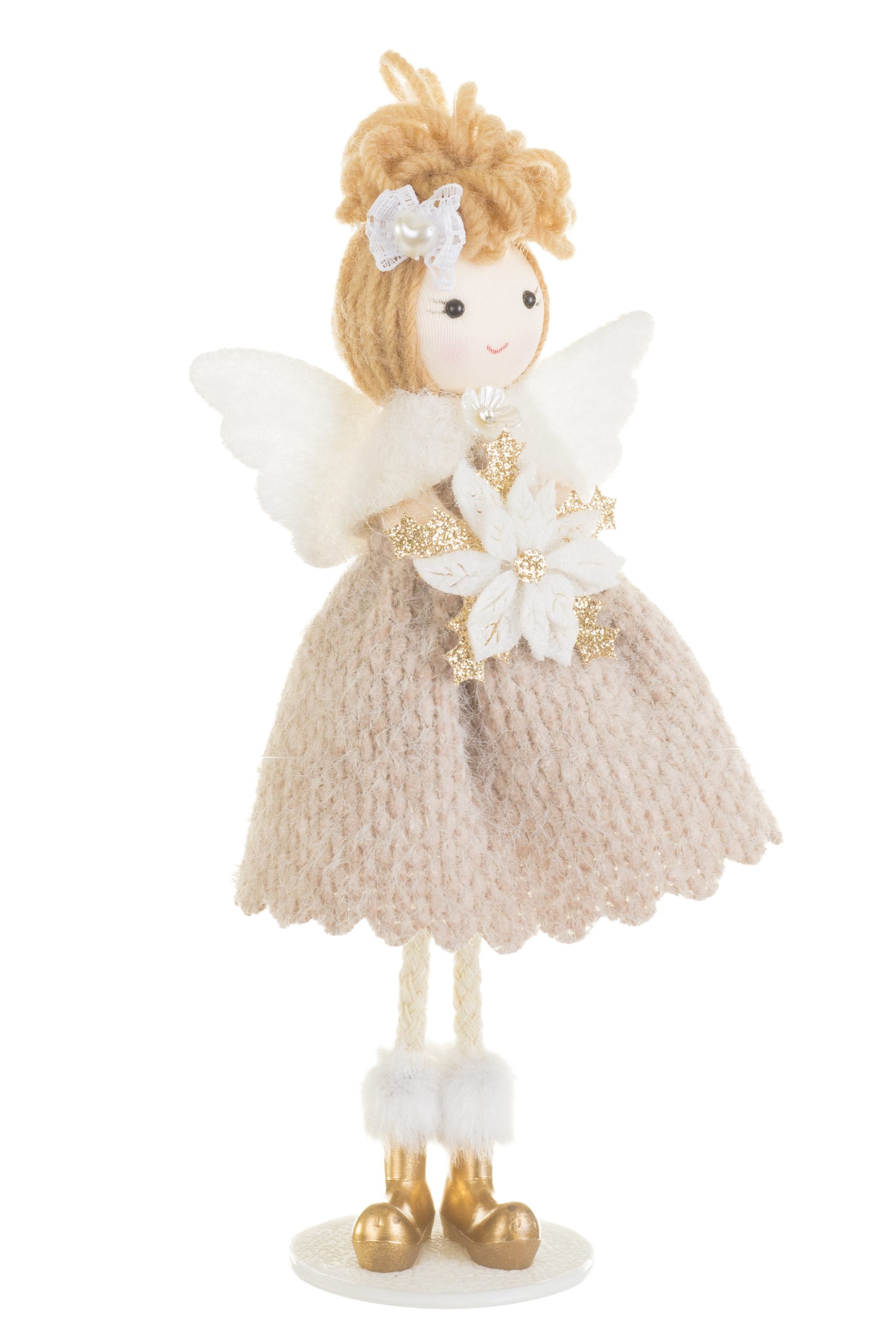• Description: 7.8" Beige and White Fabric Angel Ornament with Plastic Base & Poseable Legs