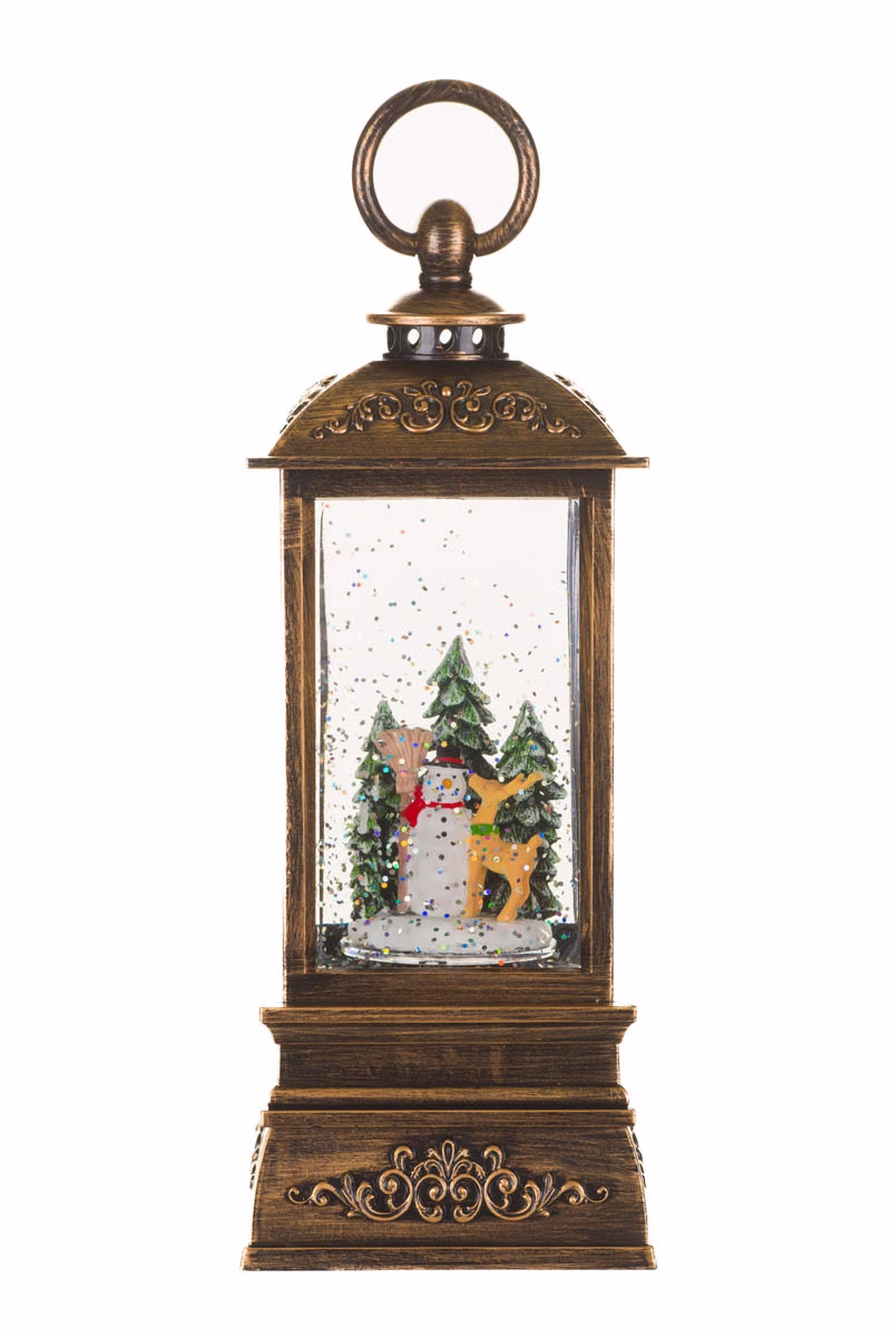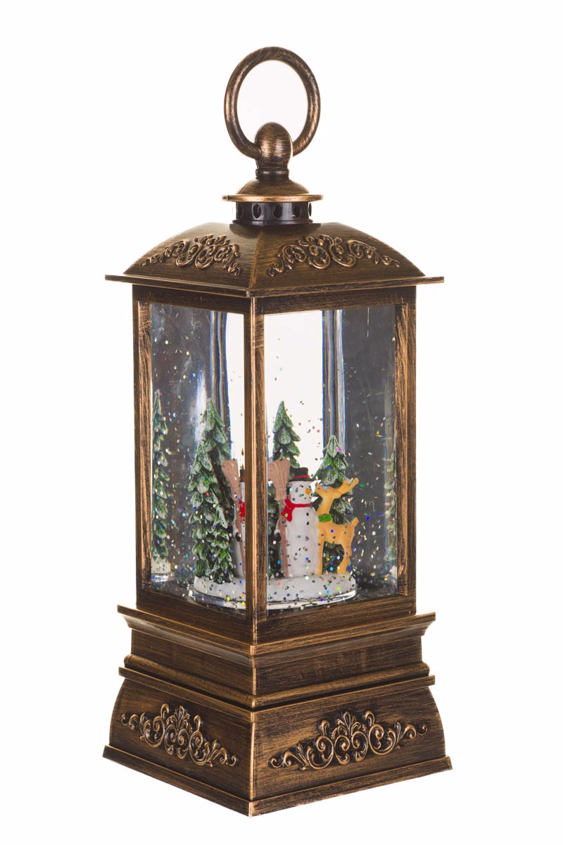 ? Description: 9.25" Musical Bronze Plastic Lantern Warm White LED Snow Globe with Snowman & Penguin
