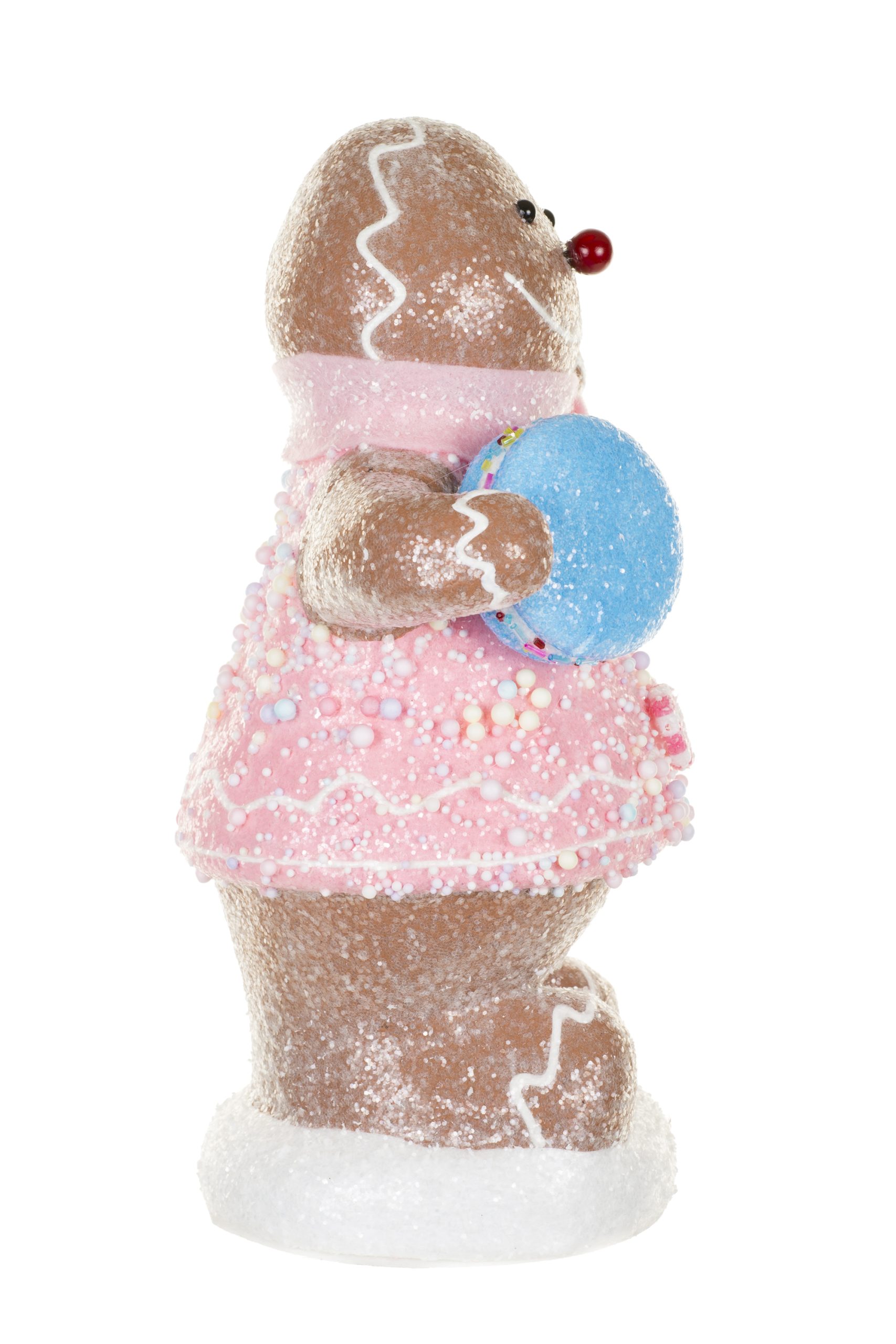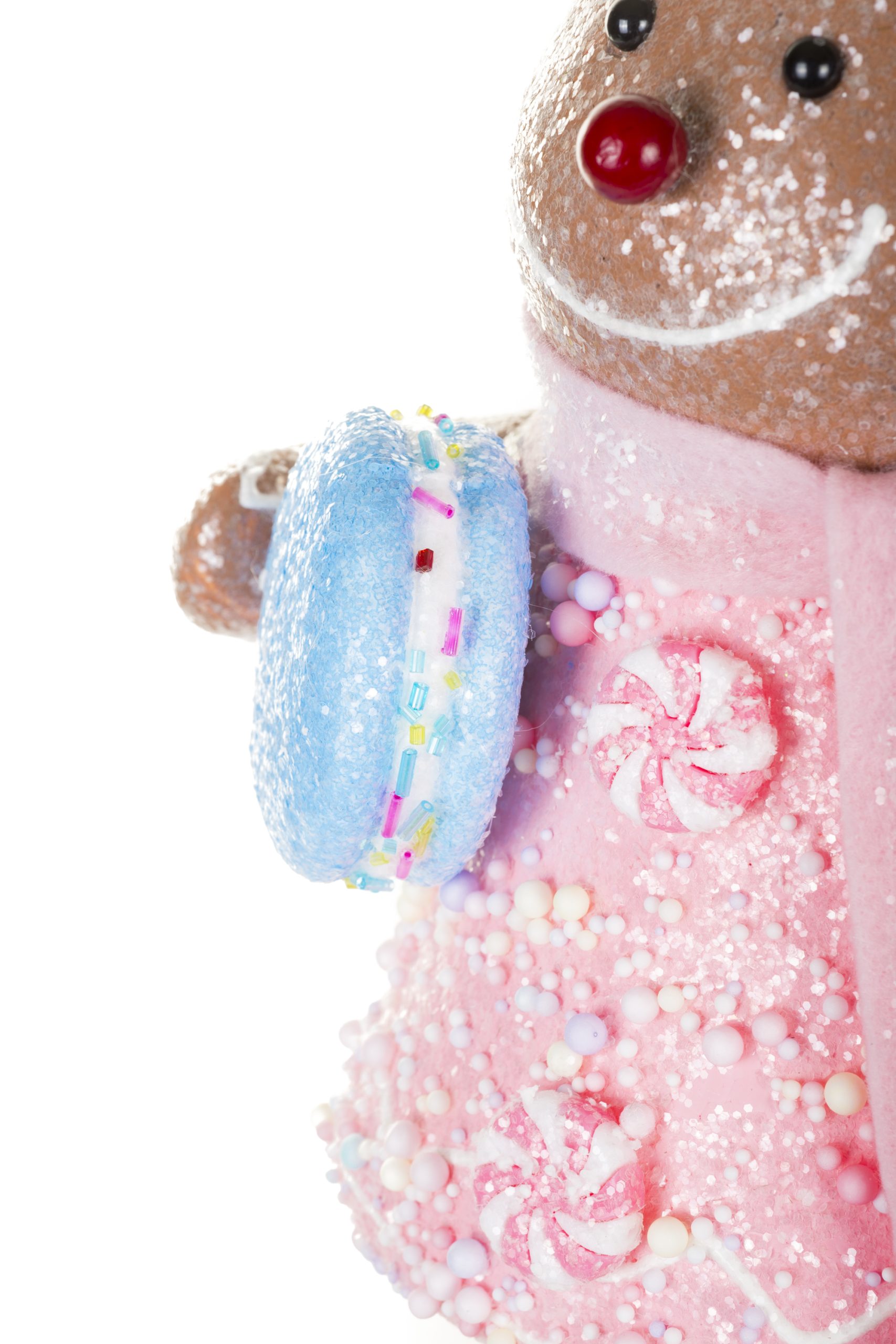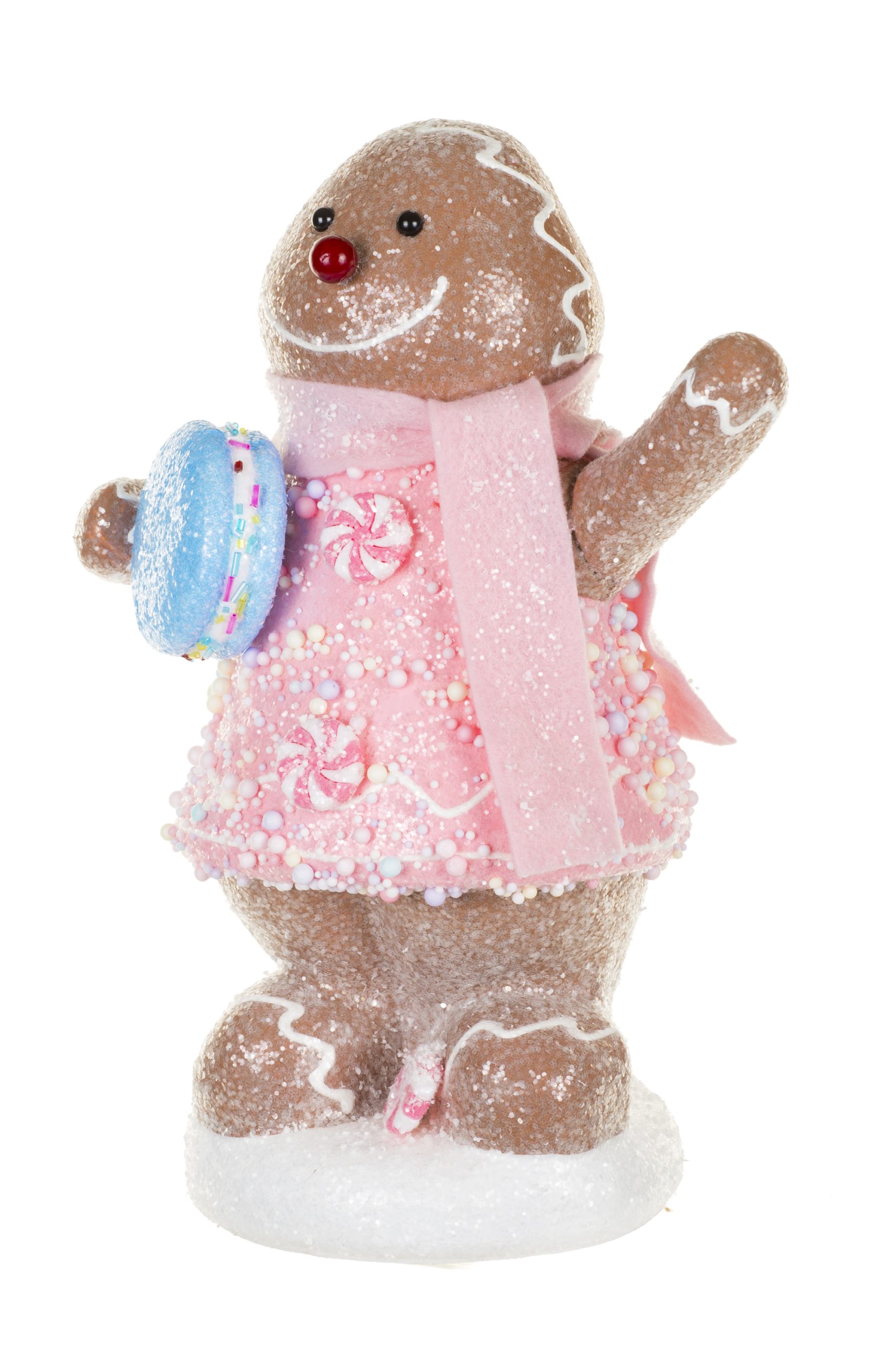 • Description: 11.75" Brown and Pink Foam Bald Gingerbread Girl Figurine with Candy Dress & holding Macaroon