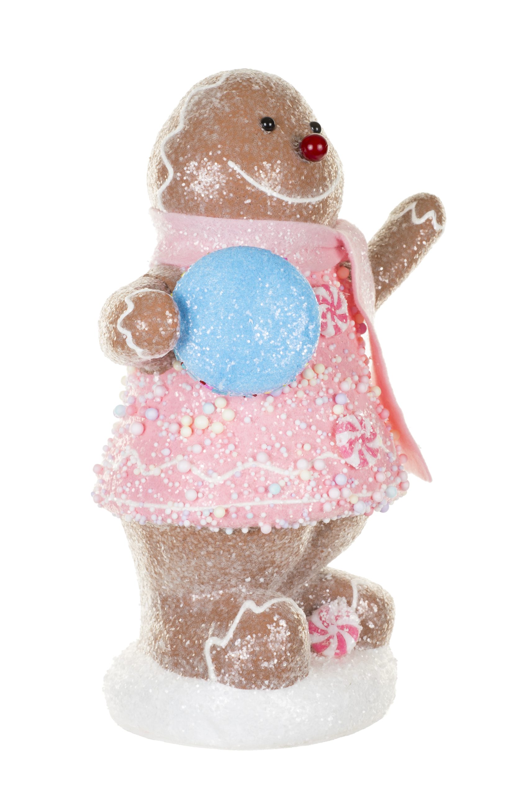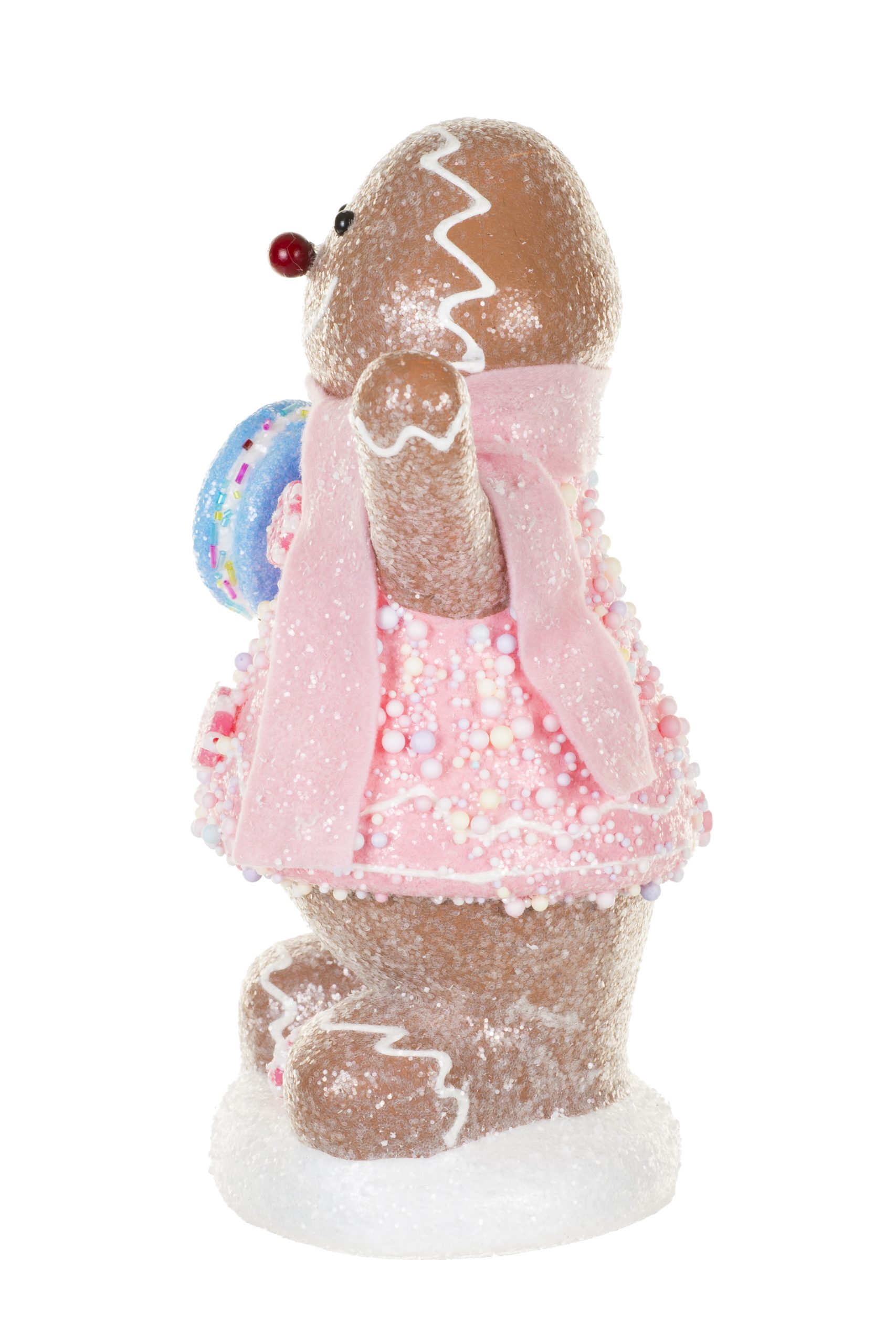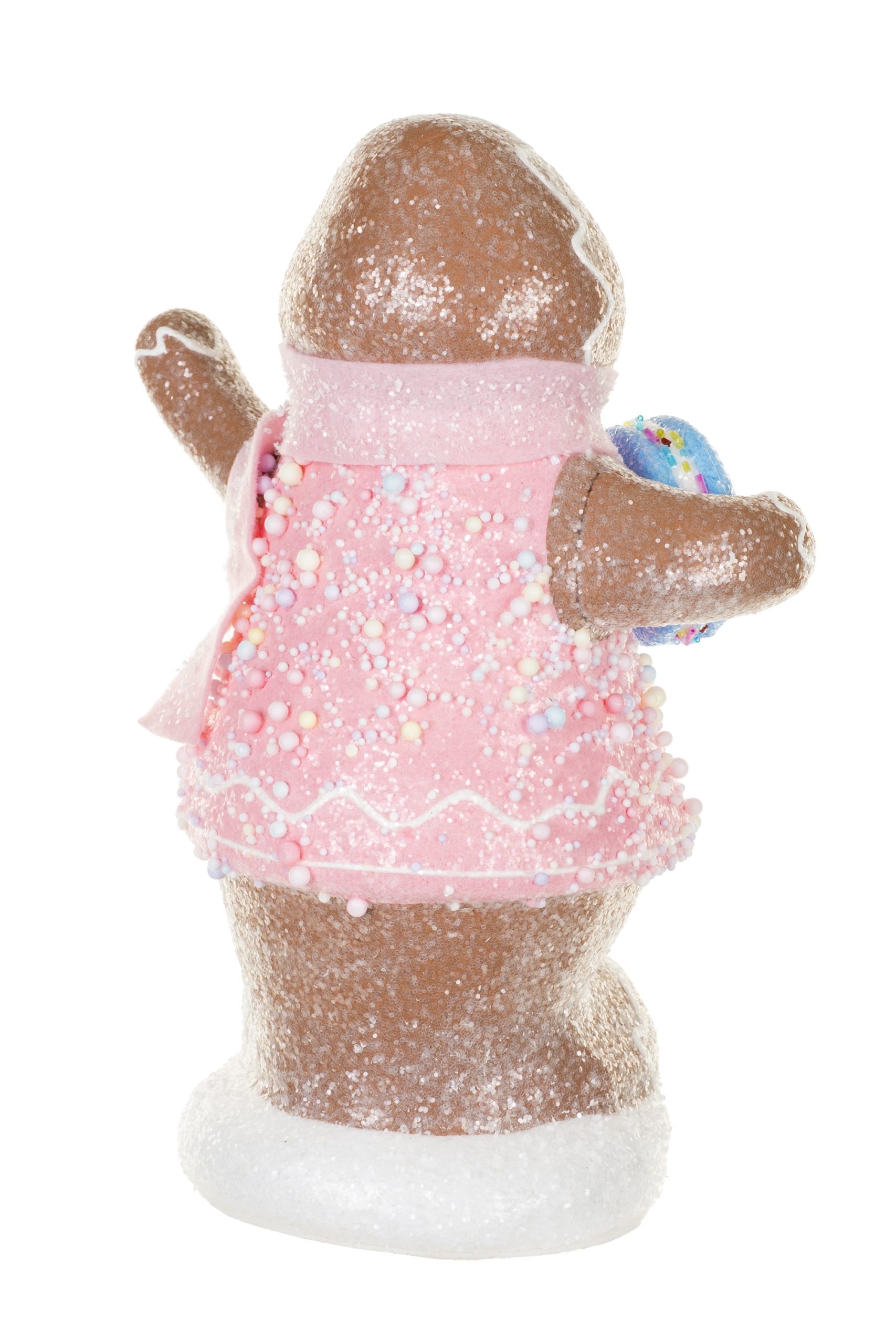 • Description: 11.75" Brown and Pink Foam Bald Gingerbread Girl Figurine with Candy Dress & holding Macaroon
