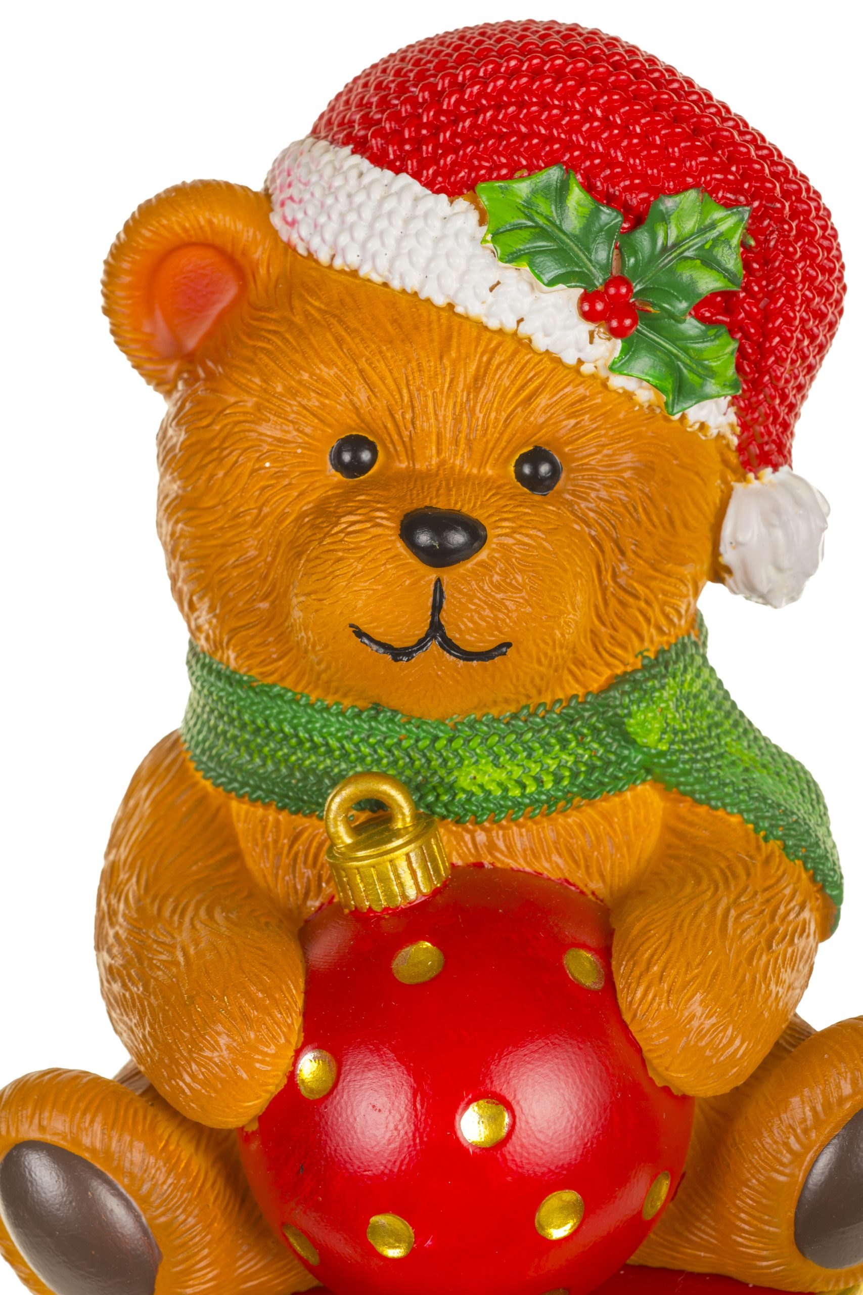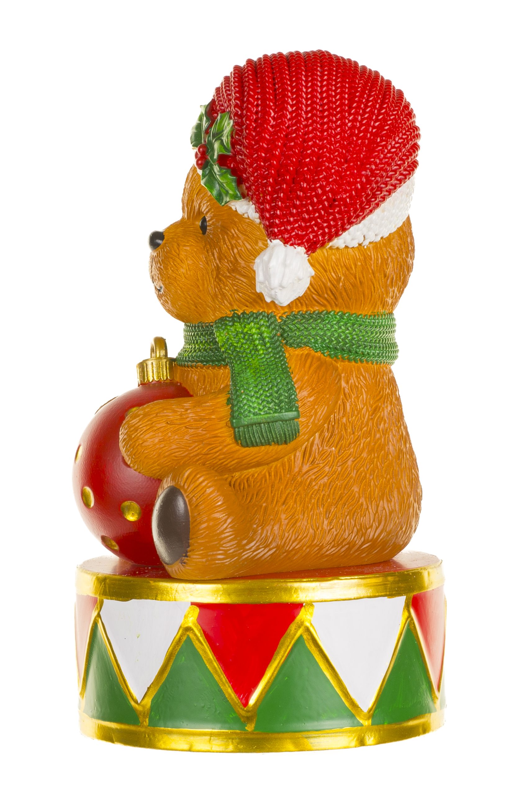 • Description: 7.68" Brown and Red Plastic Peppy Teddy Warm White LED Figurine Sitting on Drum Snare & holding Red Bauble