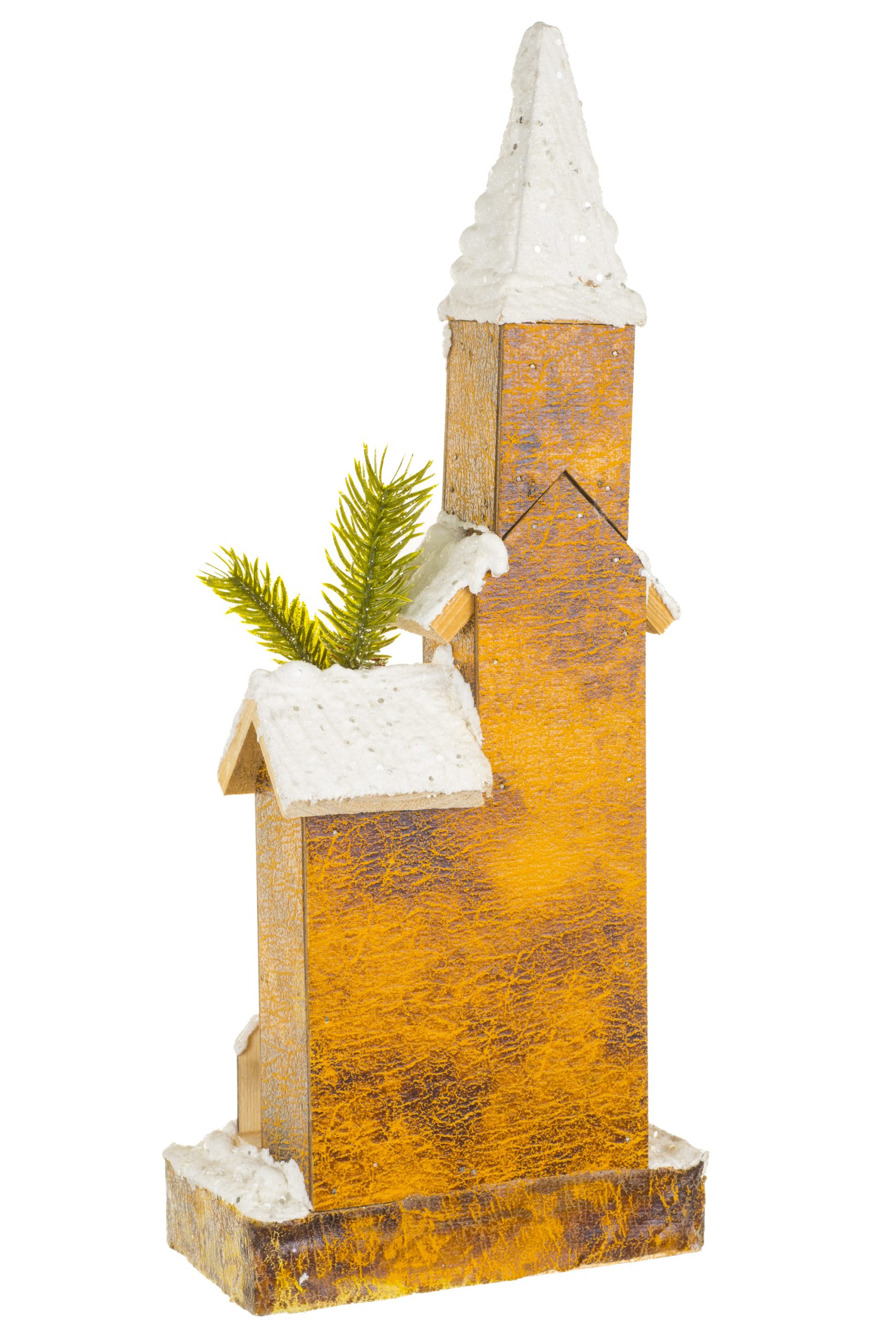 • Description: 16" Glittery Brown Wood Snowy Church Warm White LED Display with Frosty Windows