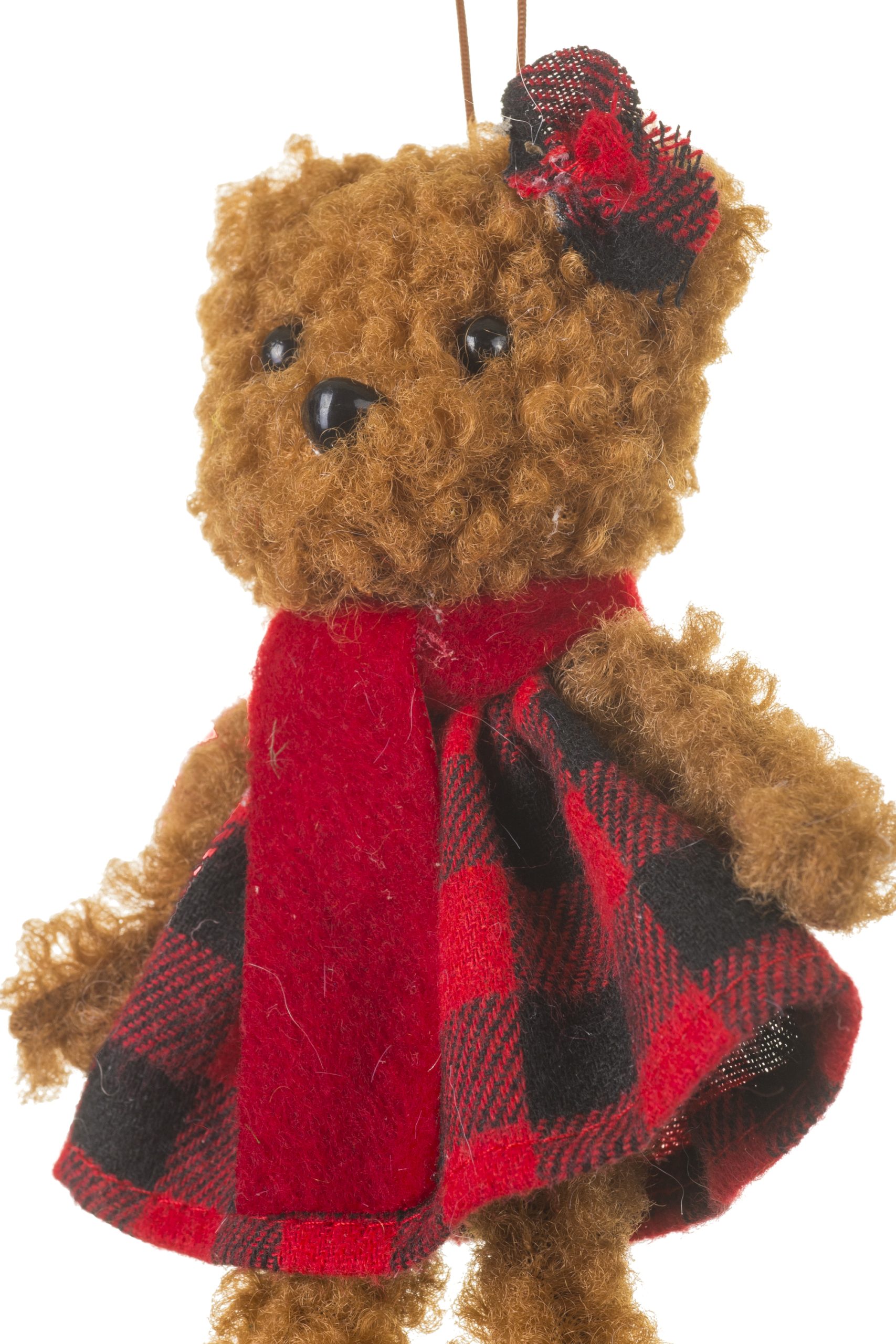 • Description: 5.5" Brown and Red Fabric Plush Teddy Bear Ornament with Red & Black Plaid Head Bow & Red Scarf