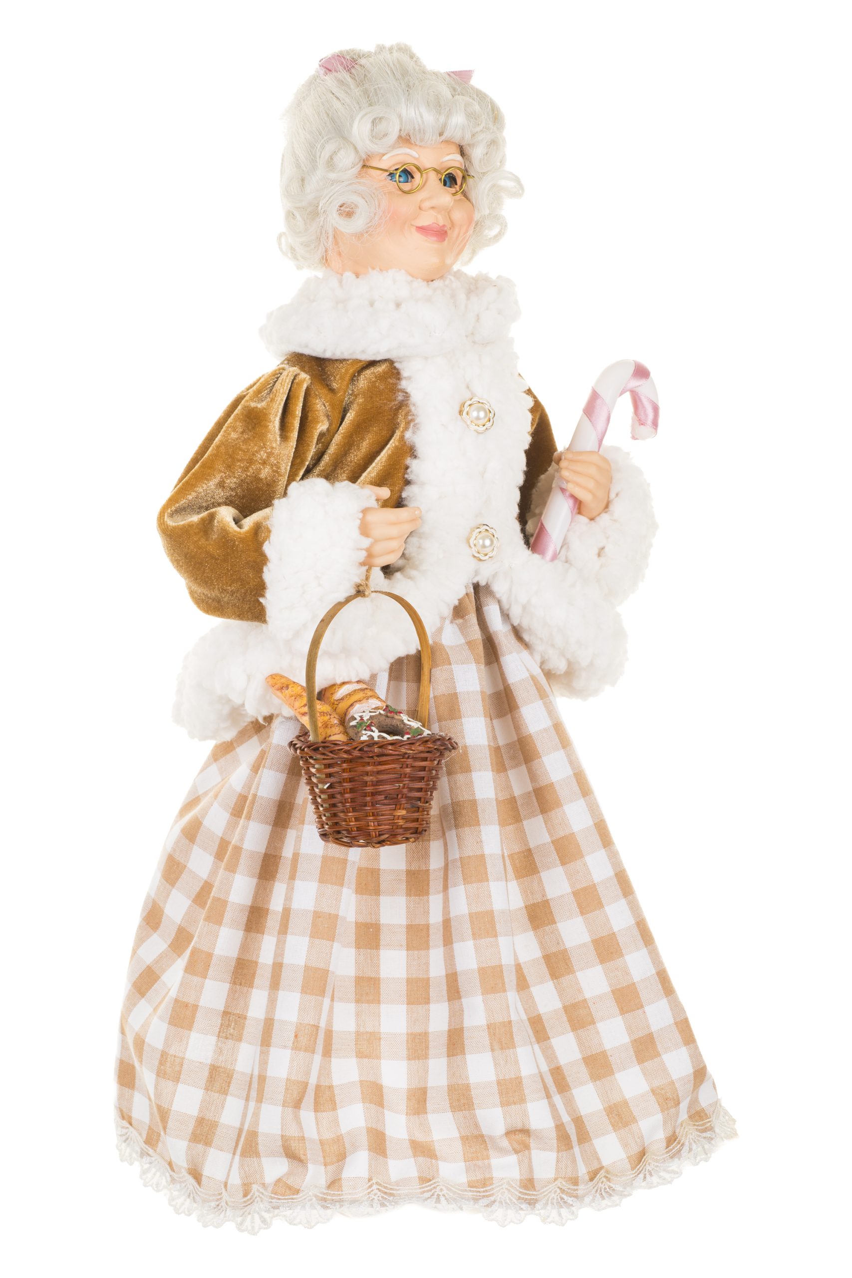 • Description: 18" Gingham Caramel Fabric Gingerbread Mrs. Claus Figurine with Baked Treats