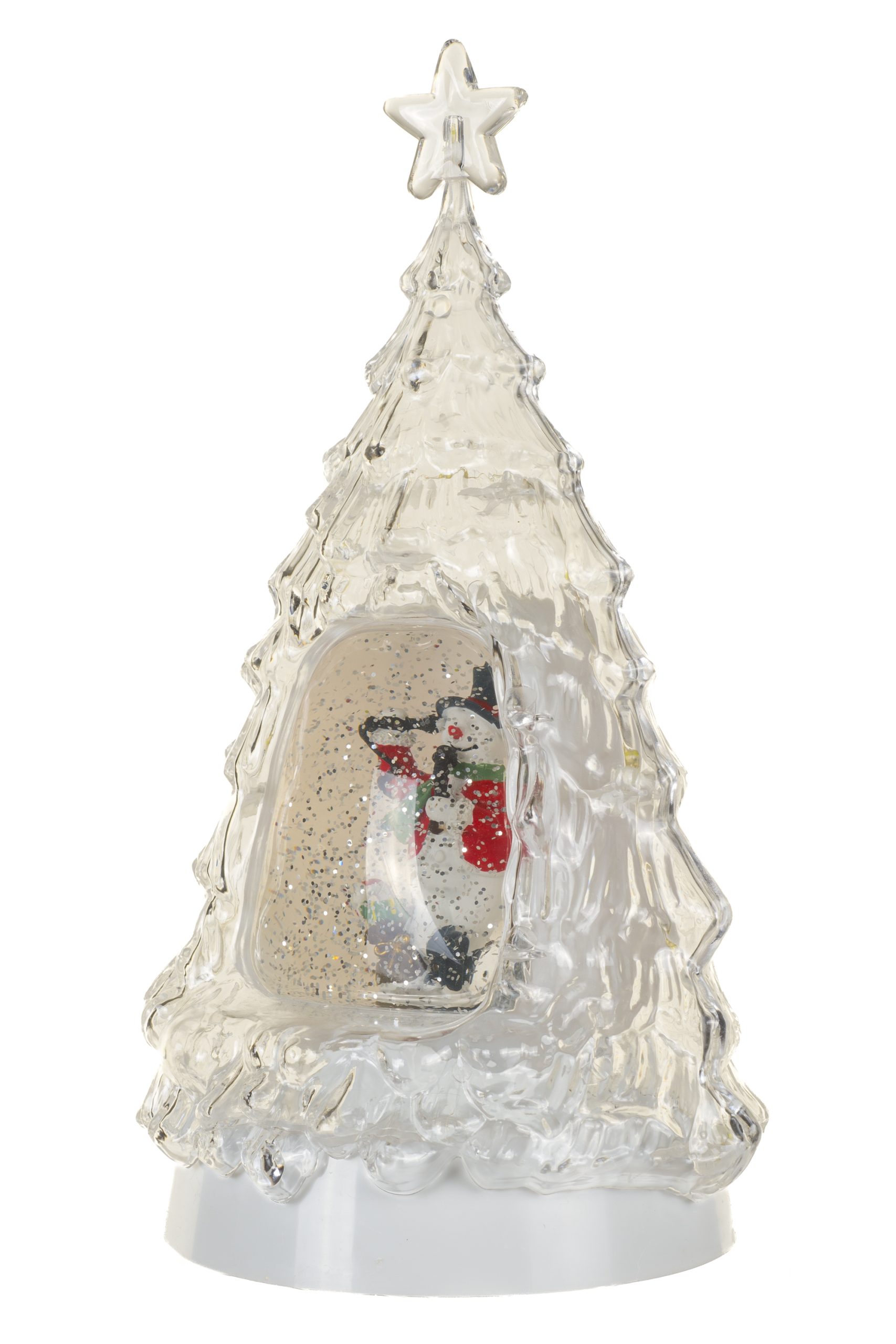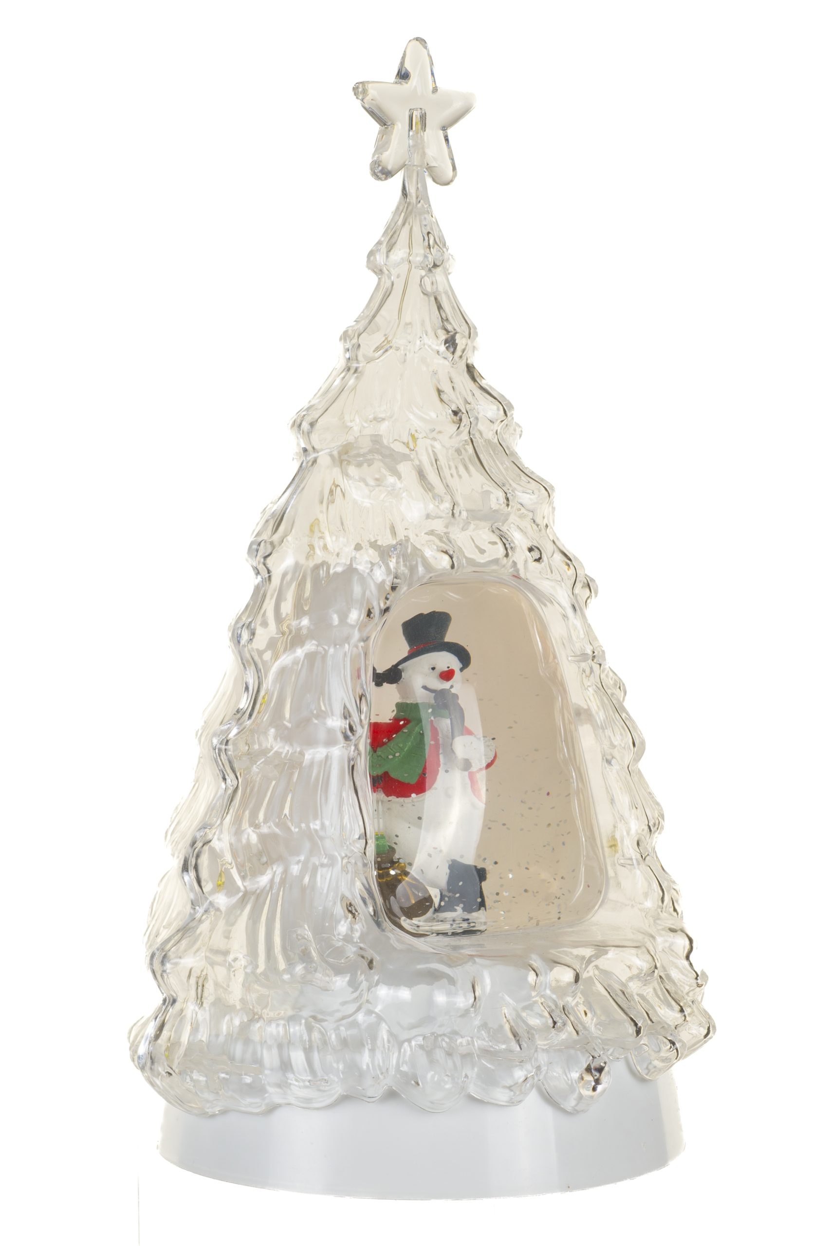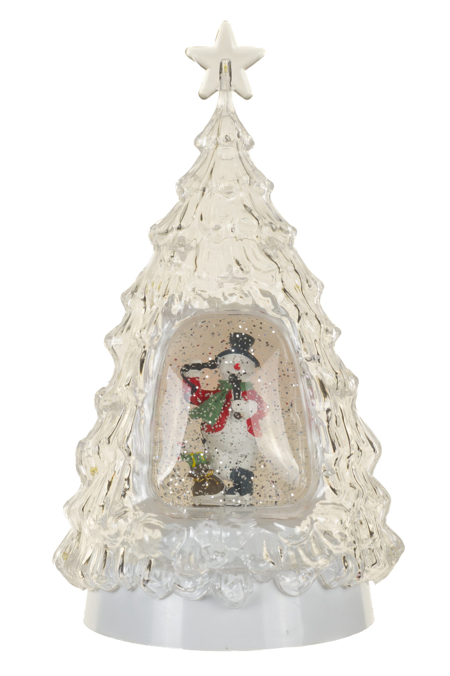 • Description: 13" Glittery Clear Plastic Tree Cool White LED Snow Globe with Snowman