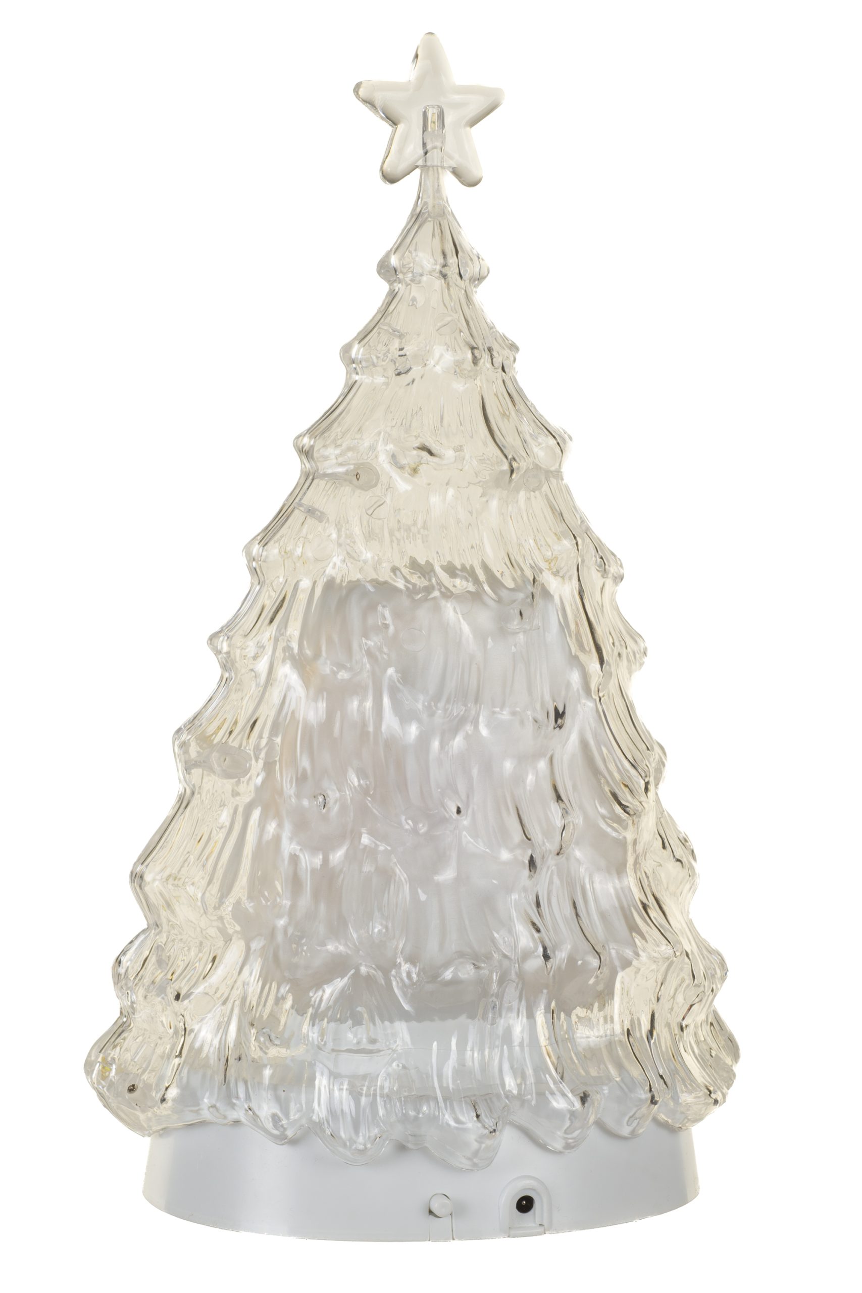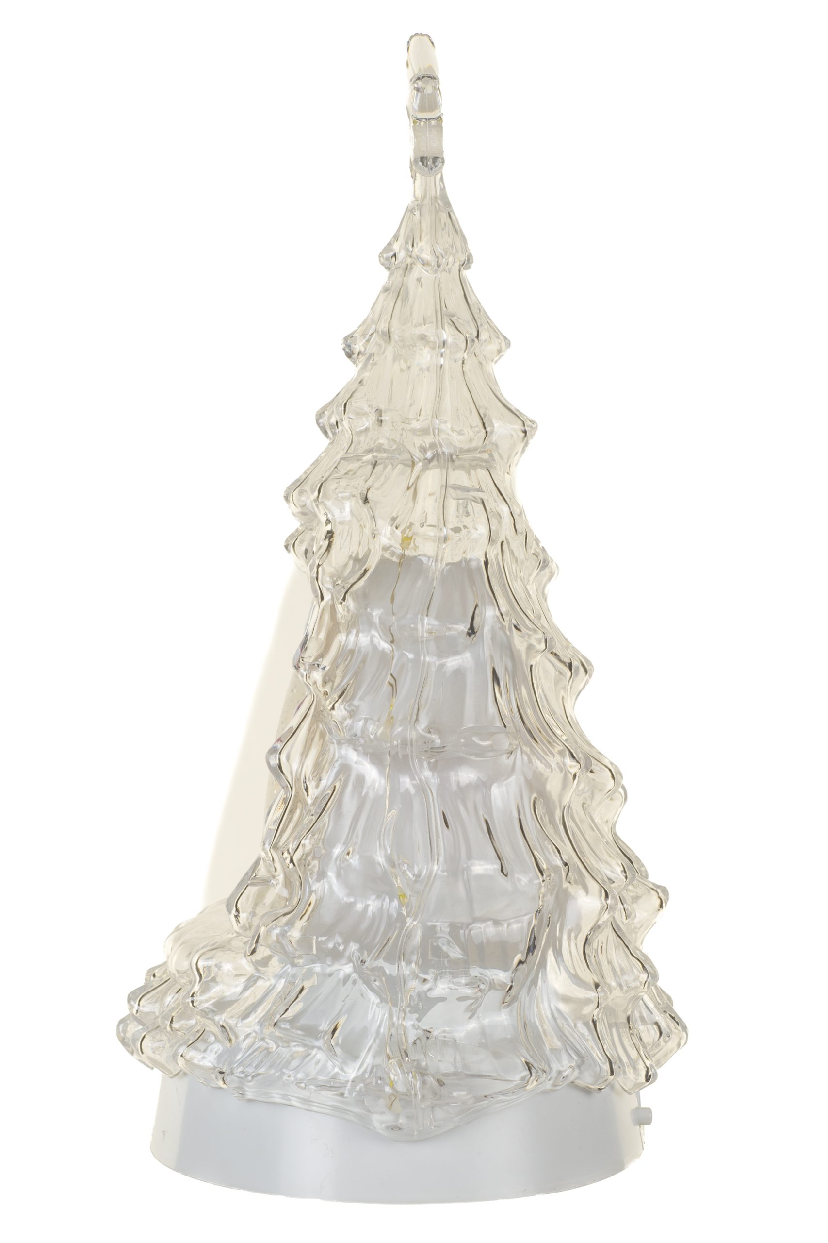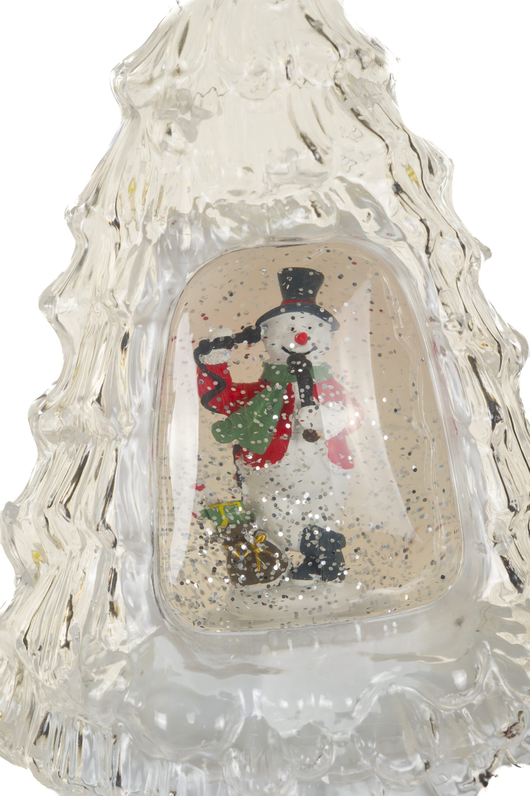 • Description: 13" Glittery Clear Plastic Tree Cool White LED Snow Globe with Snowman