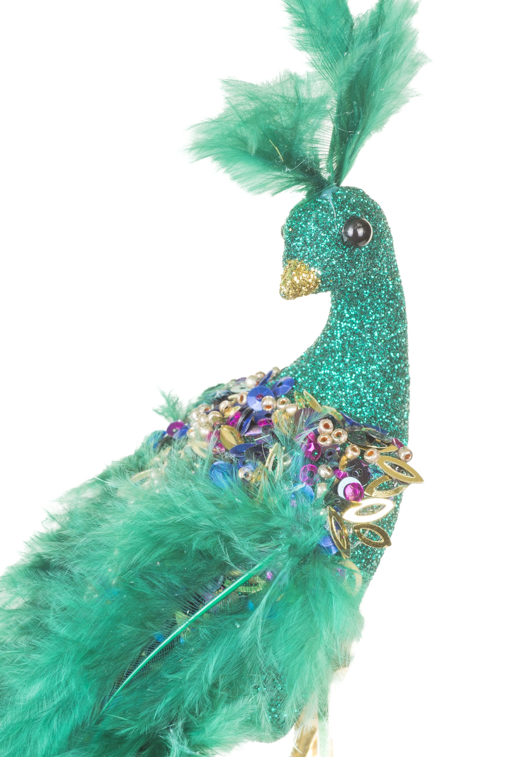 • Description: 12" Glittery Clip-on Teal Styrofoam Peacock Ornament with Feathers & Sequined Back