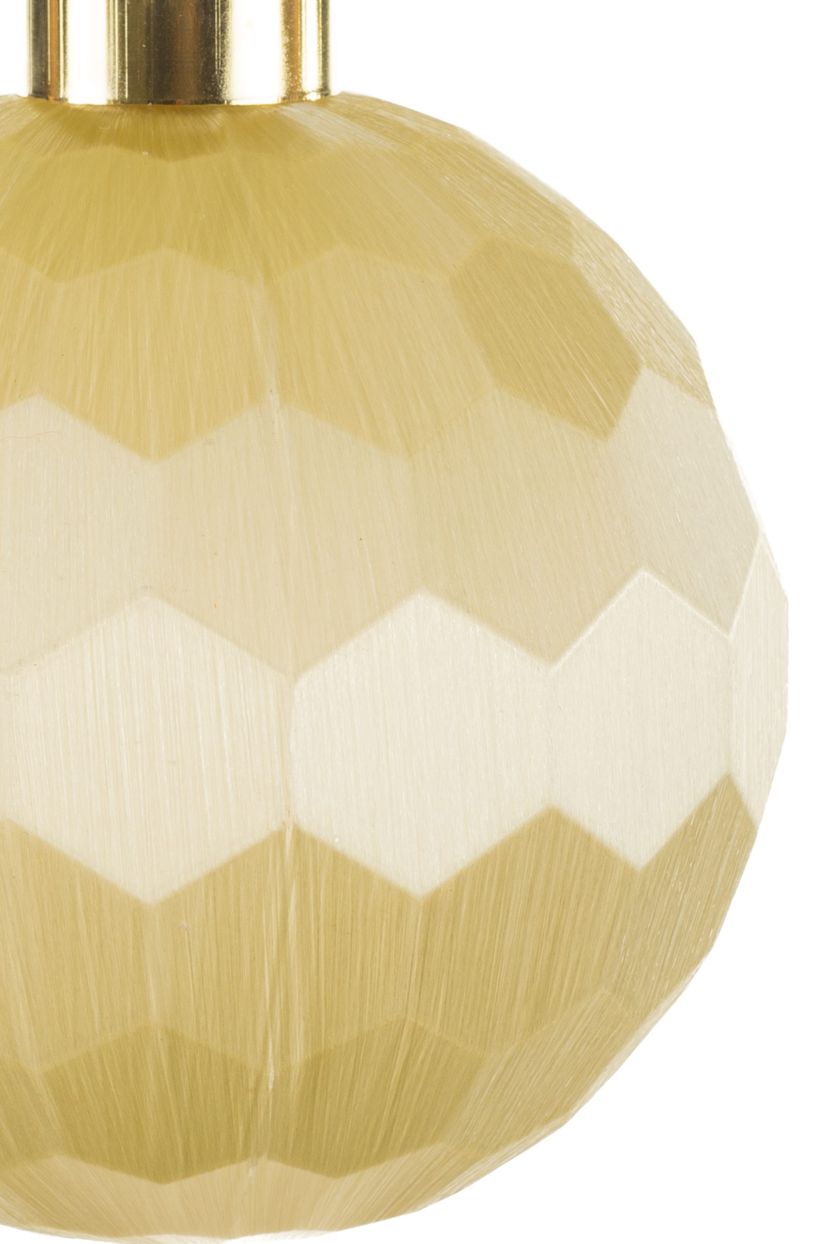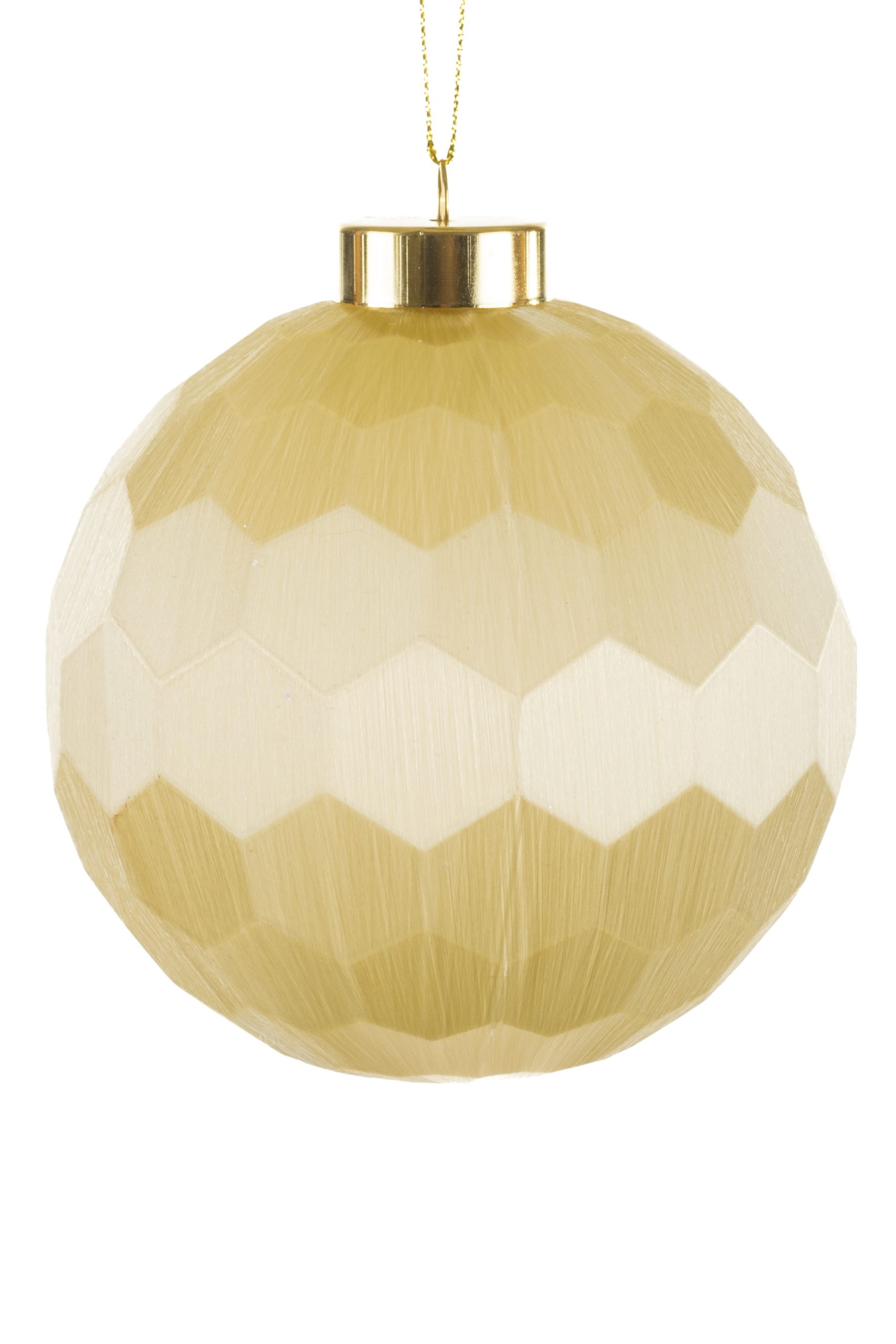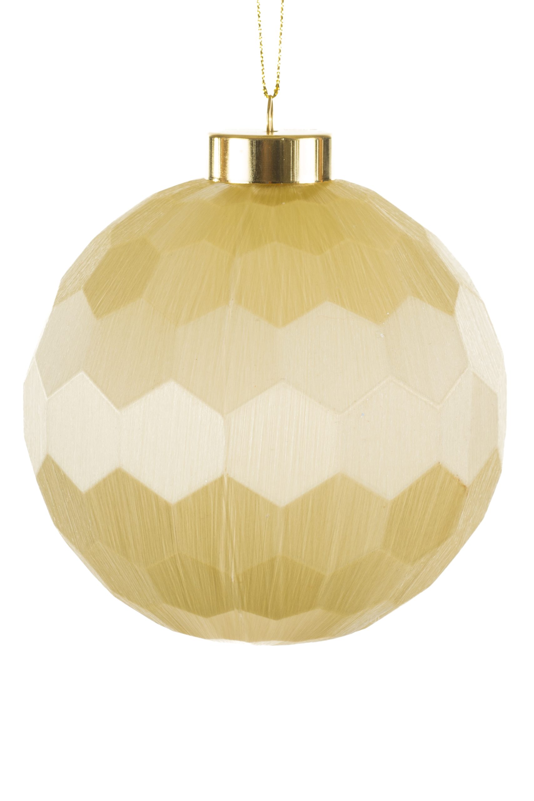 • Description: 4" Hanging Geometric Cream Plastic Ball Ornament with Gold Ornament Cap