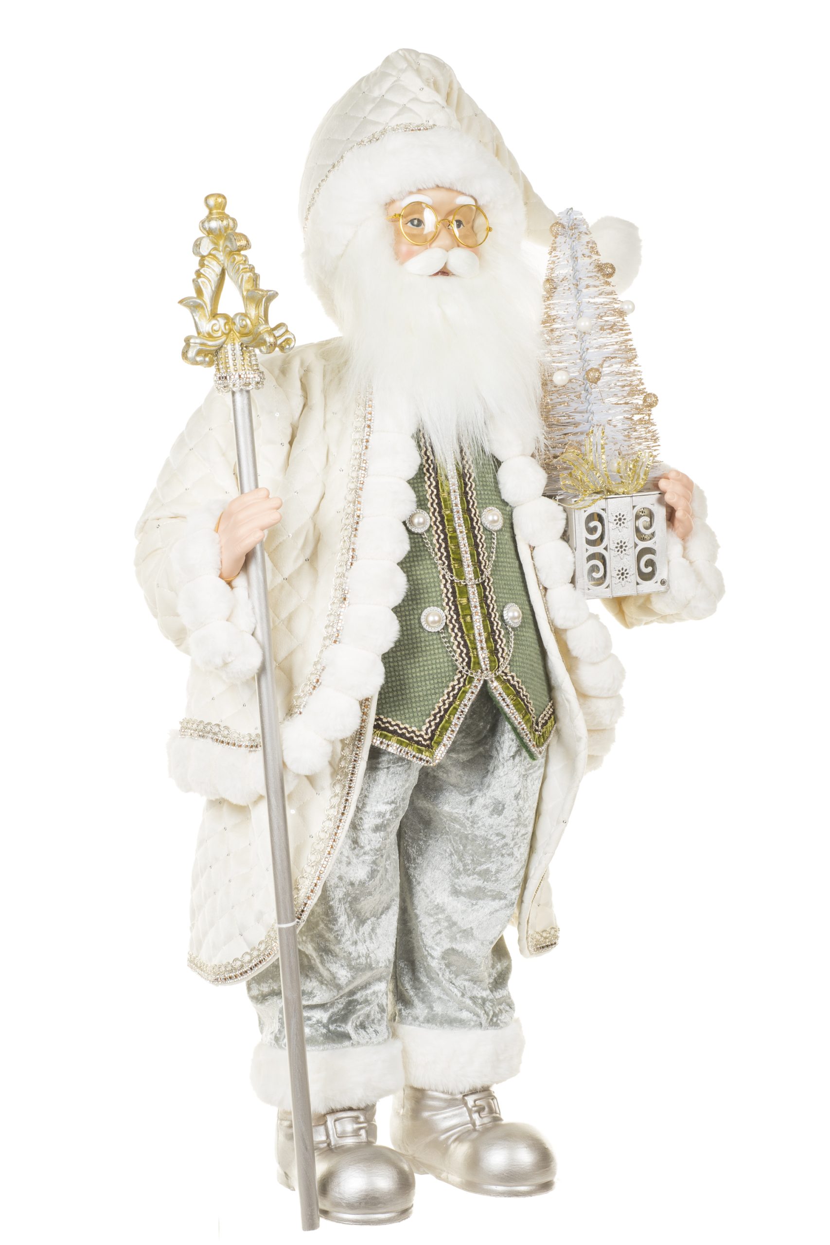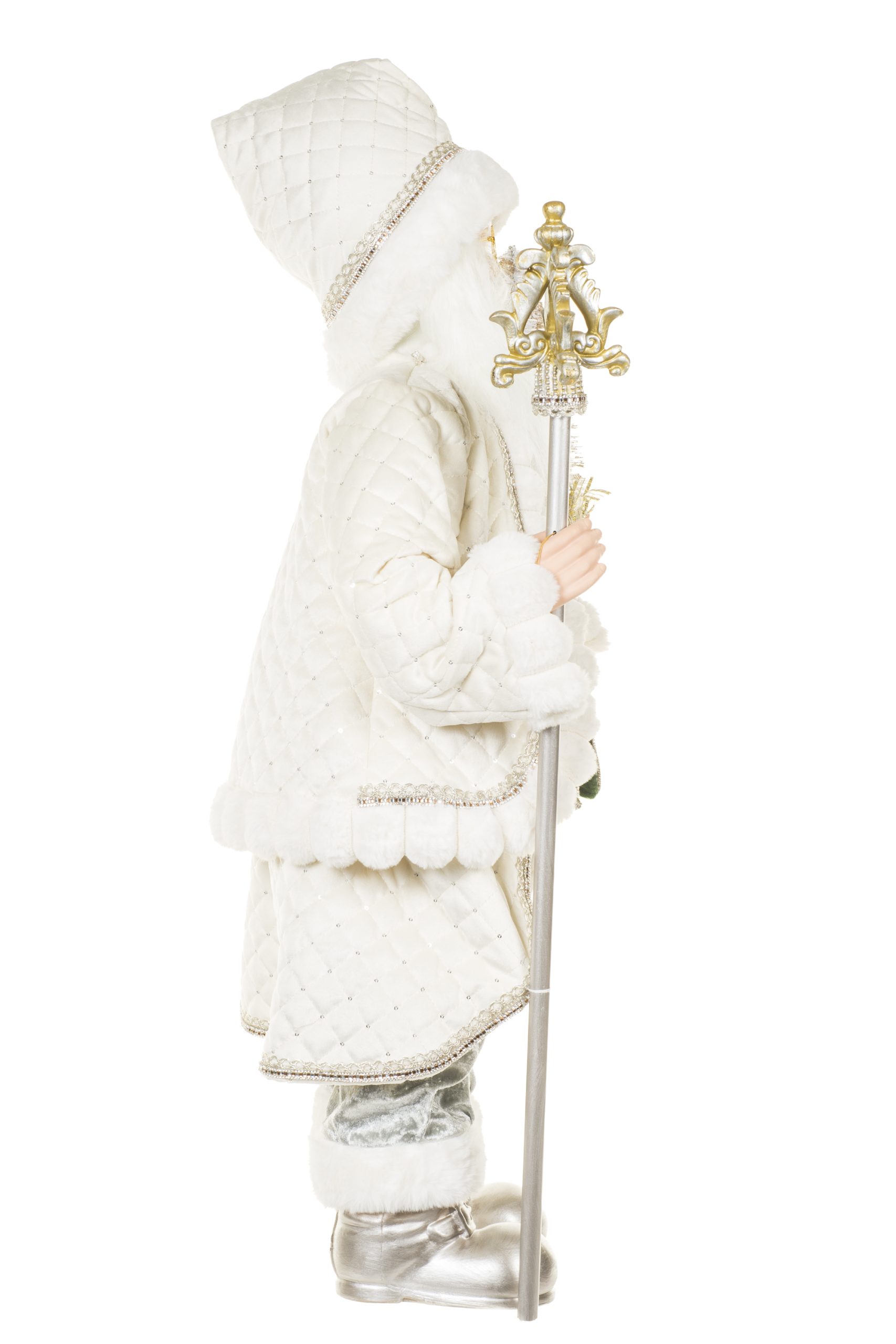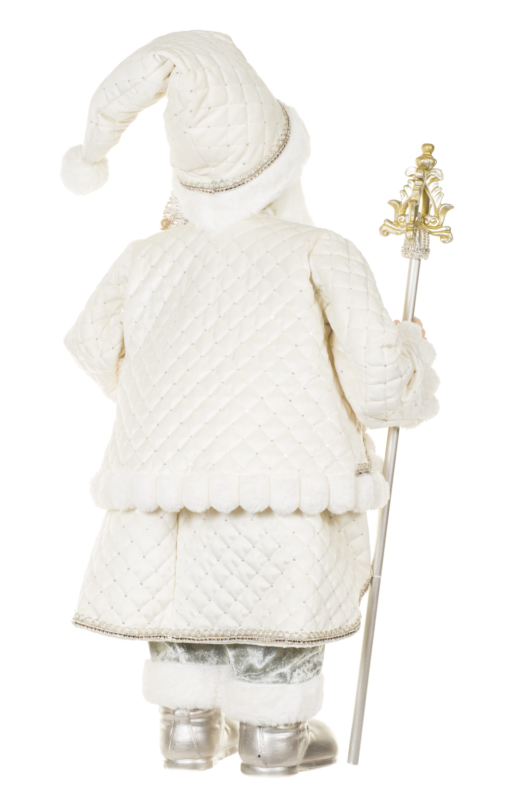 • Description: 36" Cream and Silver Cloth Bedazzled Santa Figurine with Staff
