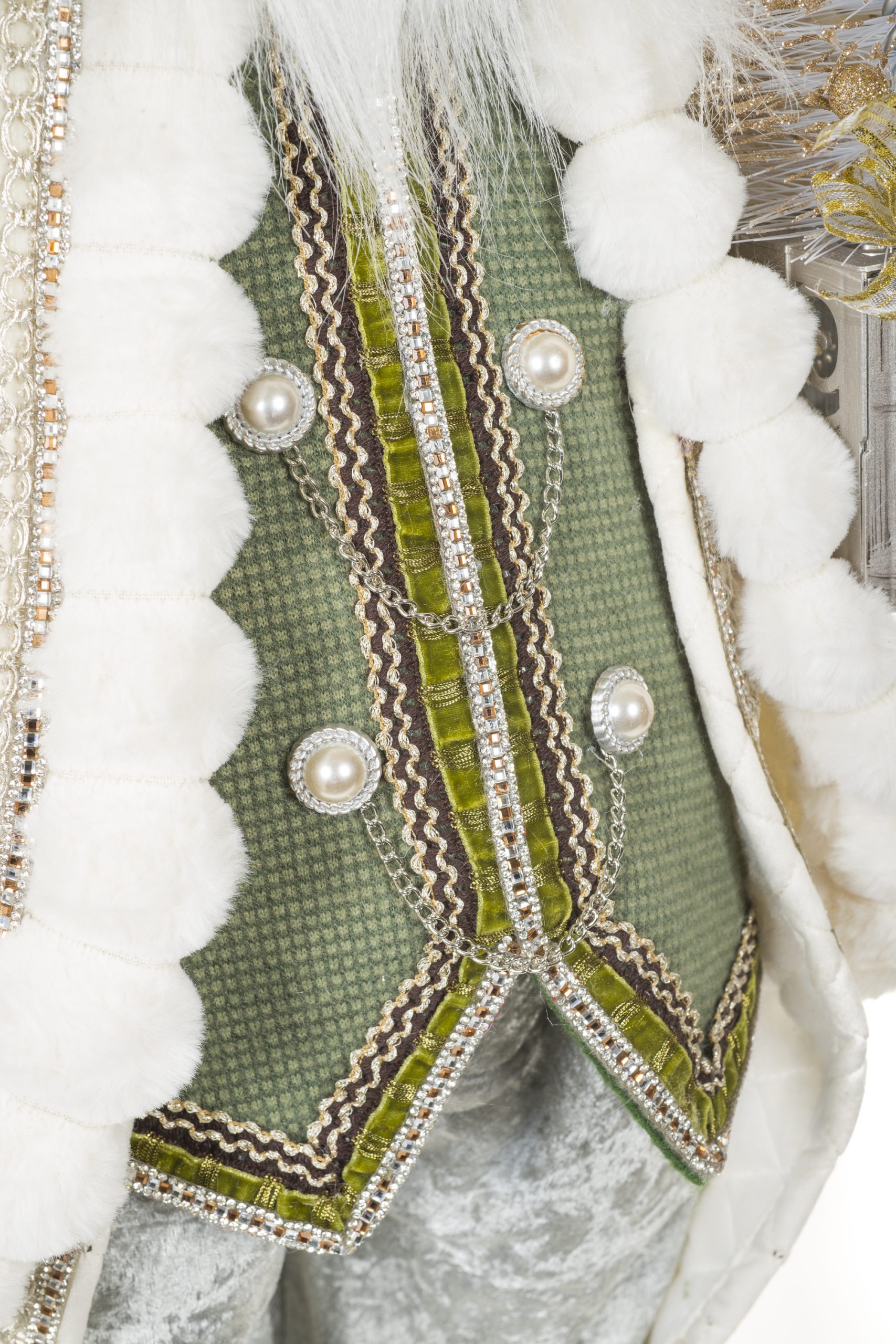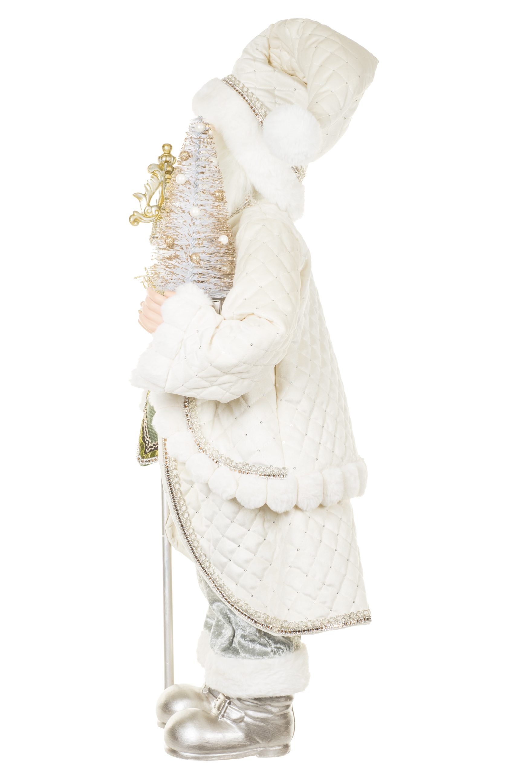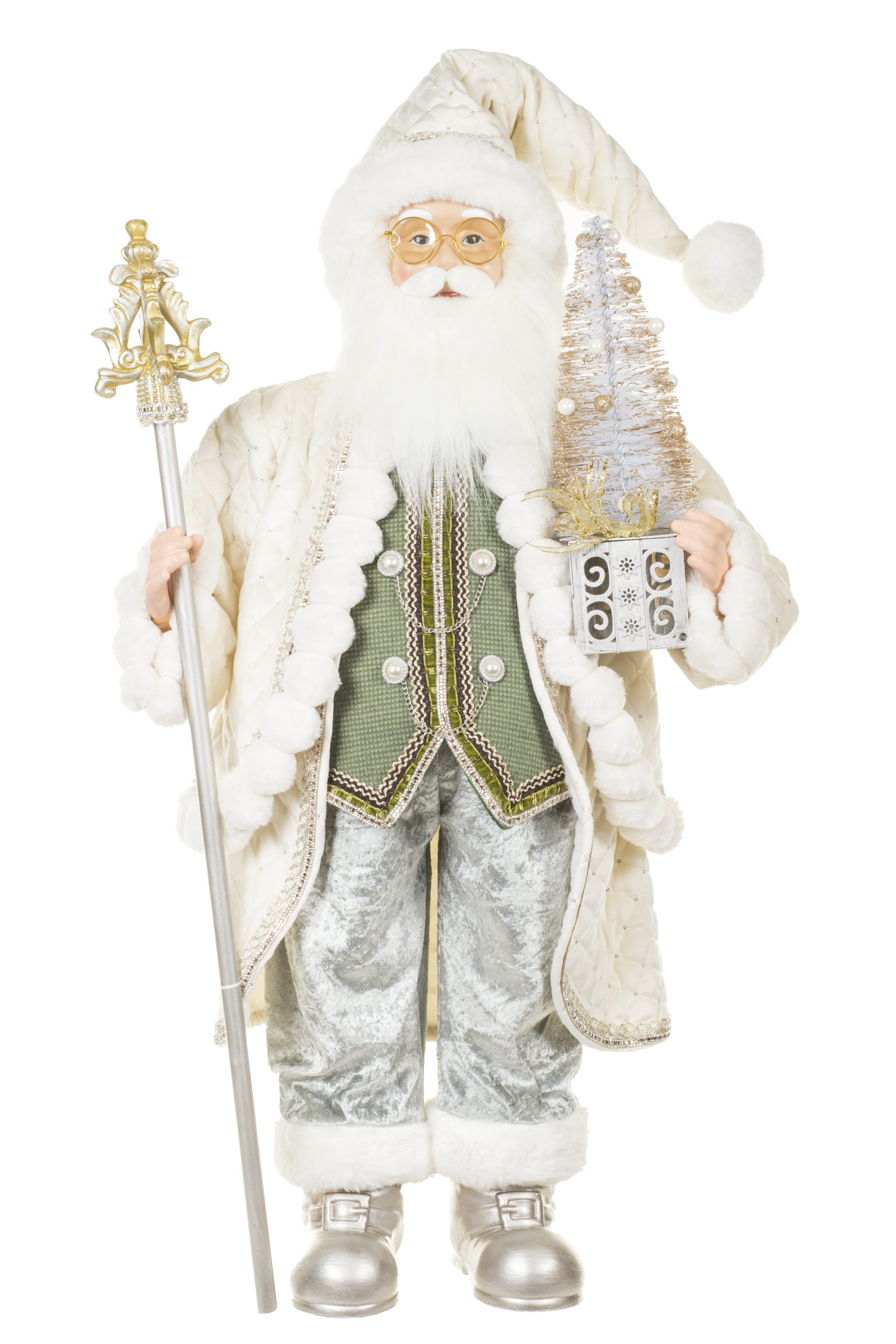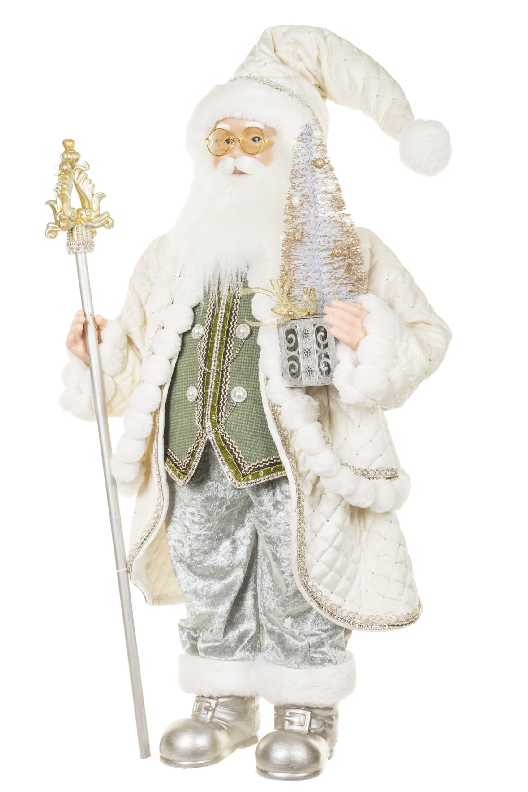 • Description: 36" Cream and Silver Cloth Bedazzled Santa Figurine with Staff