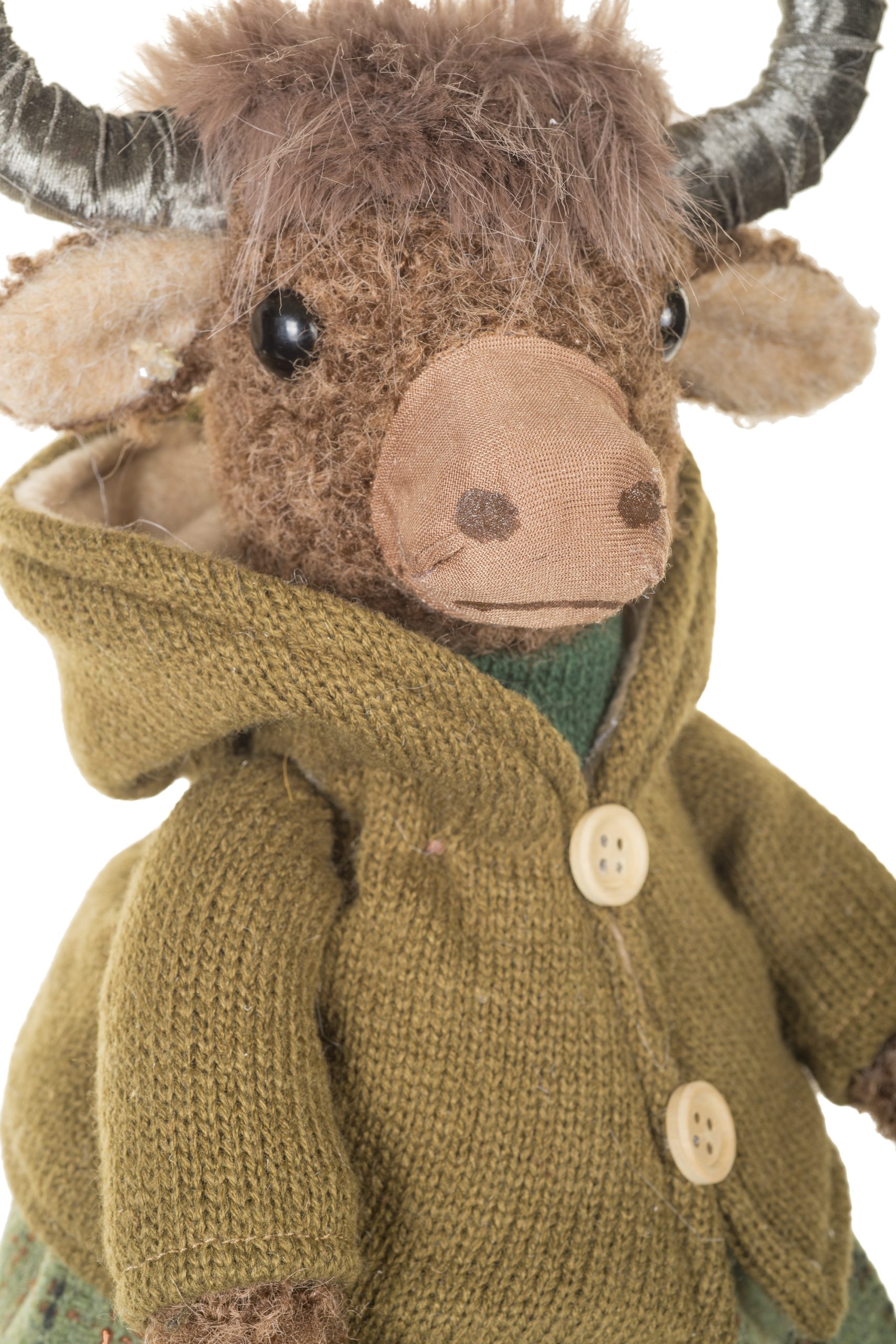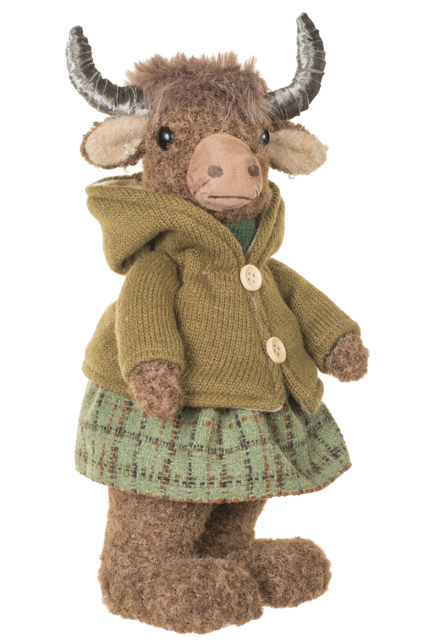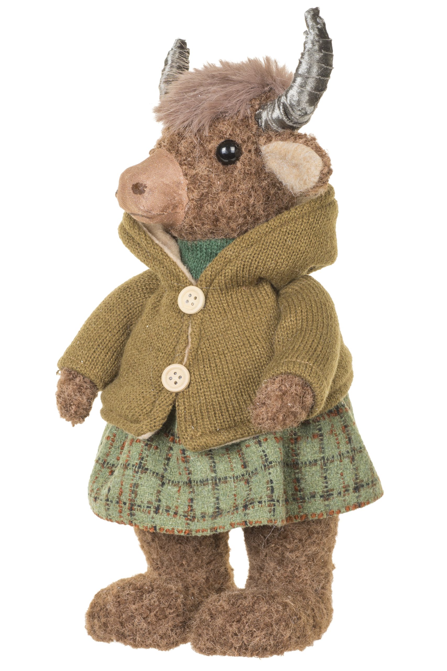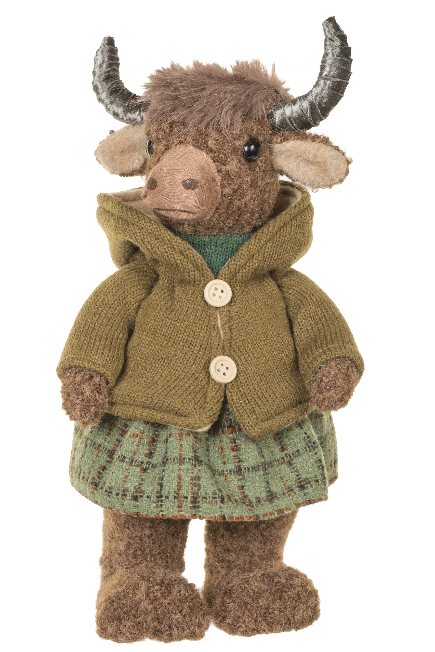 • Description: 13.18" Forest Green and Brown Fabric Cosy Bison Figurine Wearing Sweater & Skirt