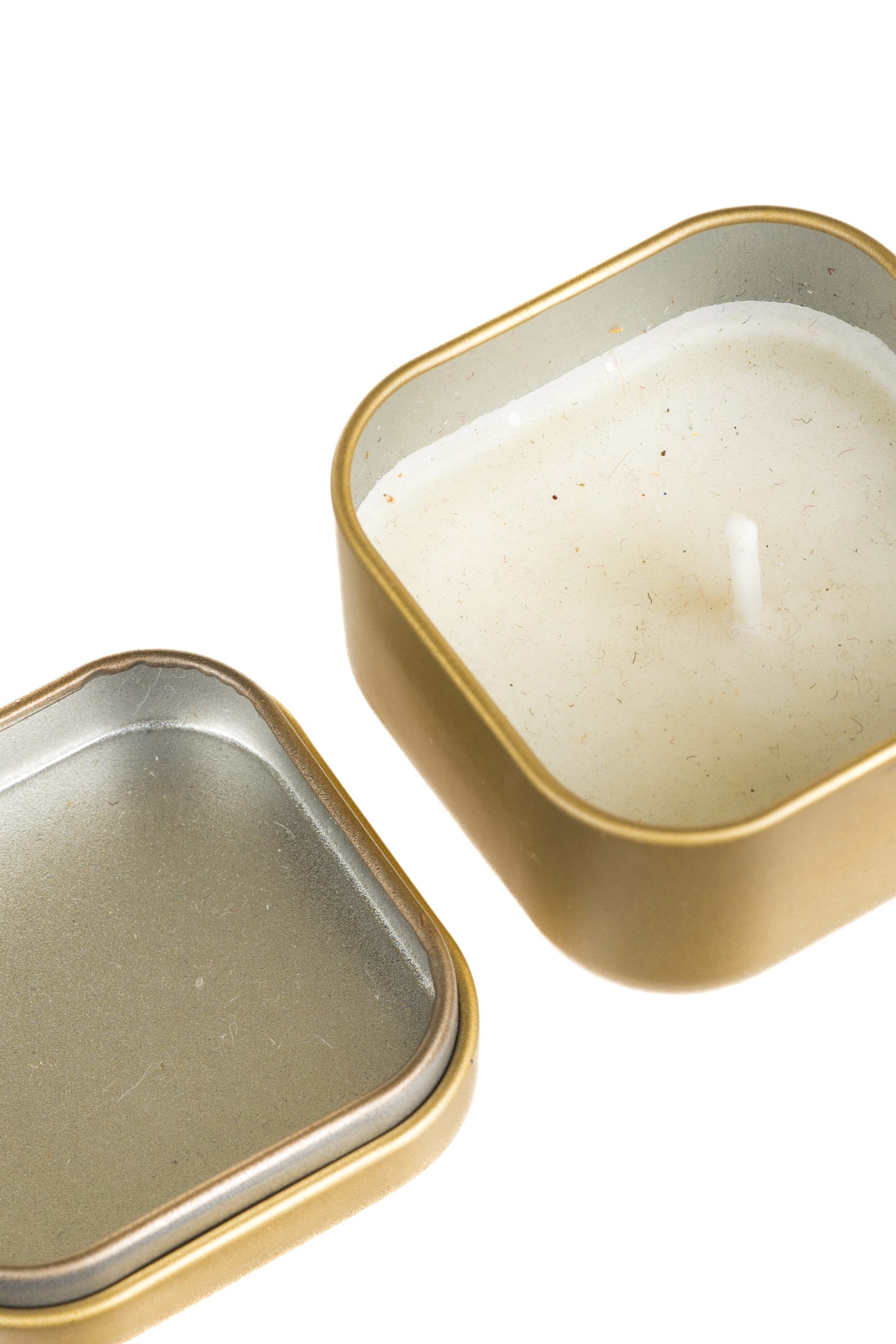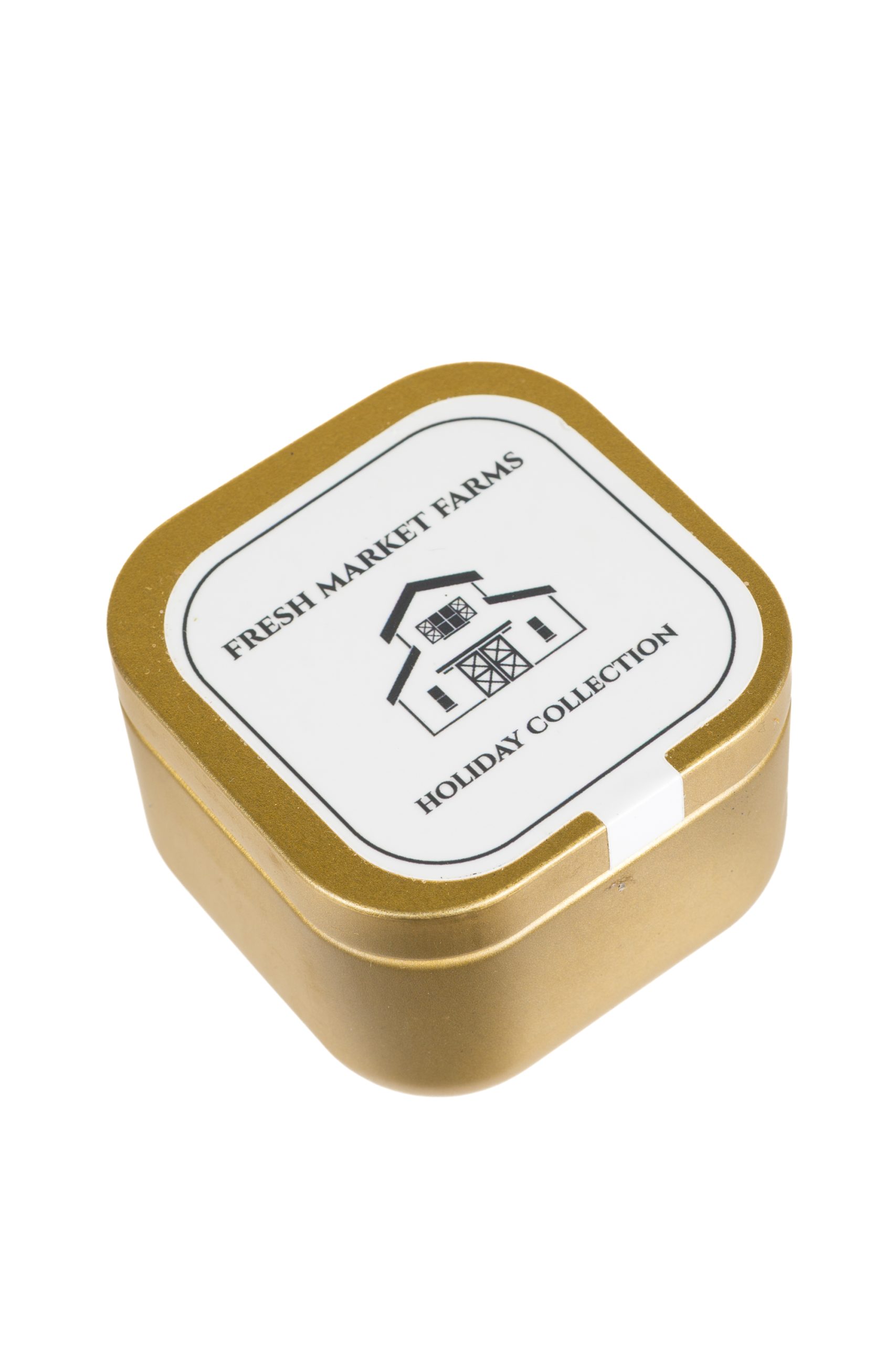• Description: 2" Square Gold Metal Balsam Fir Travel Candle