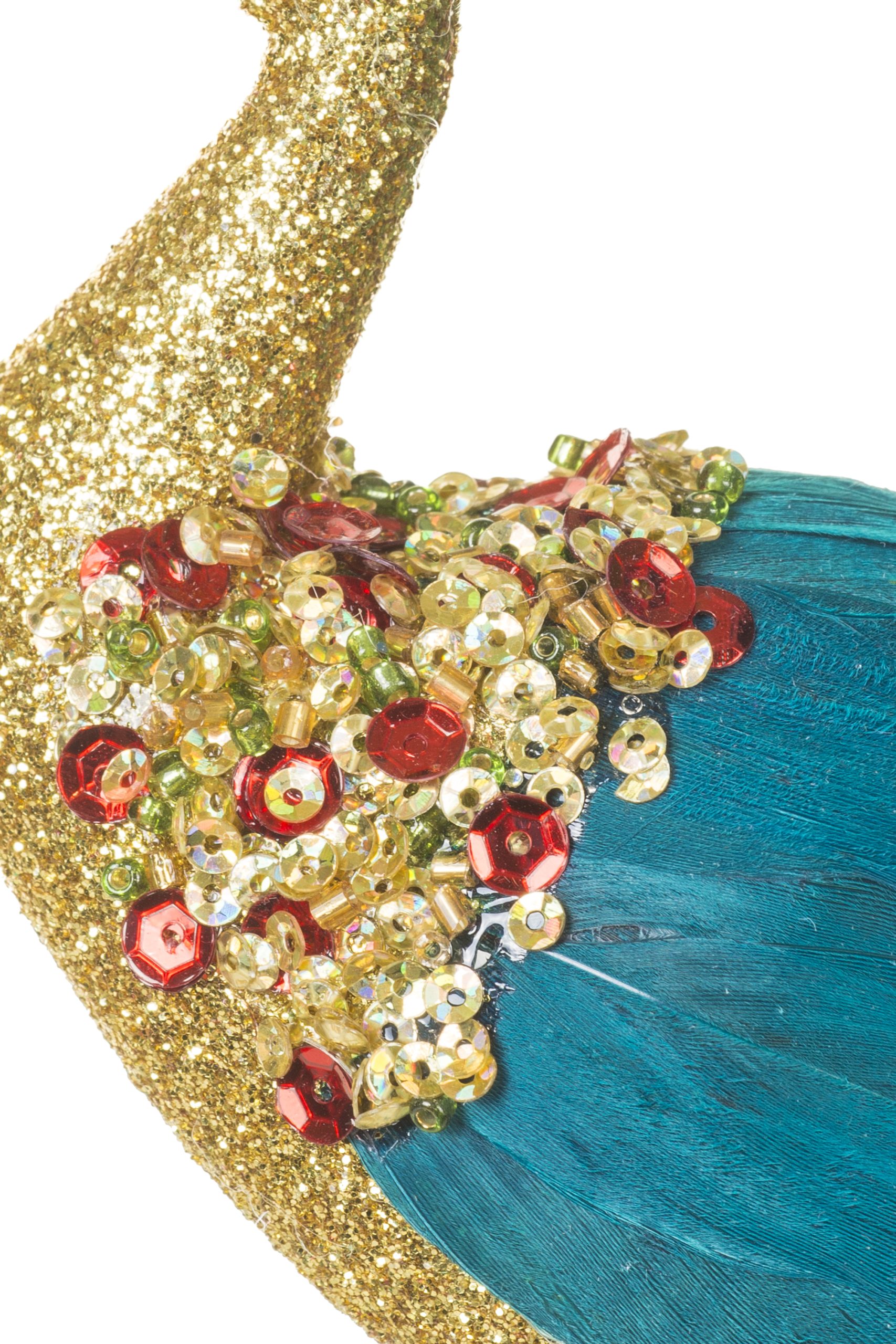 • Description: 9" Glittery Gold and Teal Blue Styrofoam Fancy Peacock Ornament with Feathers & Sequined Back