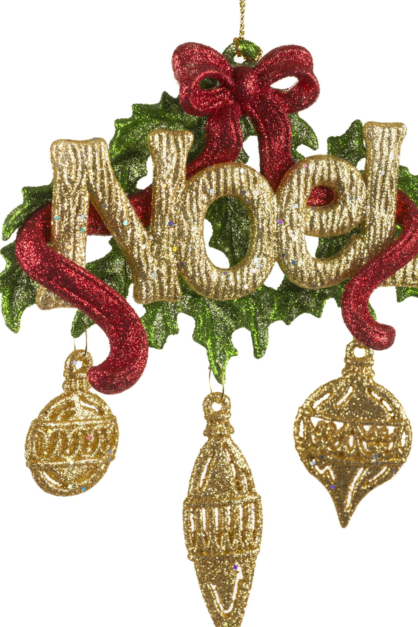 • Description: 6.25" Glittery Hanging Gold Plastic "No?l" Sign Ornament with Hanging Ornaments