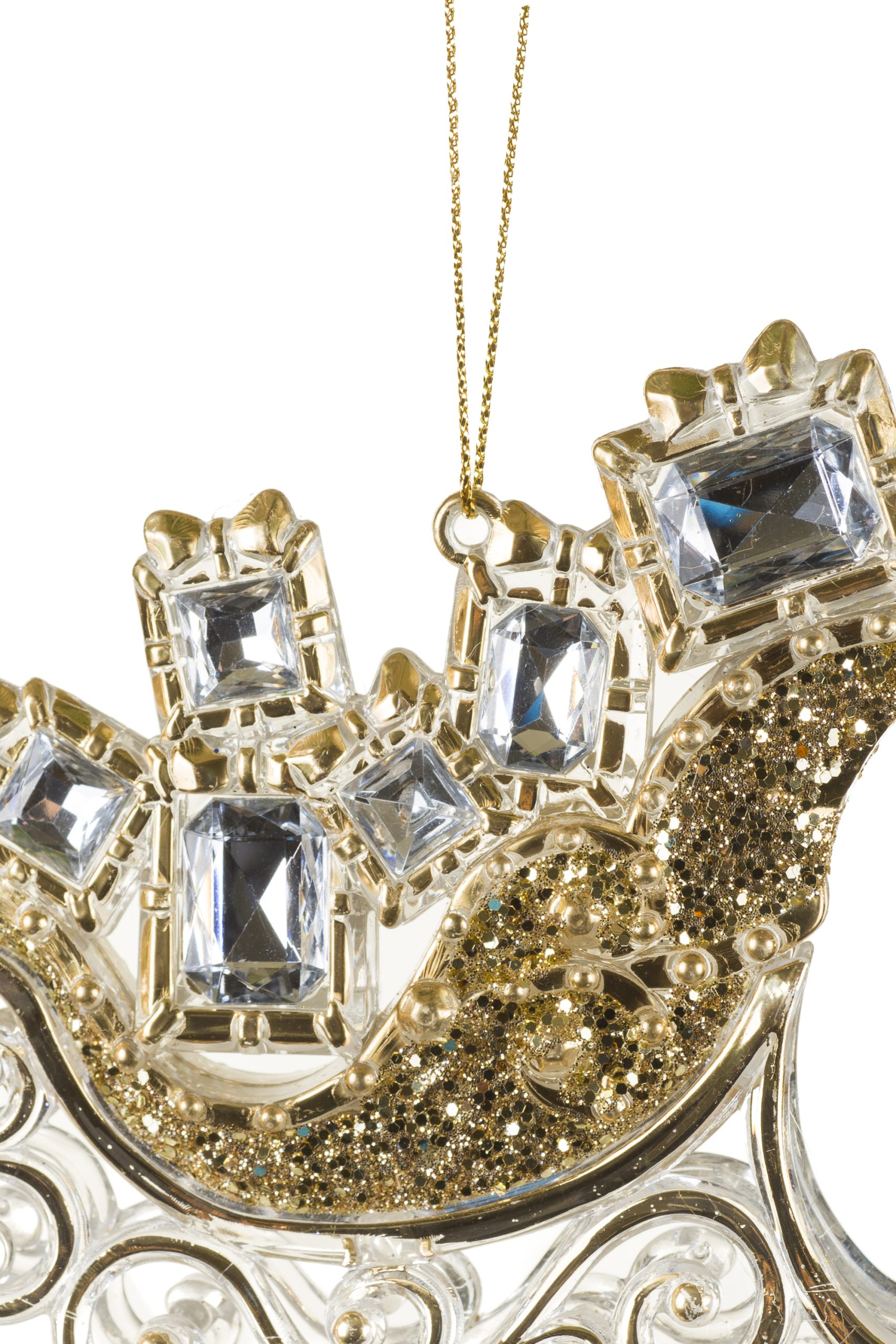 • Description: 4.5" Hanging Gold Plastic Sleigh Ornament with Gold Jewel Presents