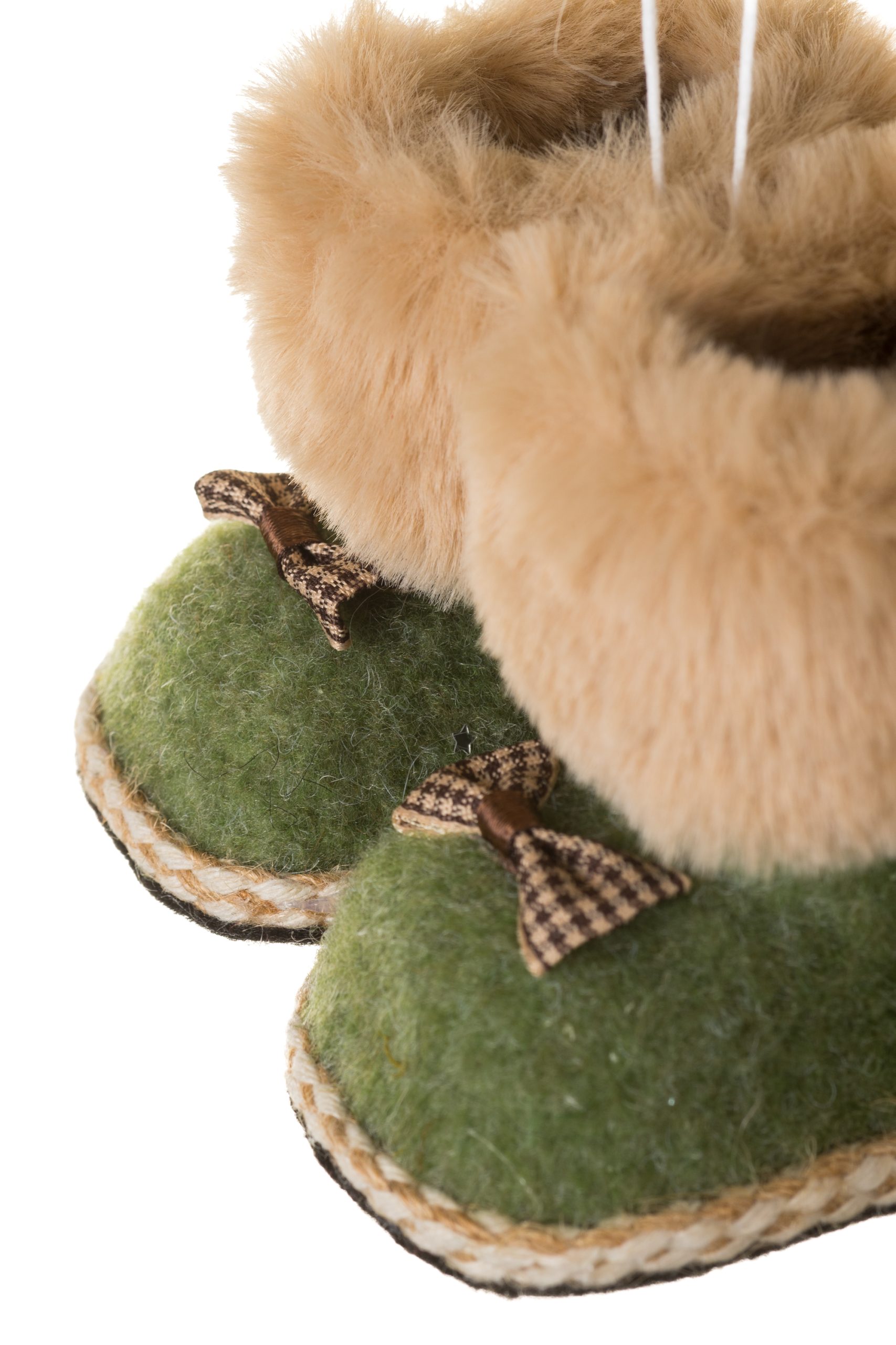 • Description: 3.54" Furry Green and Beige Fabric Pair Of Booties Ornament with Checkered Bowties