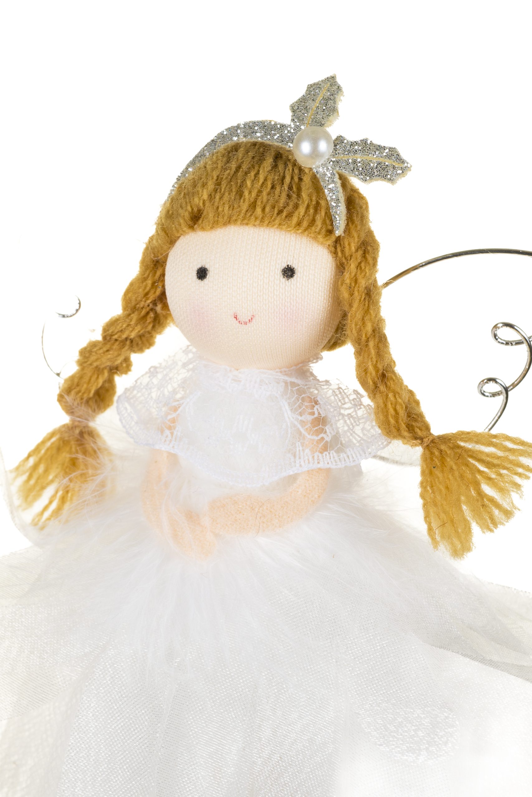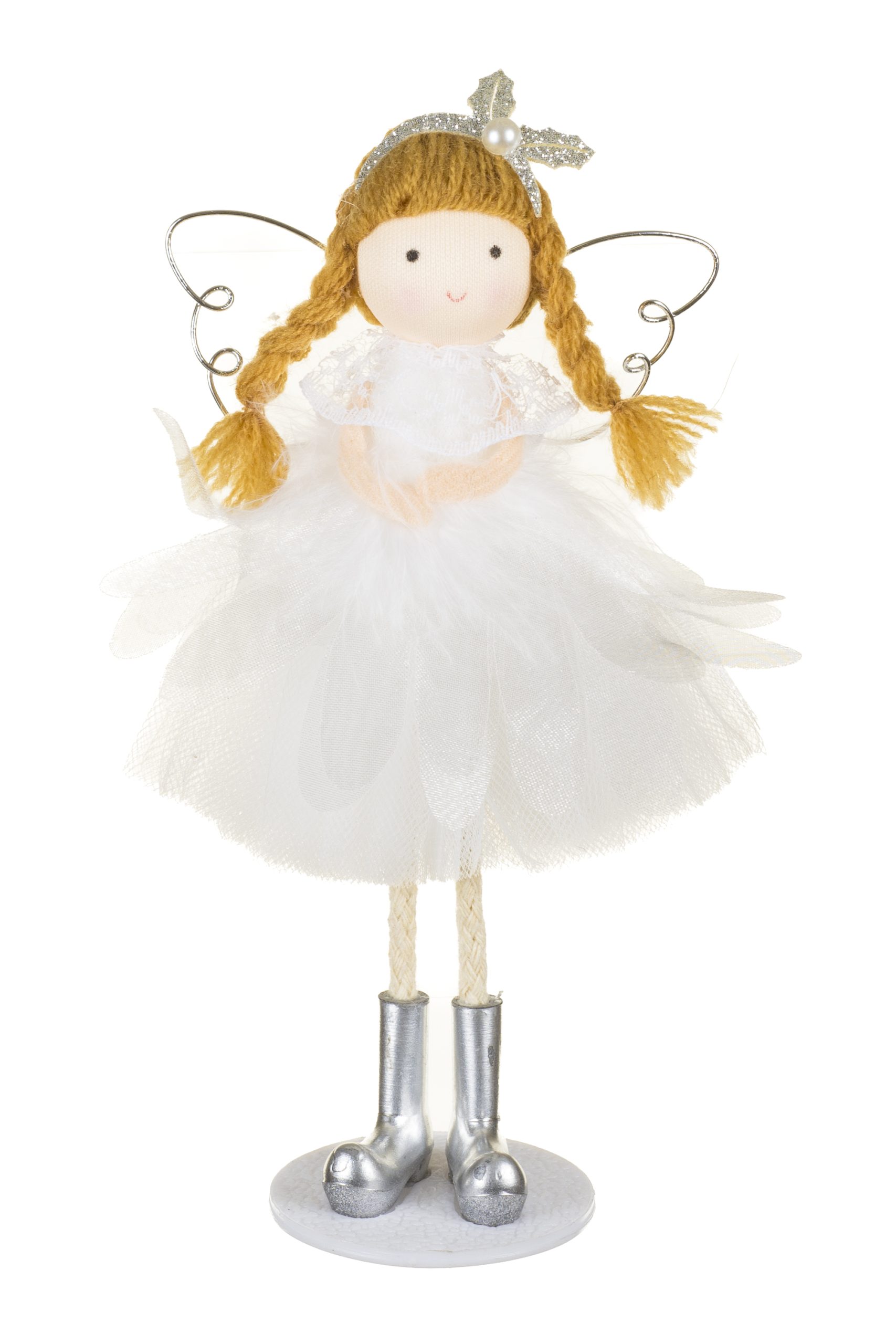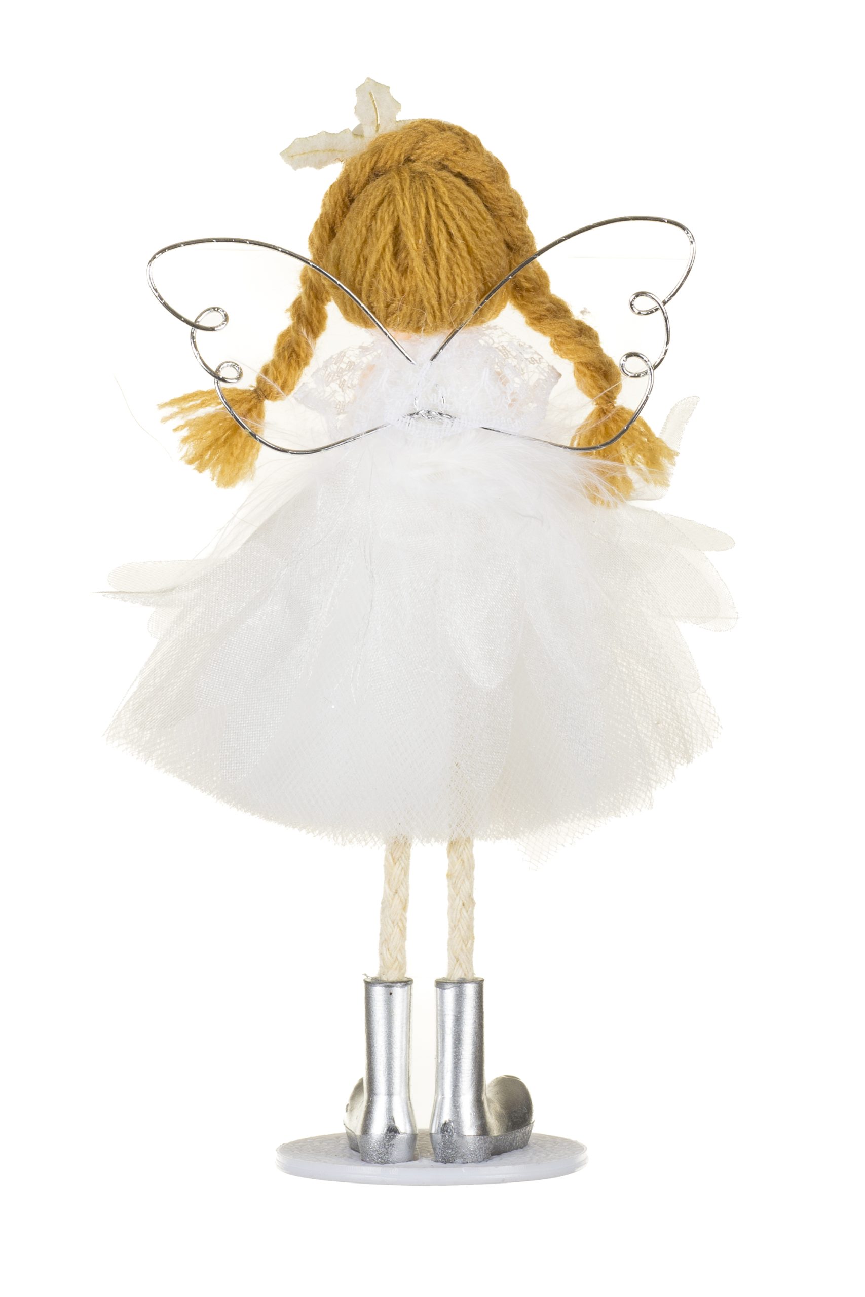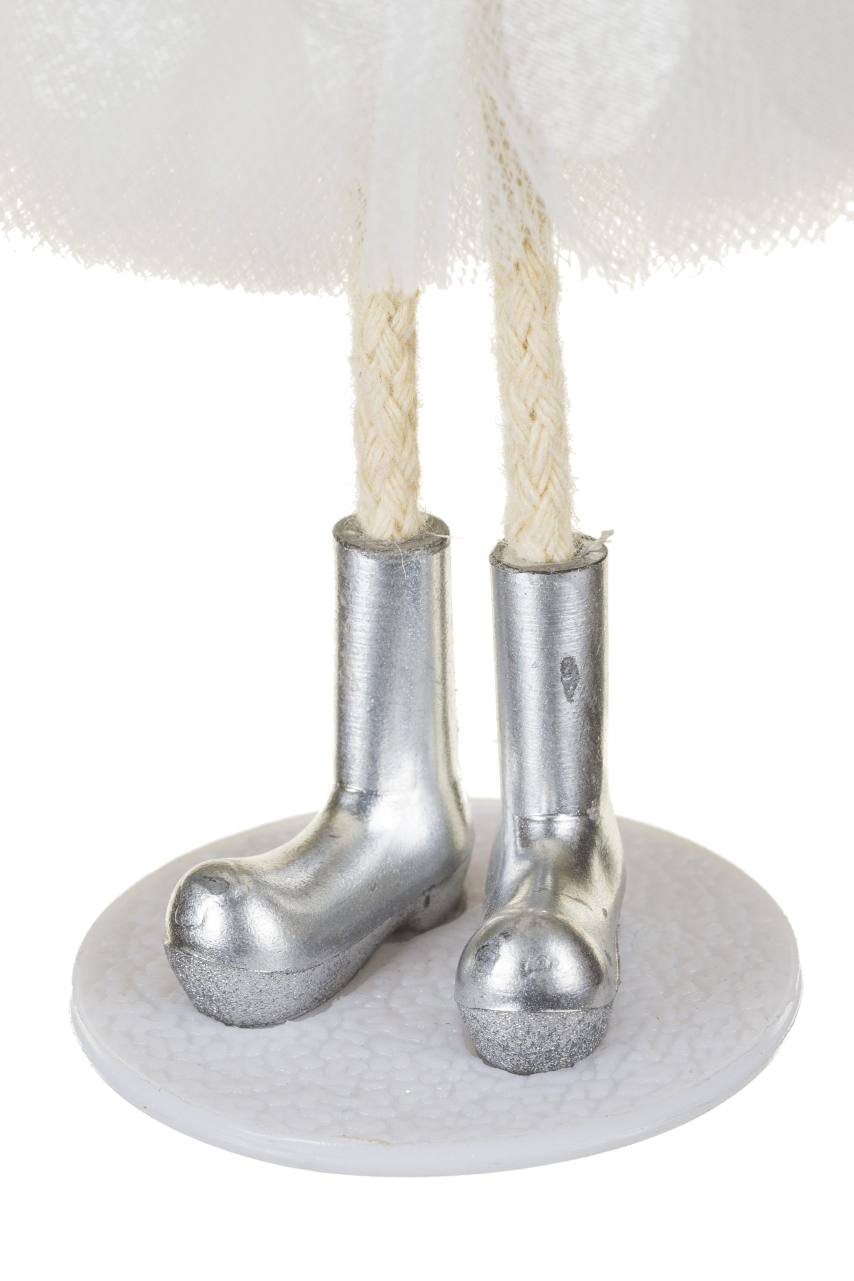 • Description: 6.9" Hangable White and Silver Fabric Angel Ornament with Plastic Base & Poseable Legs