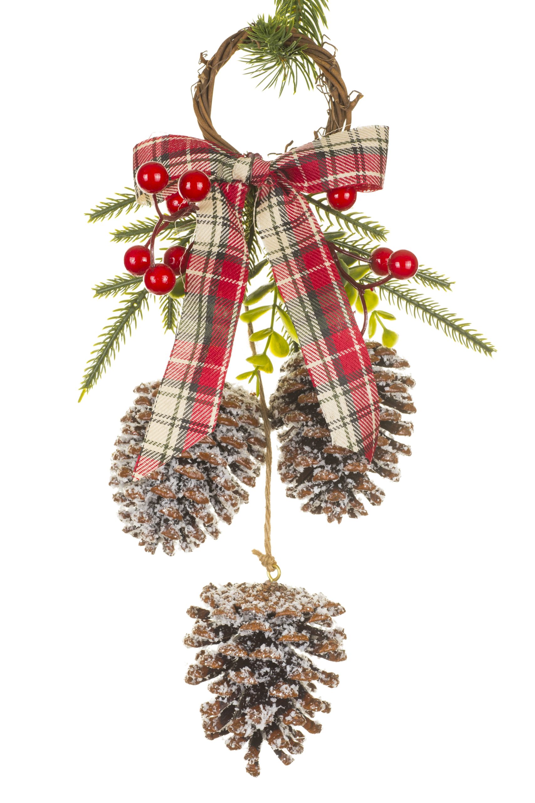 • Description: 14" Glittery Hanging Light Brown and Red Wood Forest Pinecone Wall Decoration with Rattan Ring & Plaid Bow
