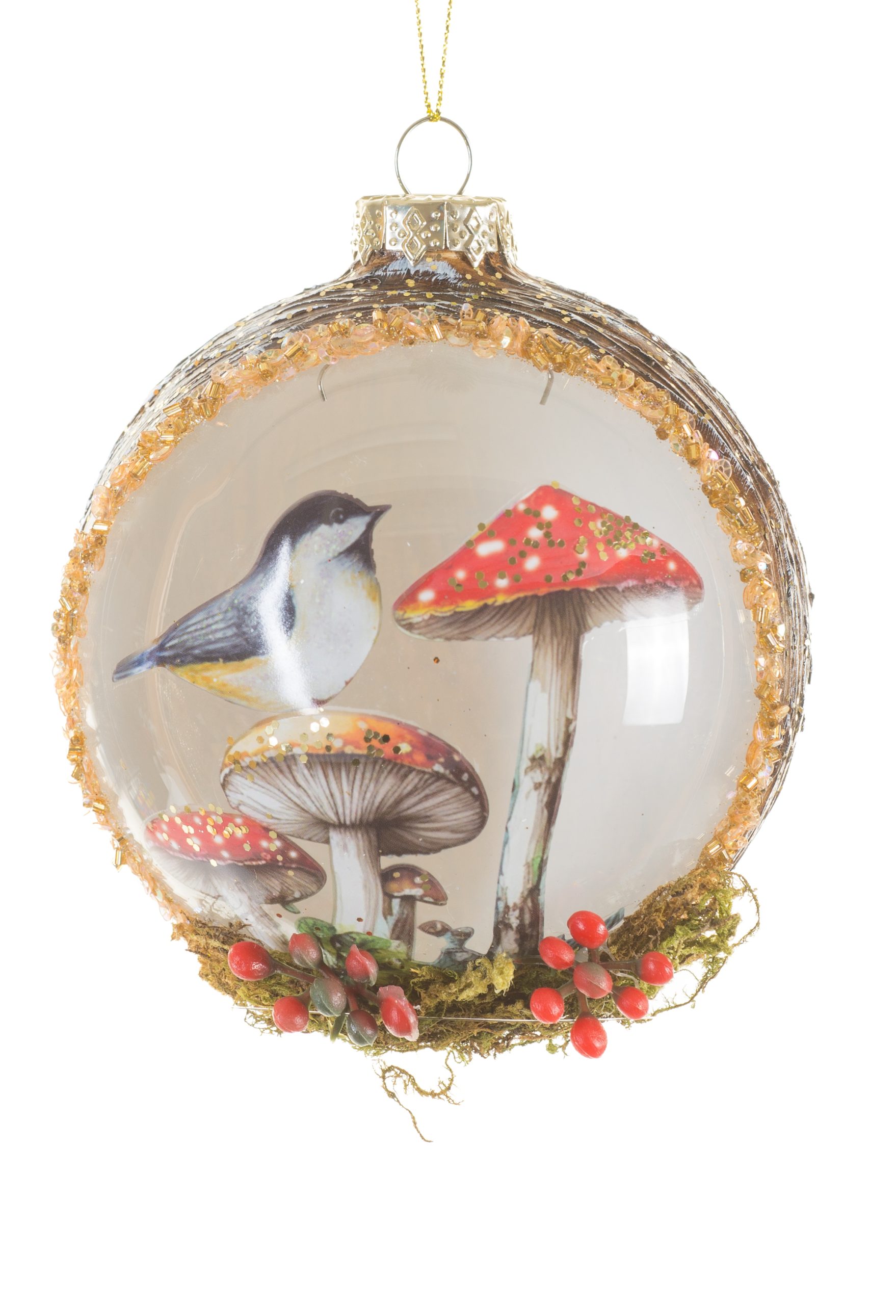• Description: 4.5" Glittery Hanging Ochre Glass Tree Bark Bauble Ornament with Chickdee & Mushrooms
