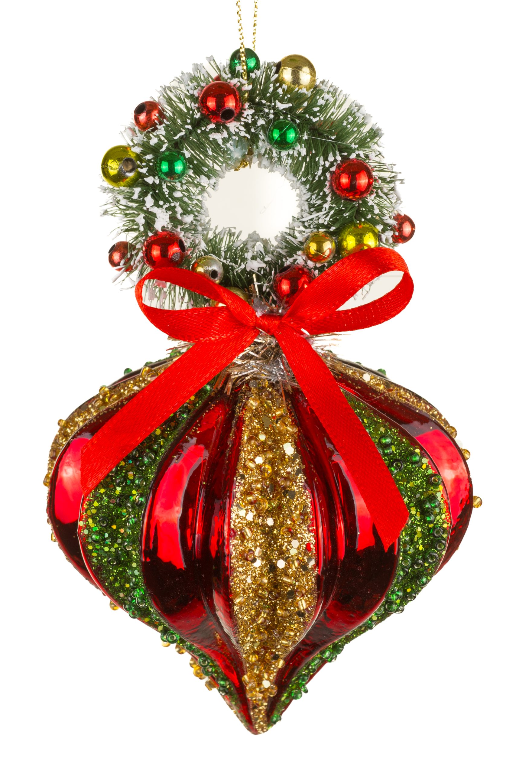 • Description: 6" Glittery Hanging Striped Red Glass Ridged Finial Ornament with Gold and Emerald Trim & Pine Wreath