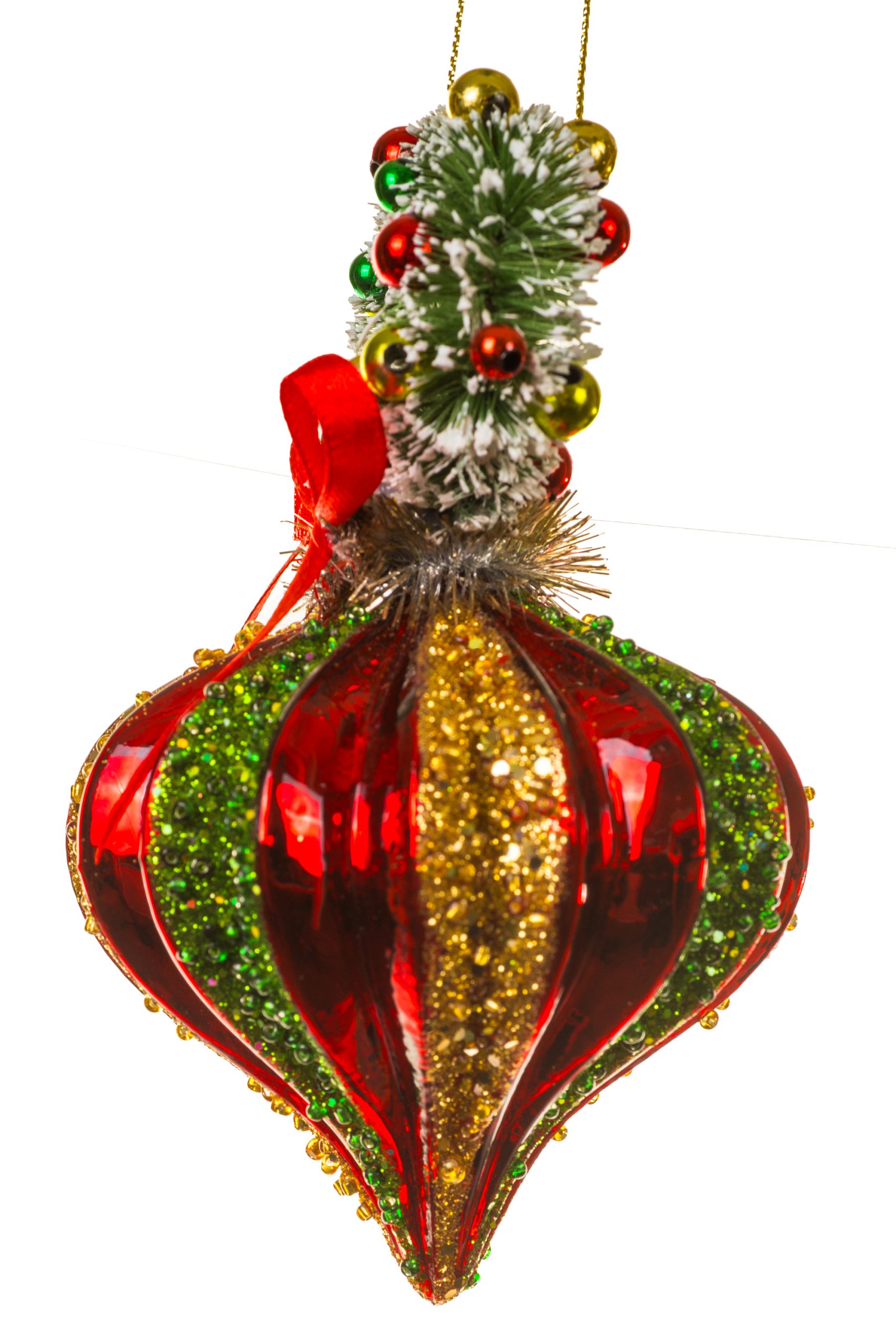 Hanging Red Ridged Finial Ornament With Gold And Emerald Trim