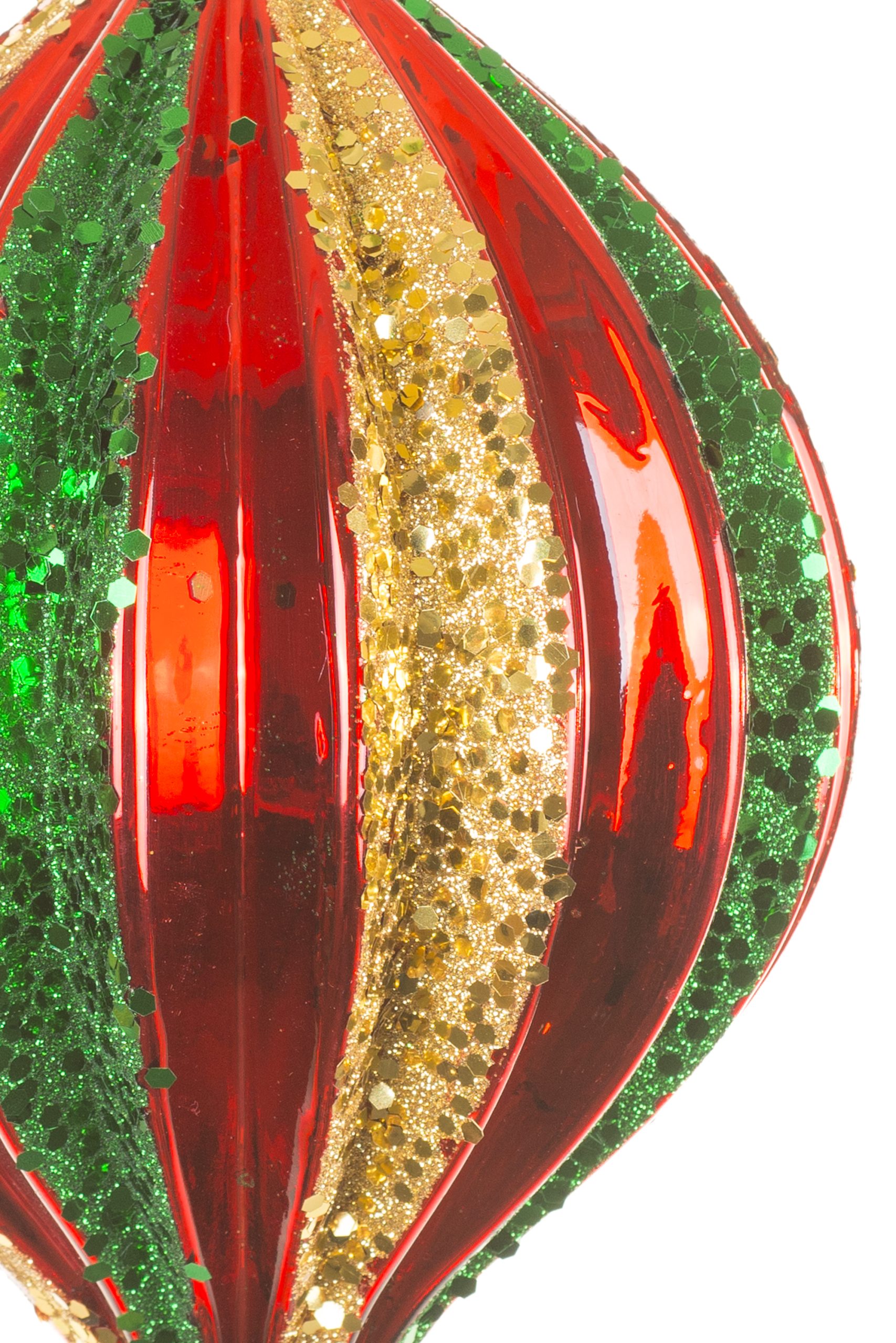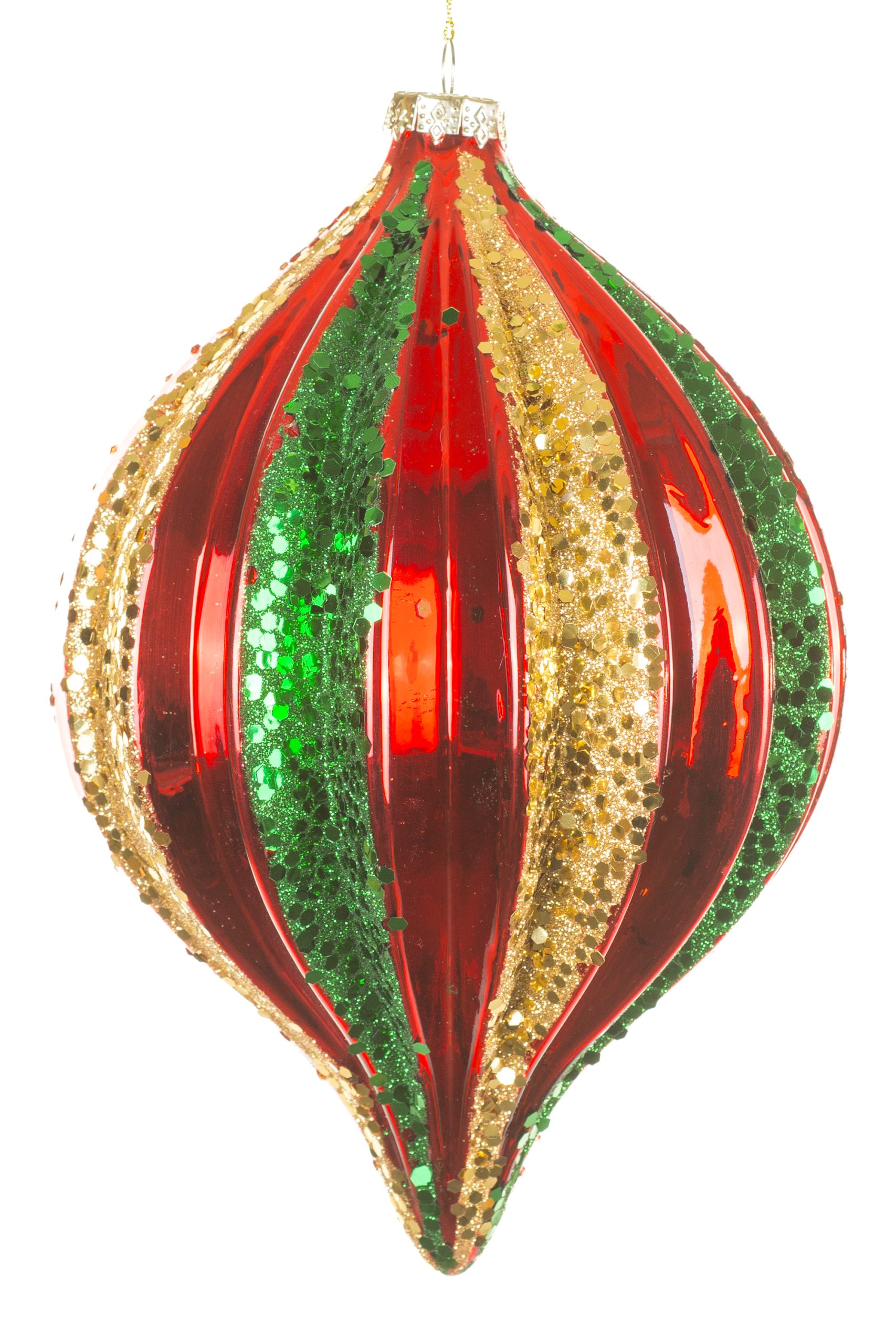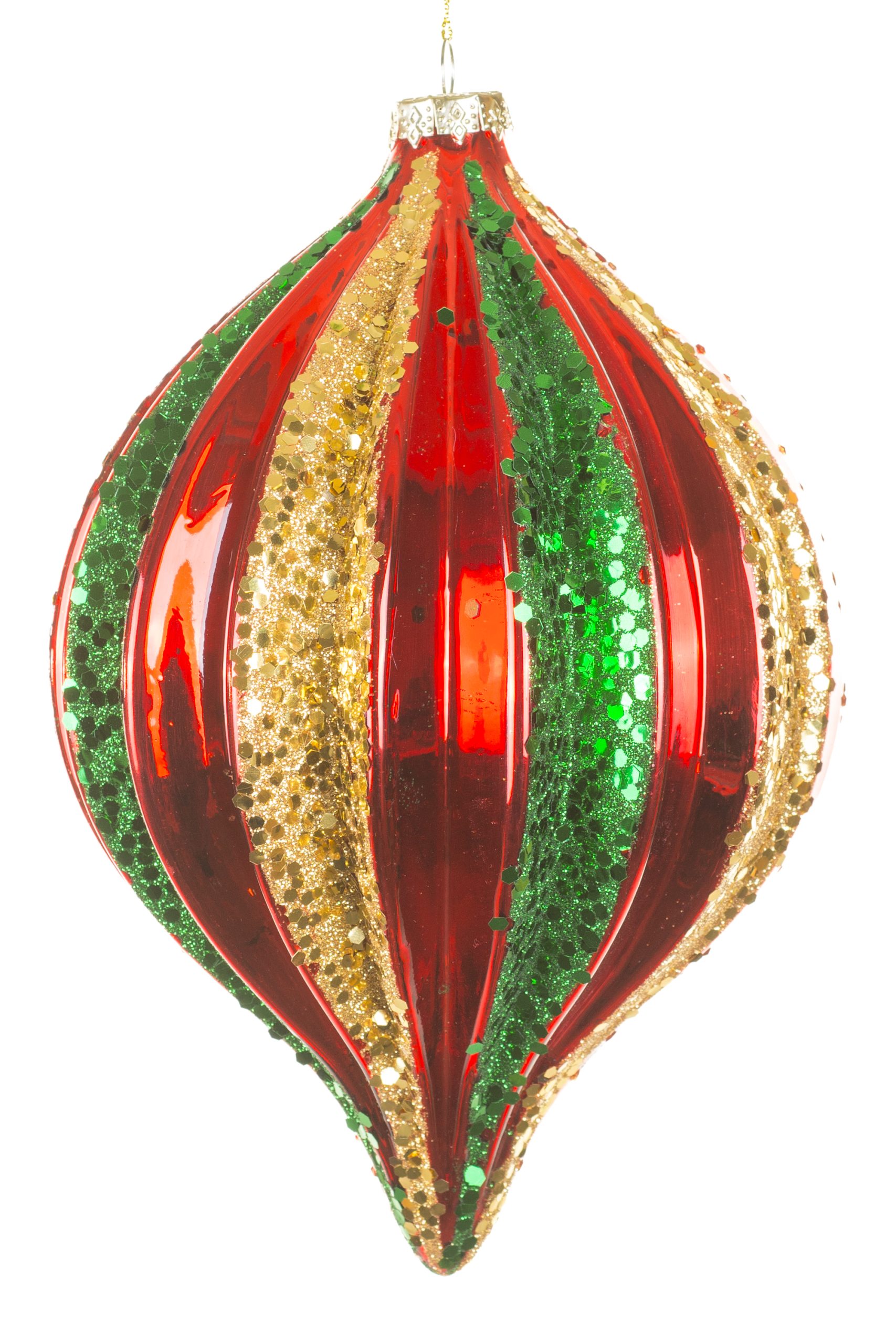 • Description: 8.75" Glittery Hanging Red Glass Ridged Finial Ornament with Gold and Green Bands