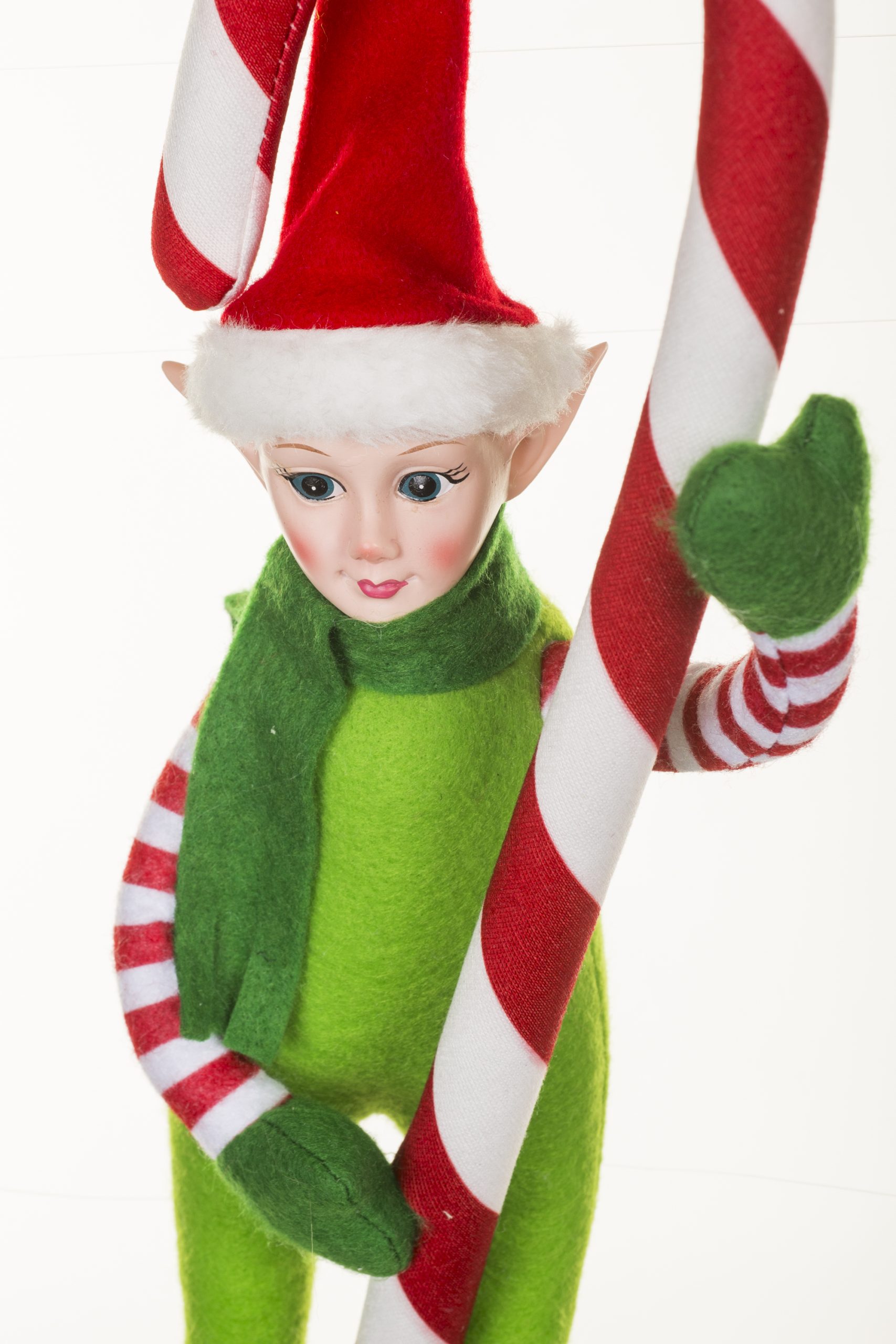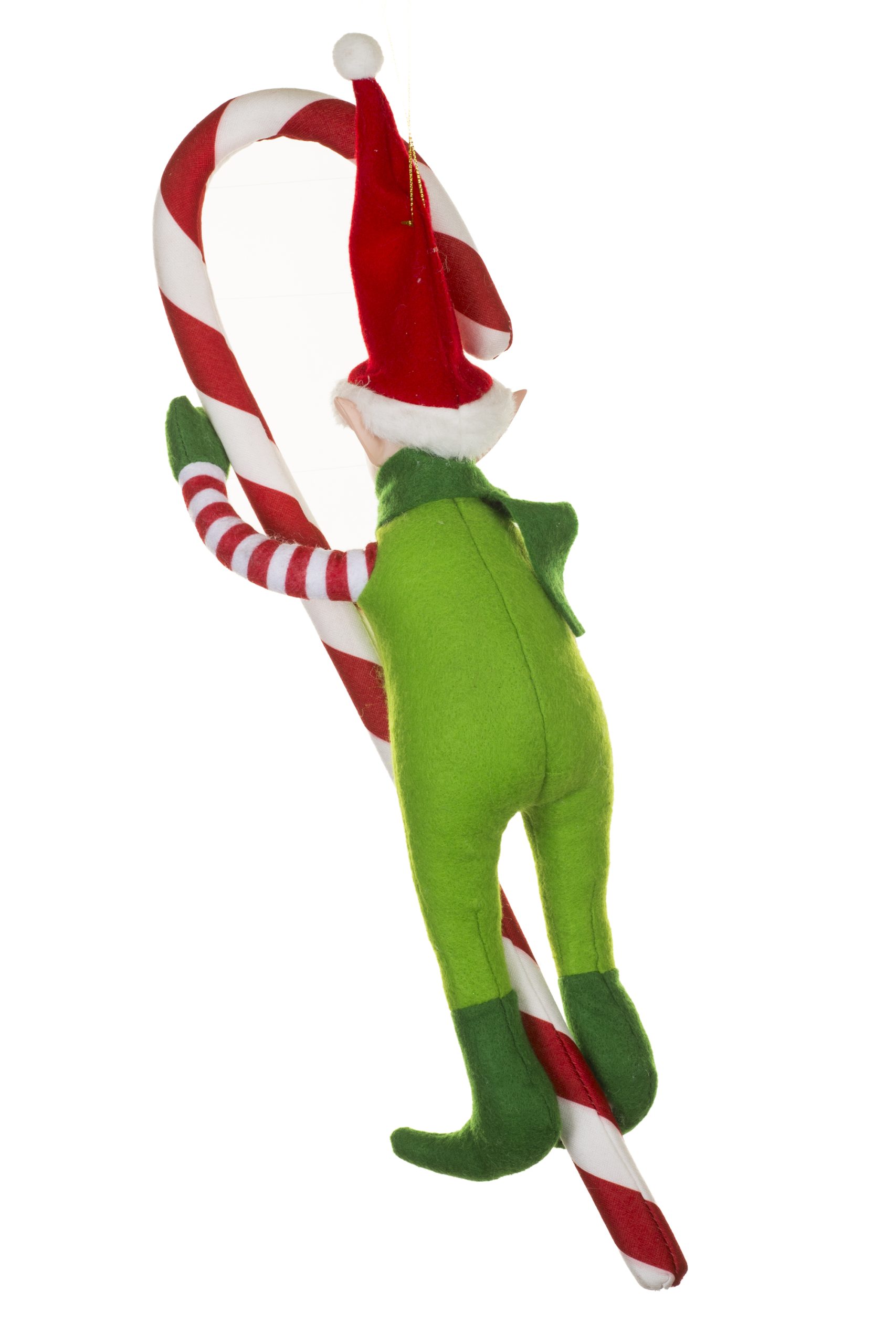 • Description: 18" Hanging Sea Green and Red Cotton Elf Doll with Candy Cane & Wearing Green Scarf