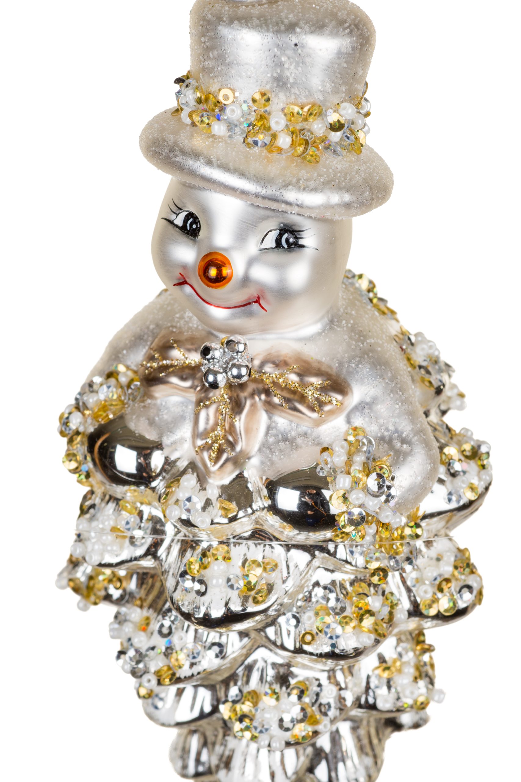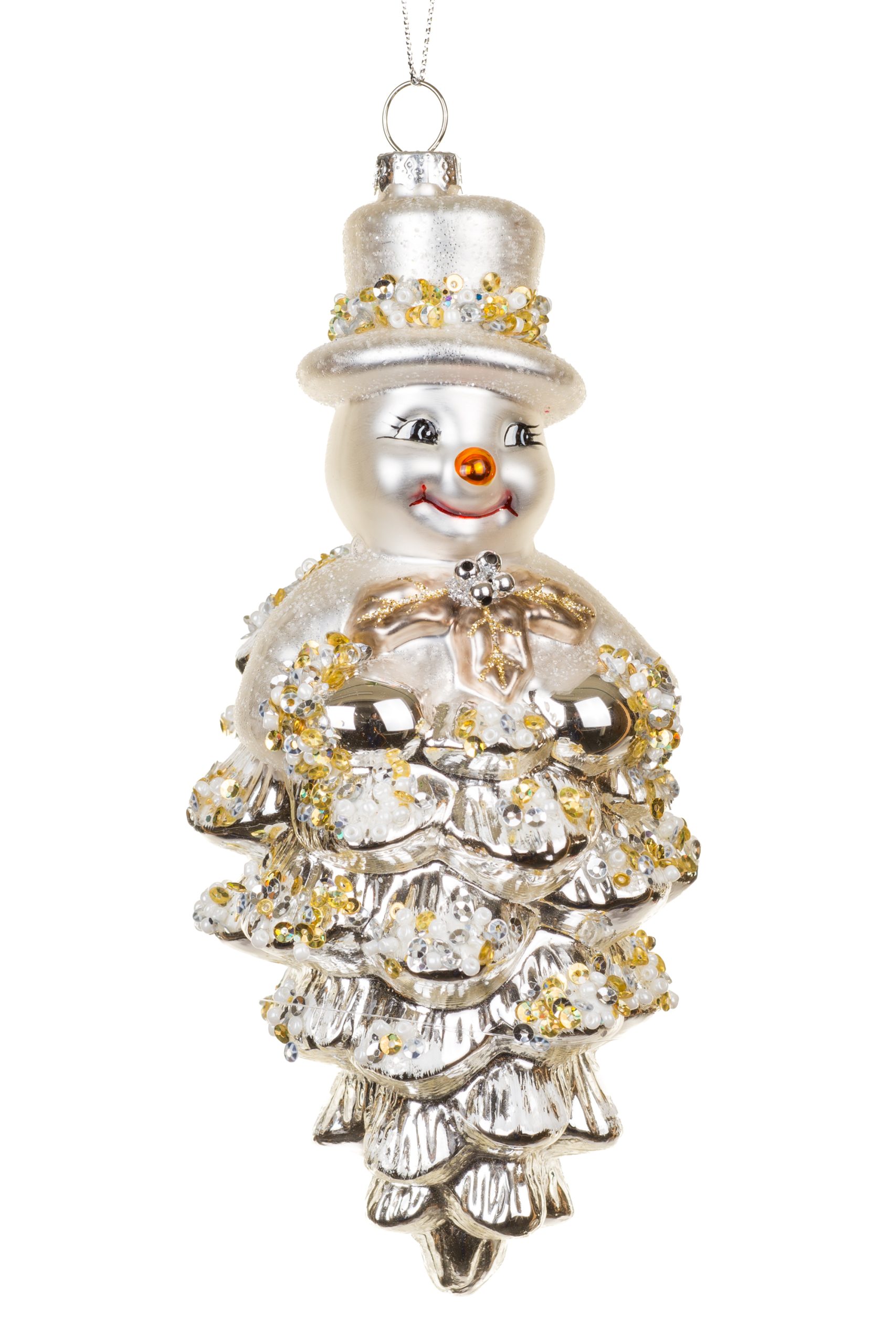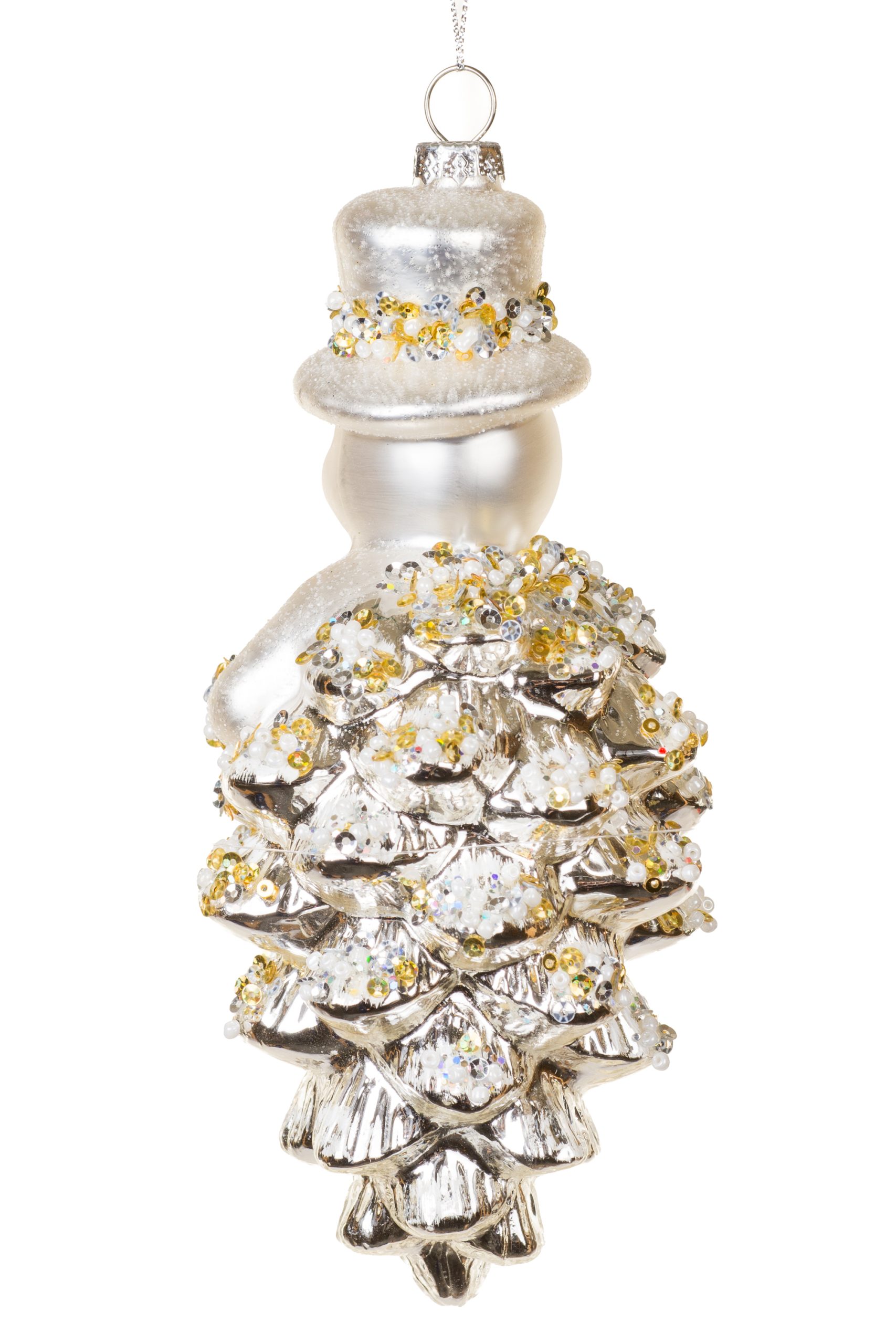 • Description: 7.25" Frosted Hanging Silver Glass Snowman's Pinecone Ornament with Gold Sequins
