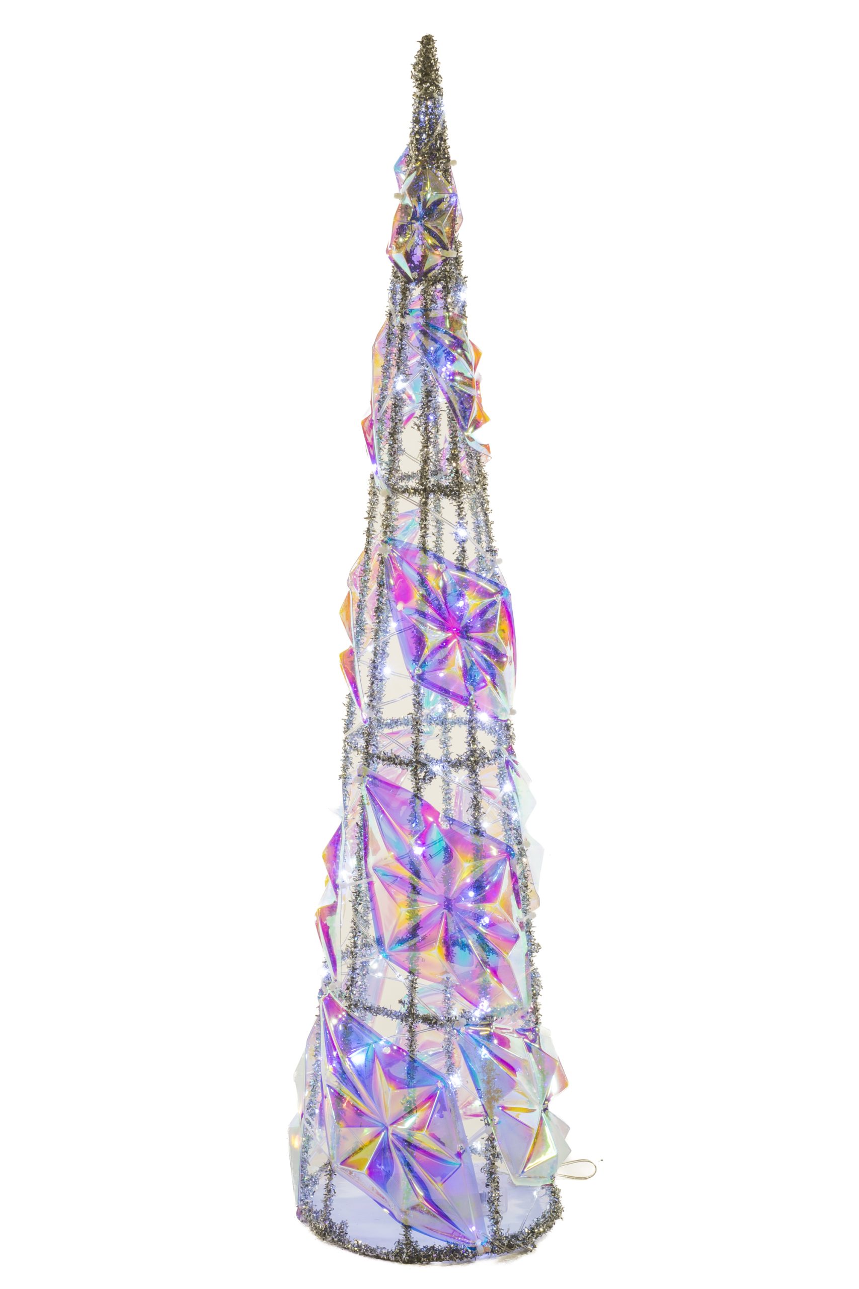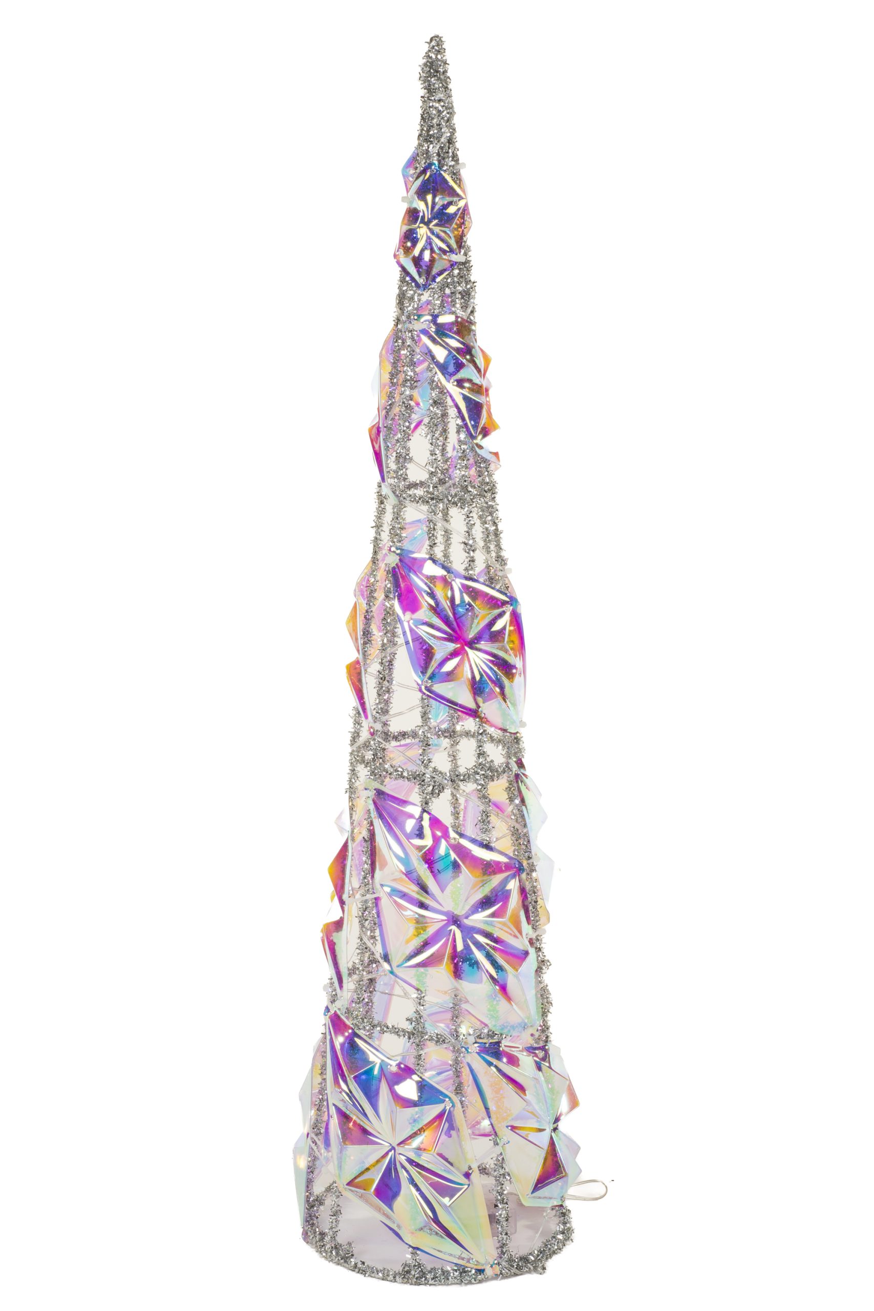 • Description: 32" Frosted Iridescent and Silver Plastic Pointed Cool White LED Accent Tree with Tinsel