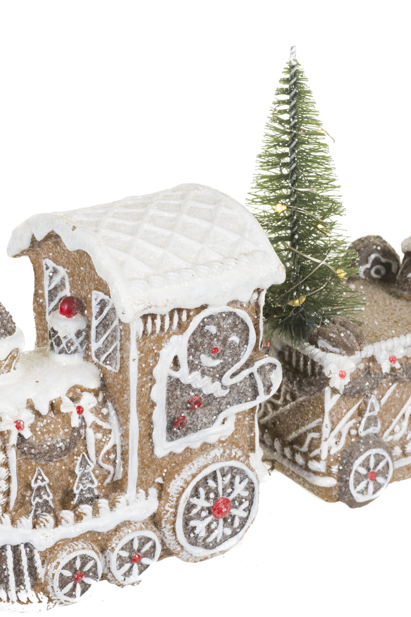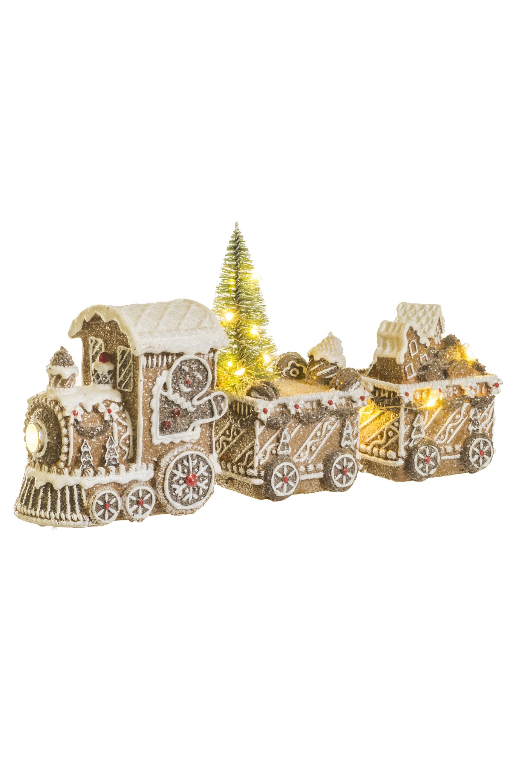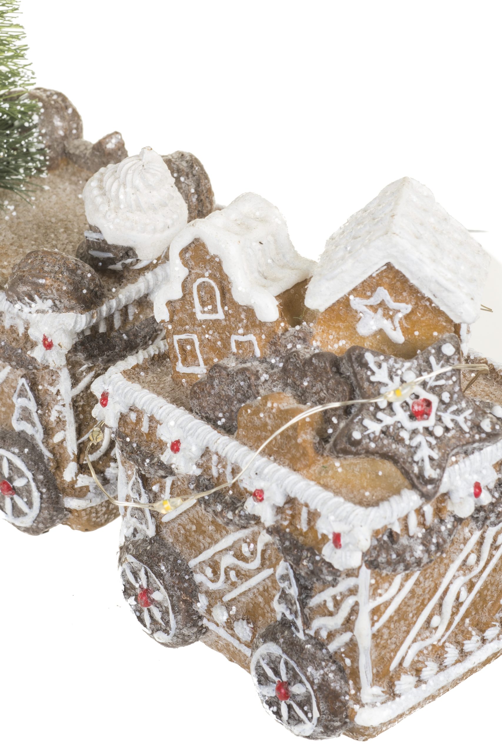 • Description: 11.5" Glittery Light Brown and White Resin Gingerbread LED Train with Cable Chains and Christmas Trees