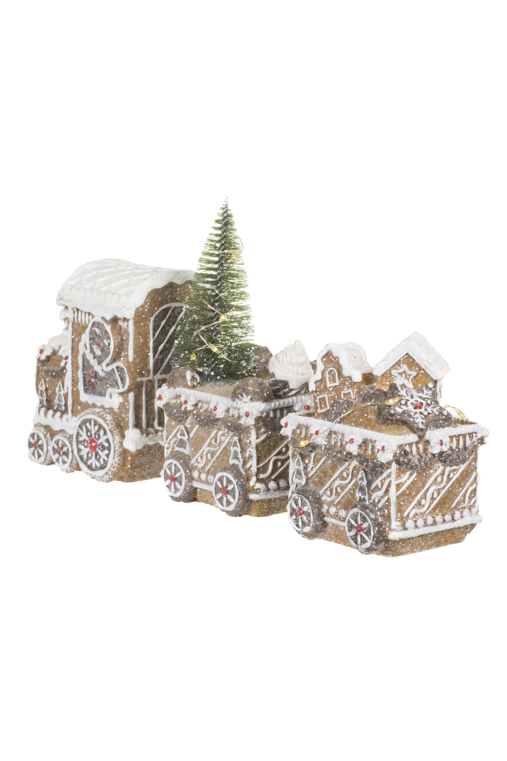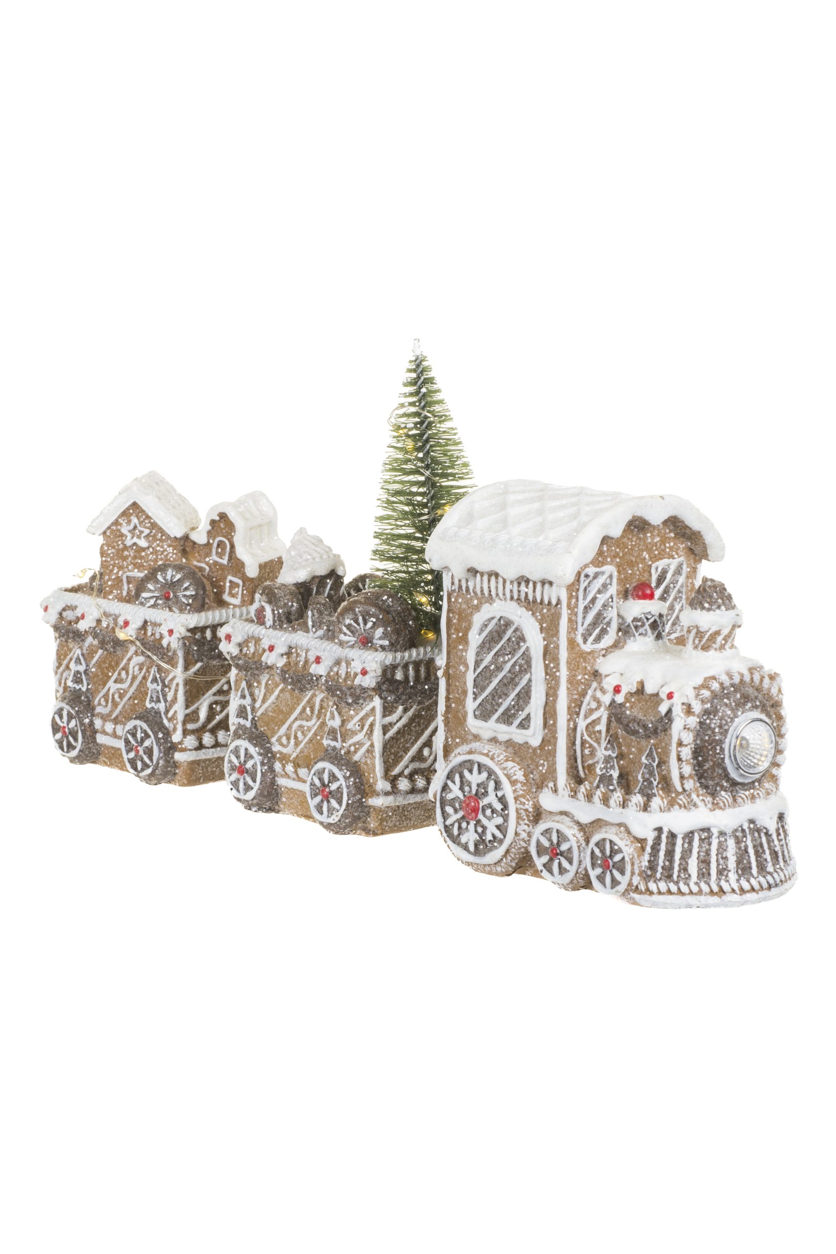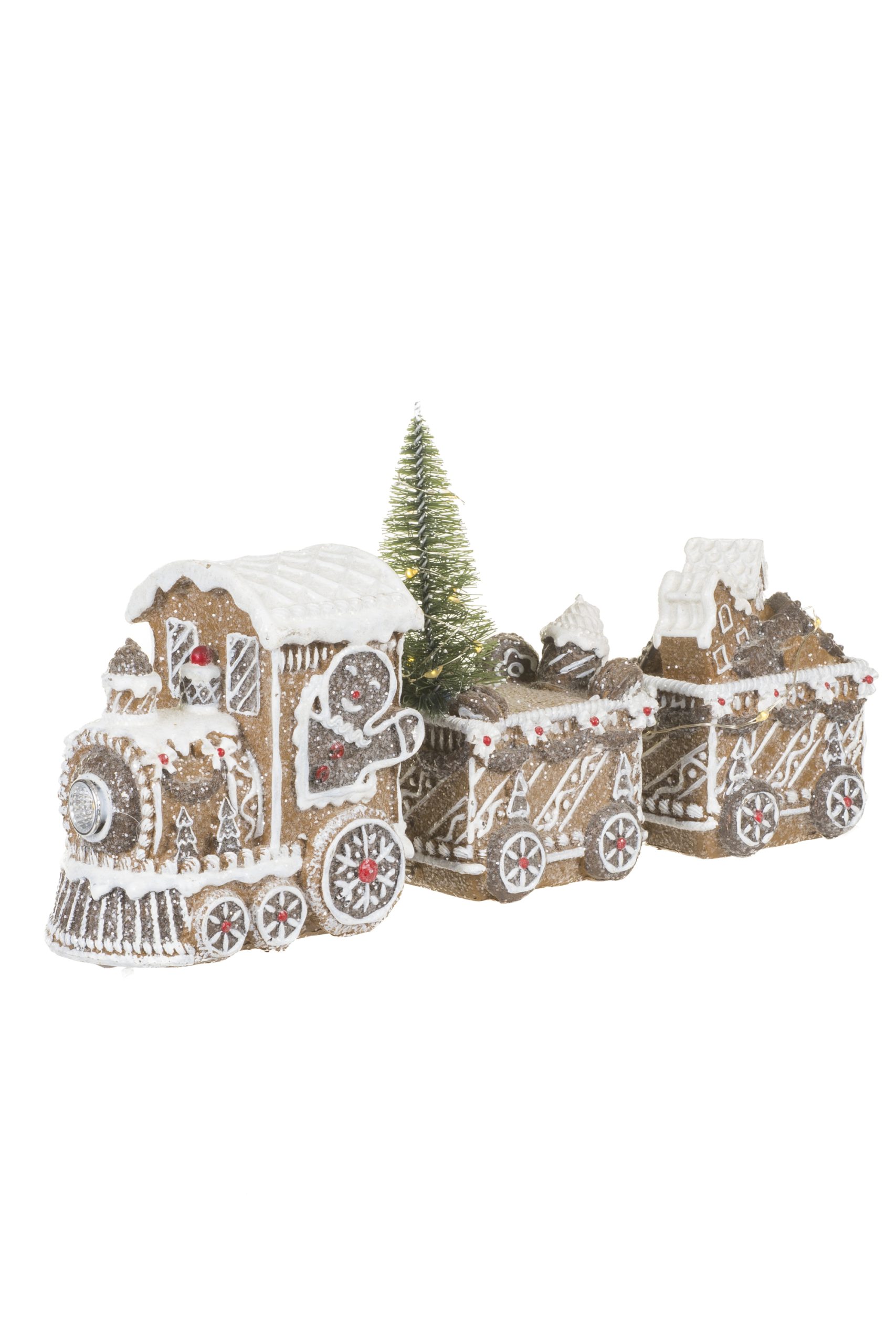 • Description: 11.5" Glittery Light Brown and White Resin Gingerbread LED Train with Cable Chains and Christmas Trees