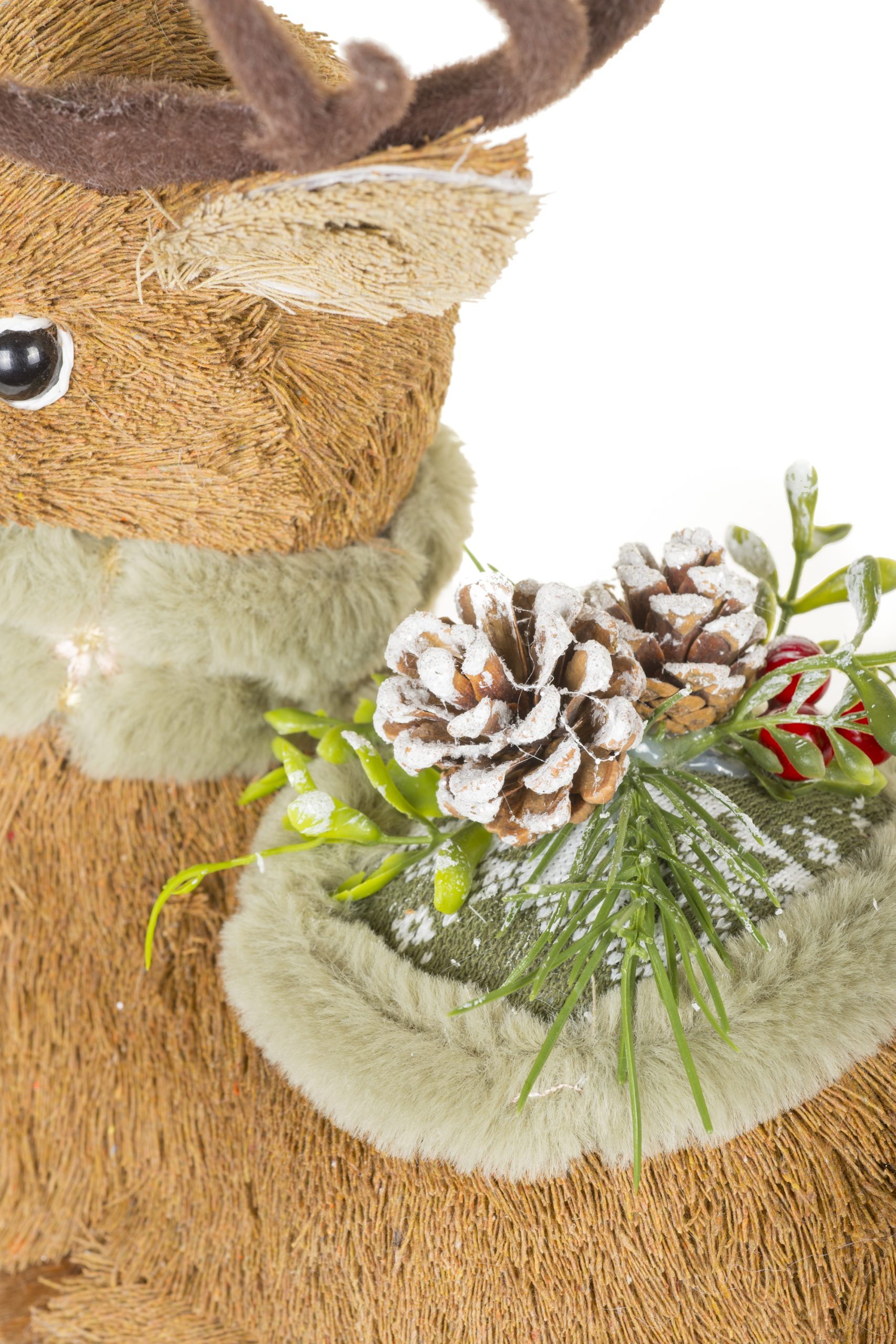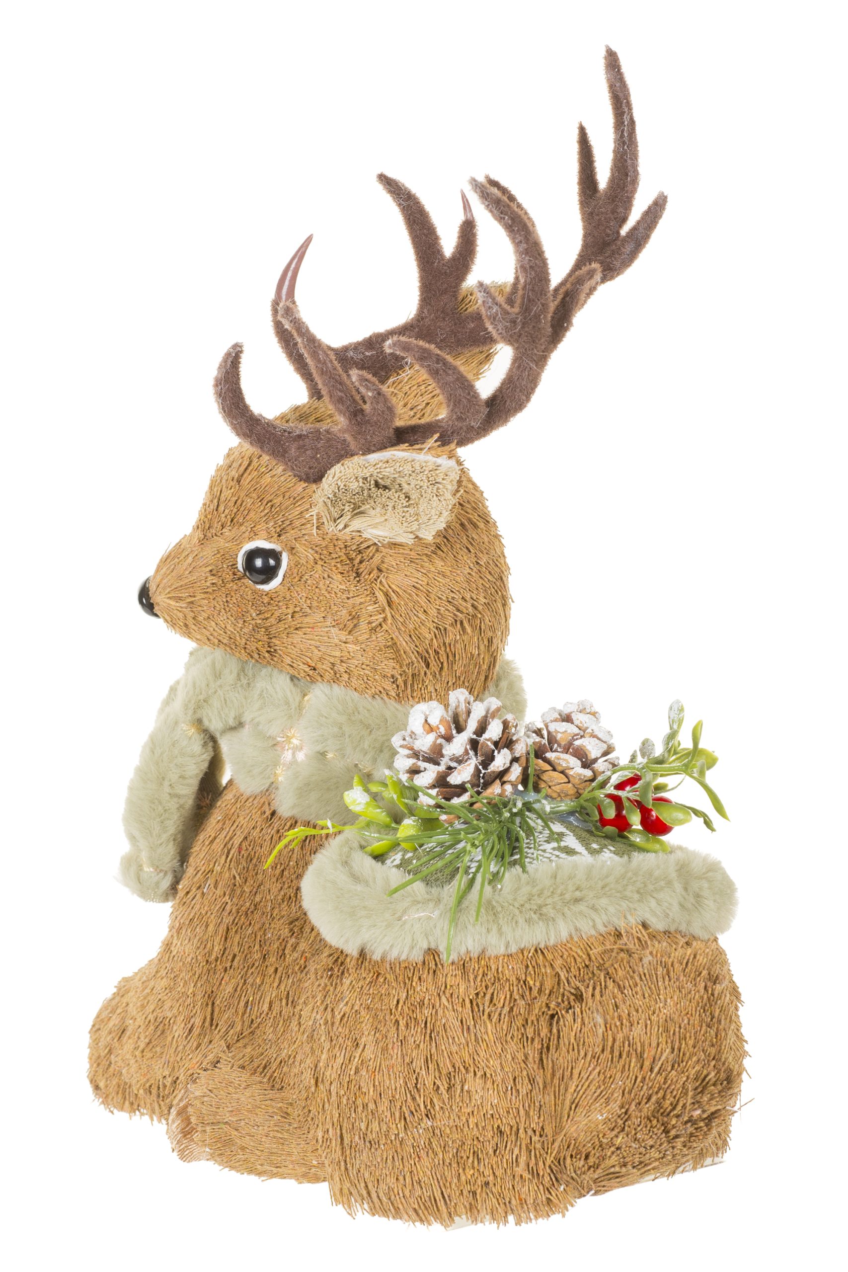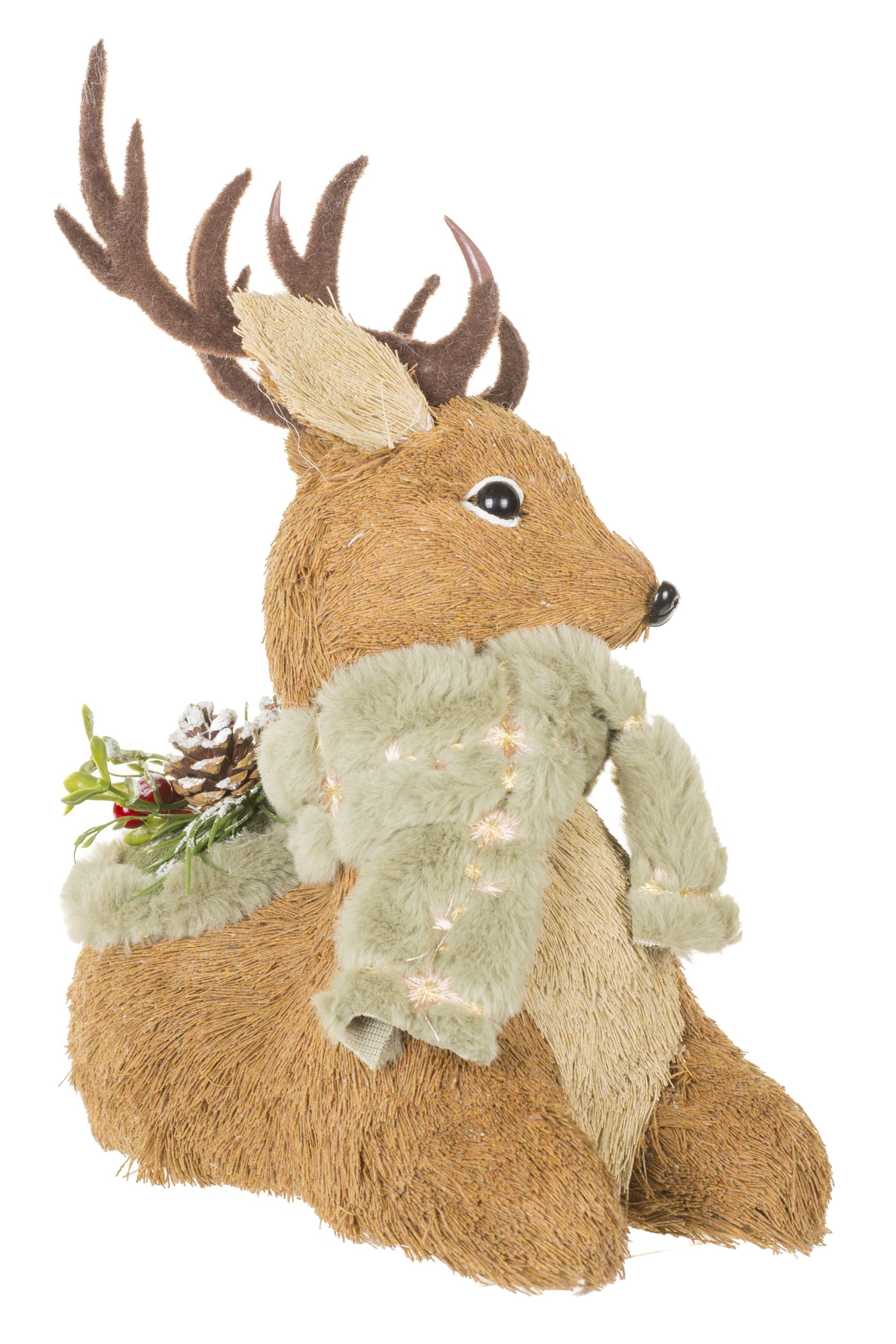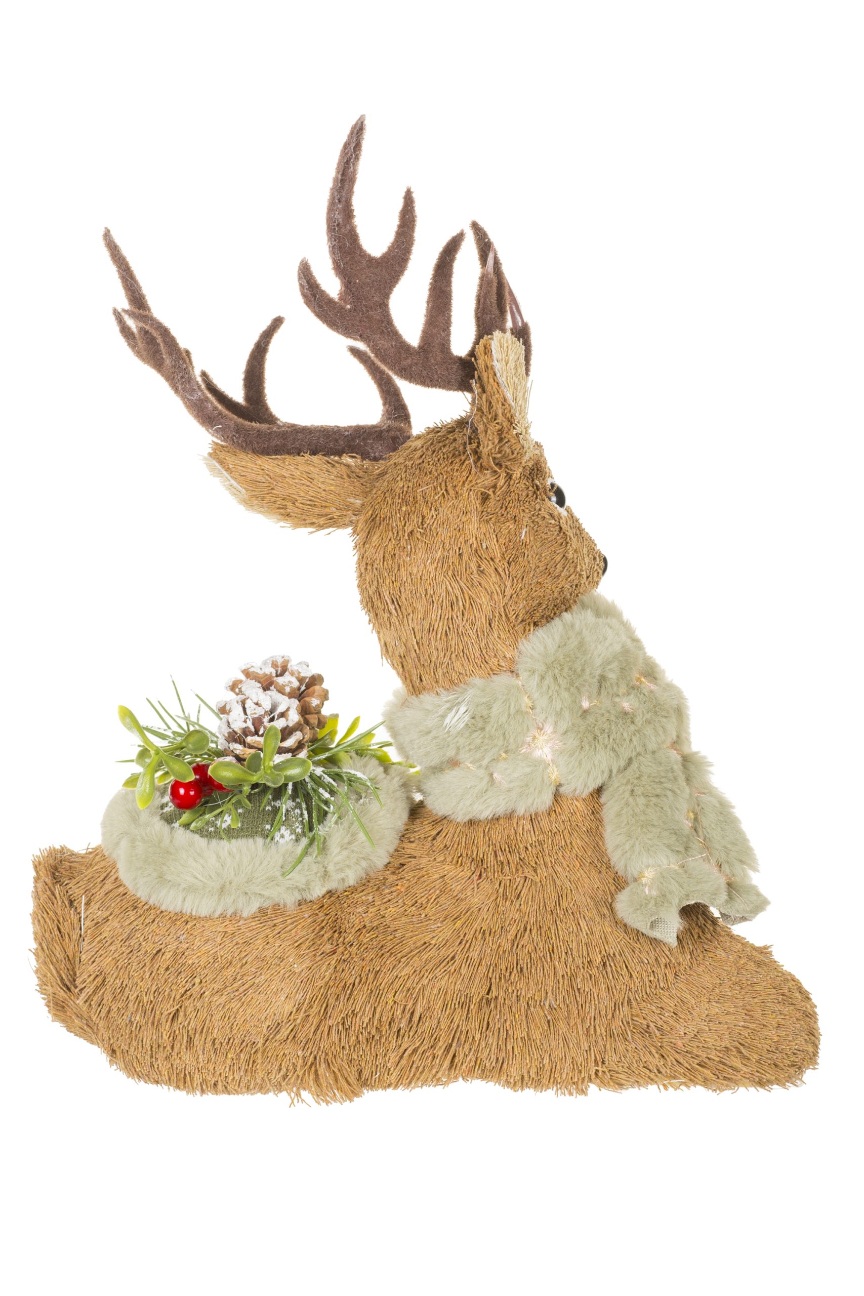 • Description: 13" Light Brown Straw Laying Down Reindeer Figurine with Scarf & Saddle