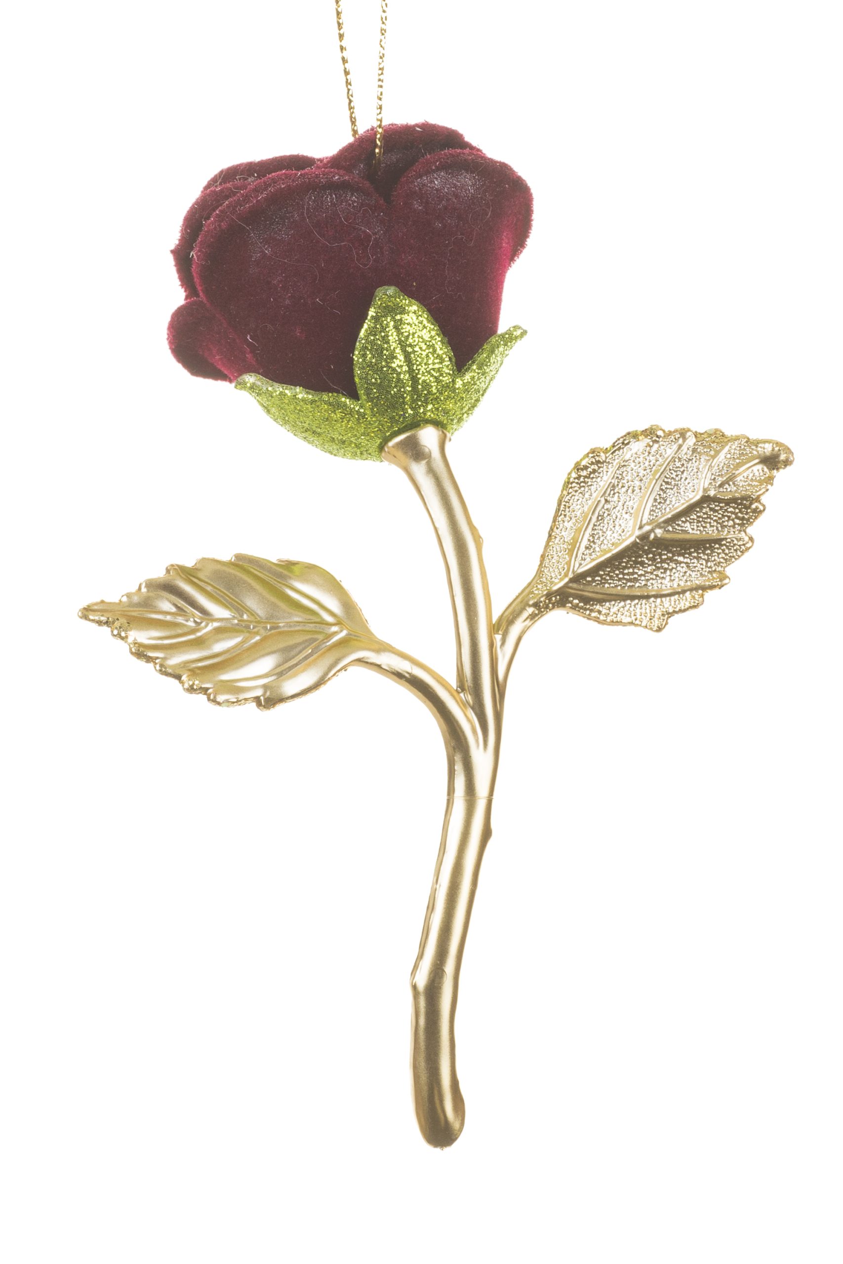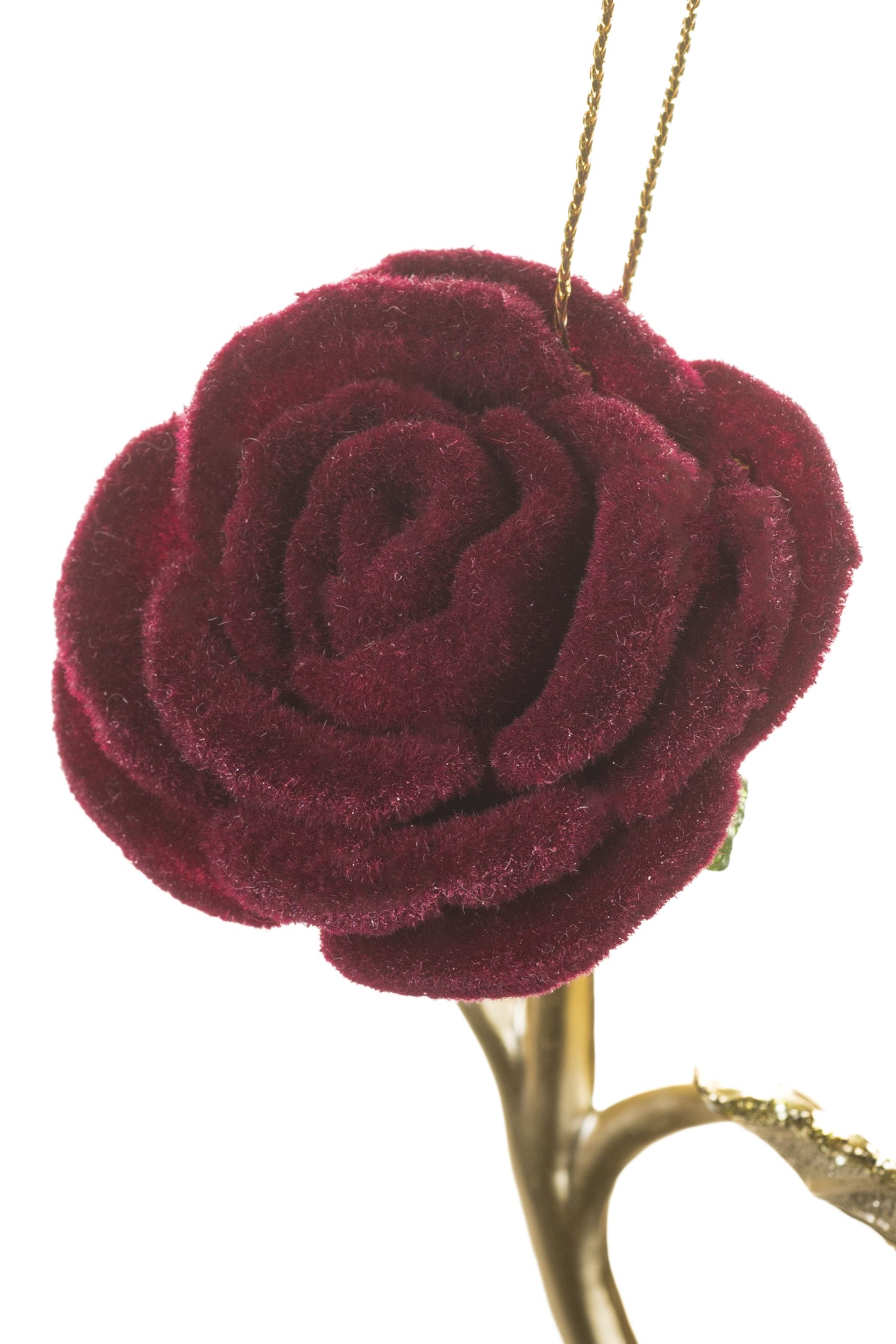 • Description: 5" Hanging Matte Maroon and Gold Plastic Rose Ornament with Fabric-Like Petals