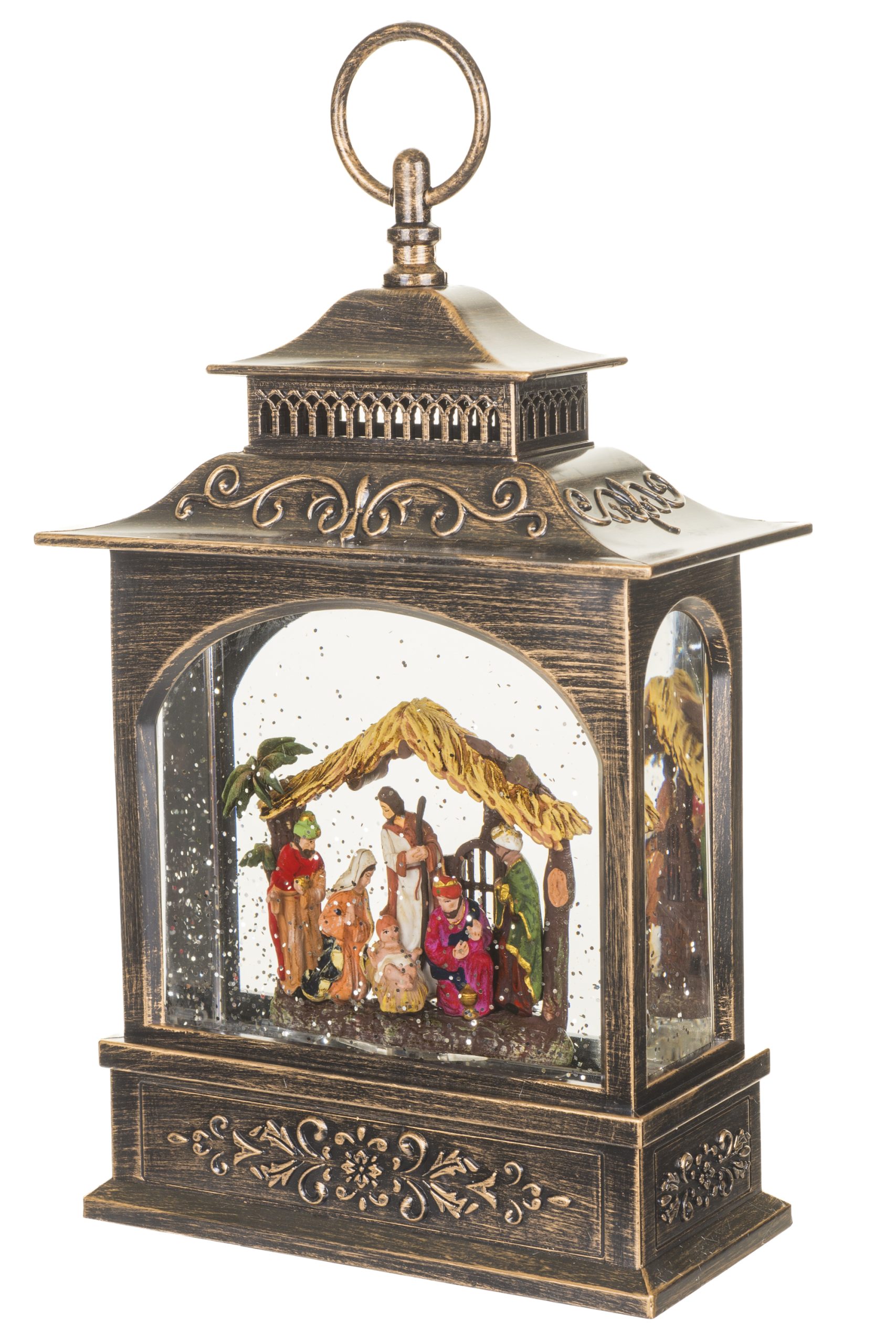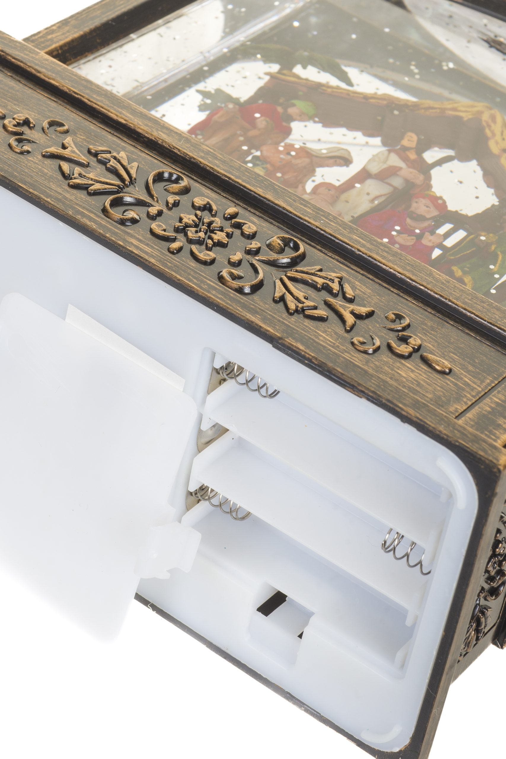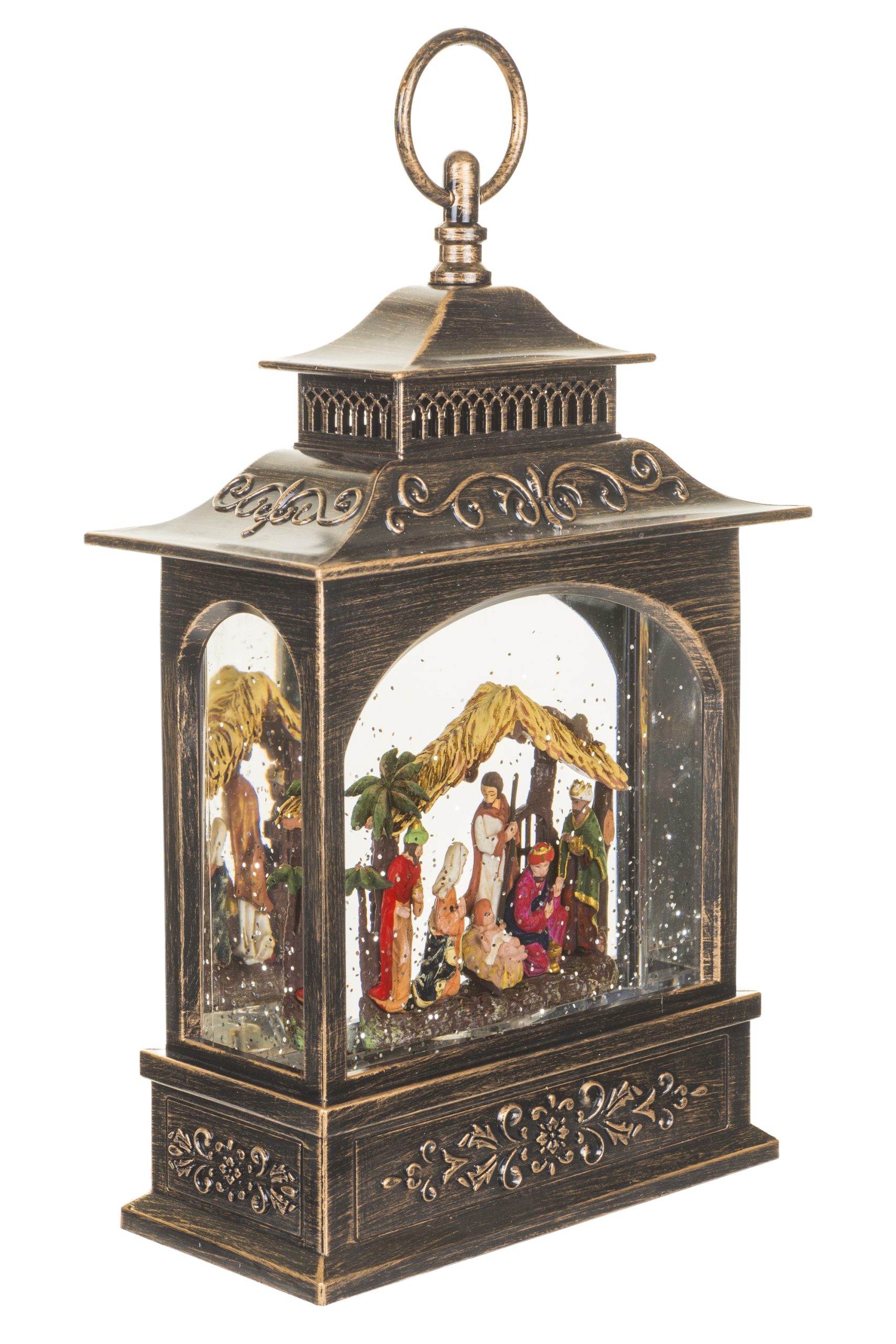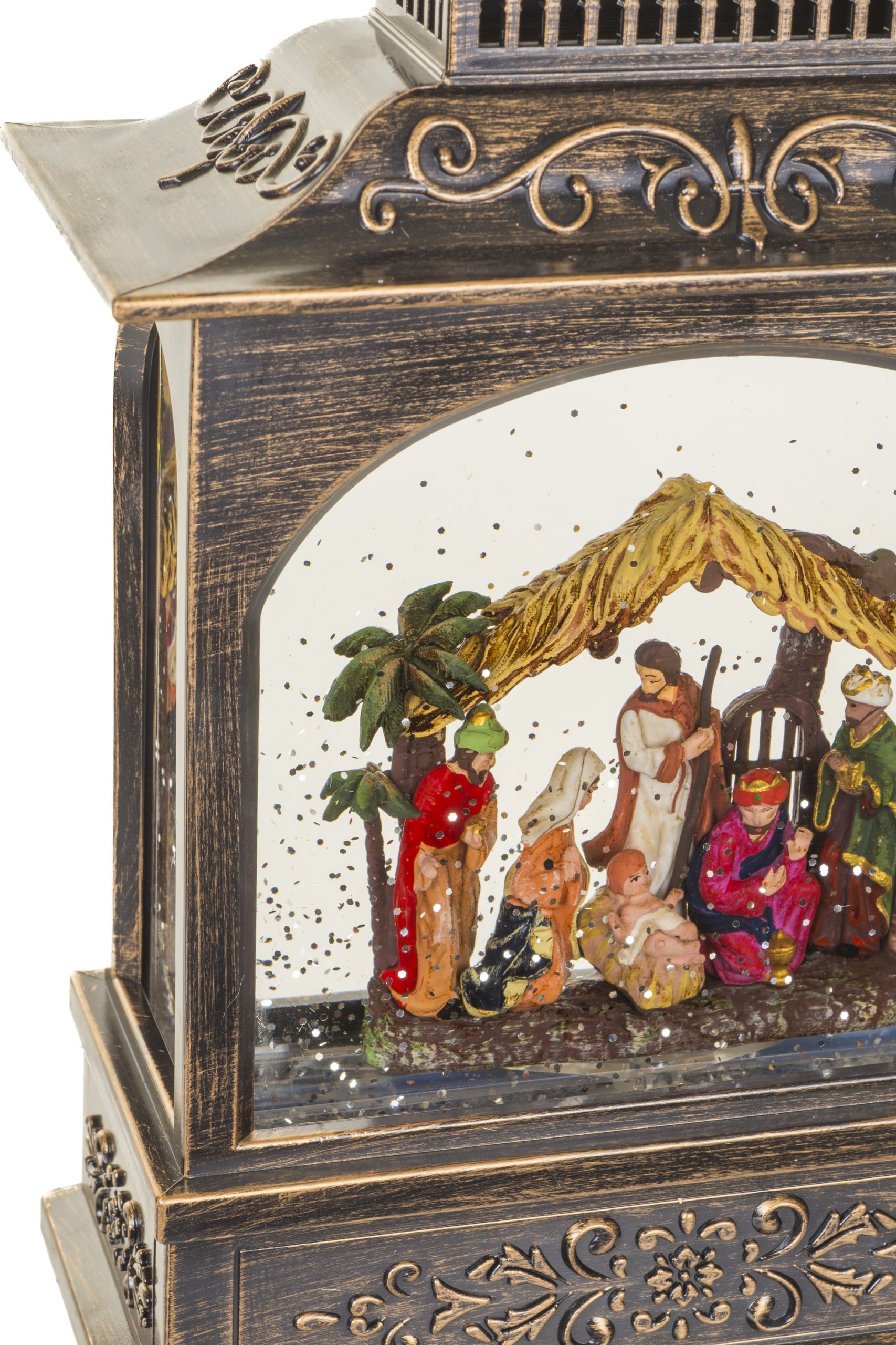 • Description: 11" Musical Antique Brown Plastic Lantern Warm White LED Snow Globe with Nativity Scene