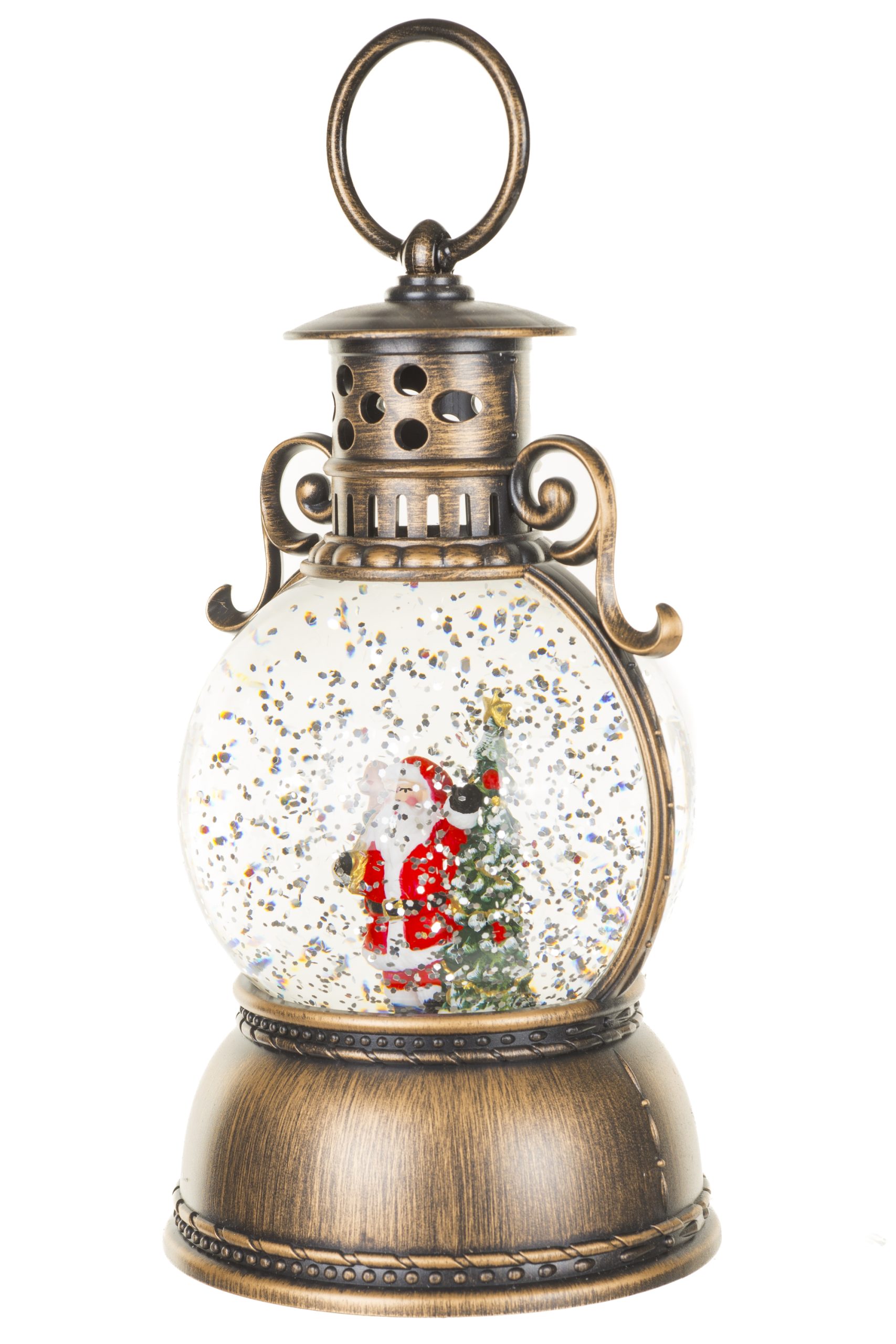 • Description: 9.5" Musical Antique Brown Plastic Oil Lantern Warm White LED Snow Globe with Santa holding Teddy Bear Gift Bag