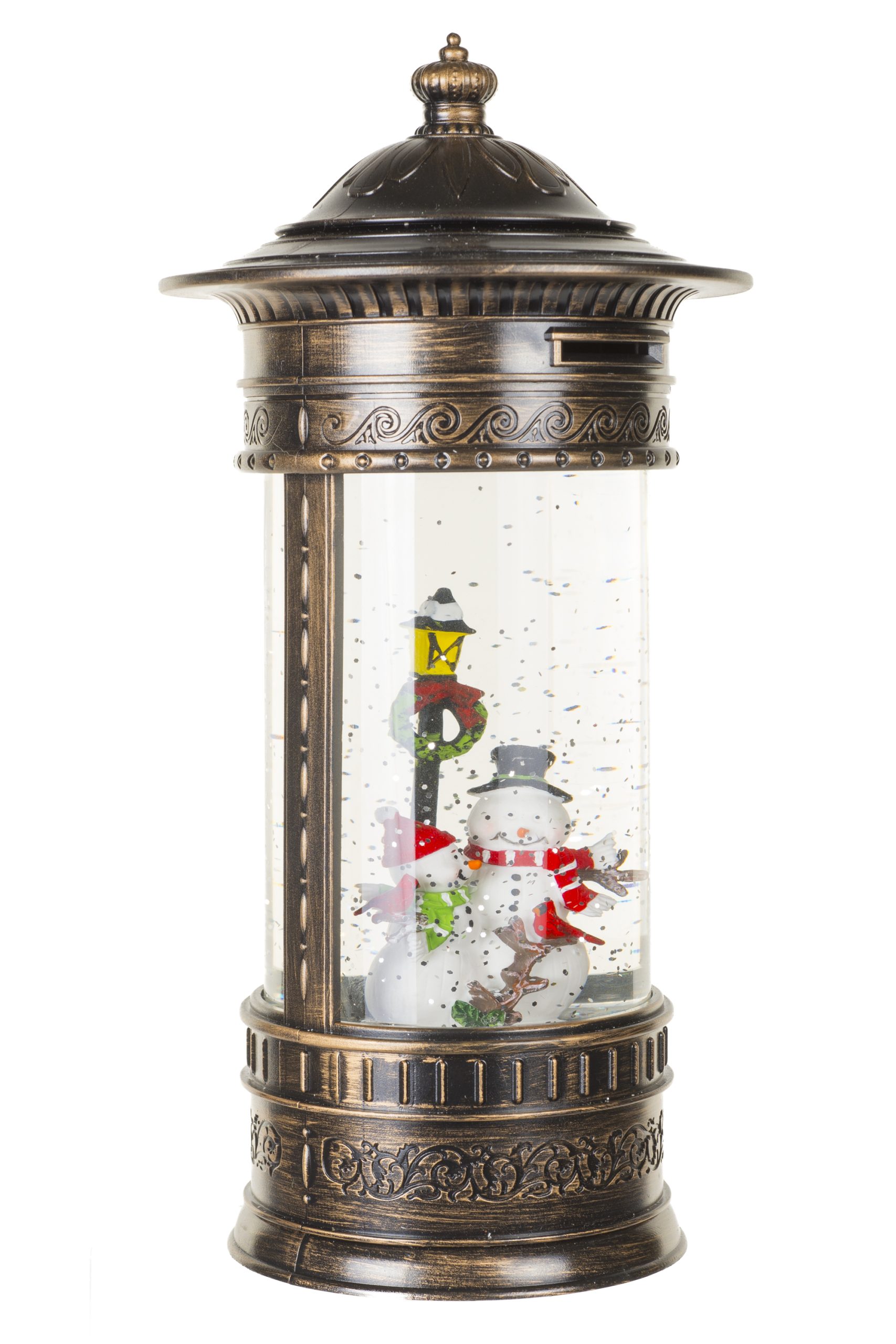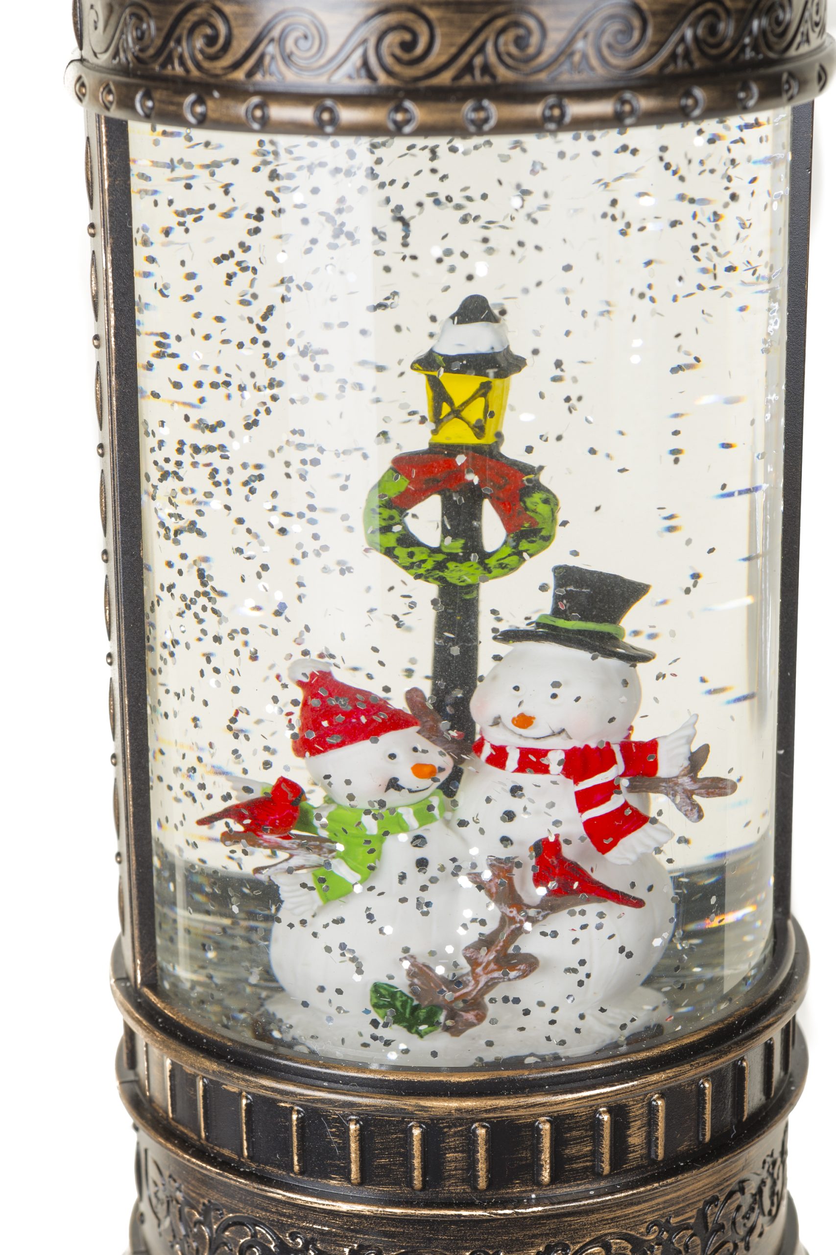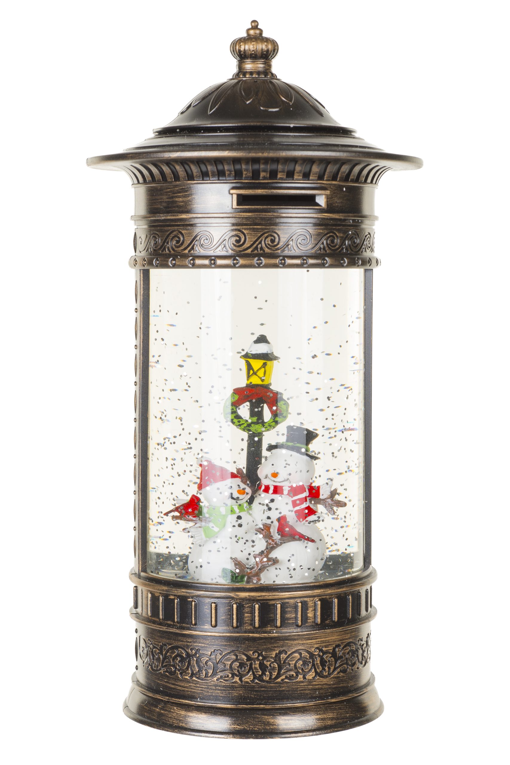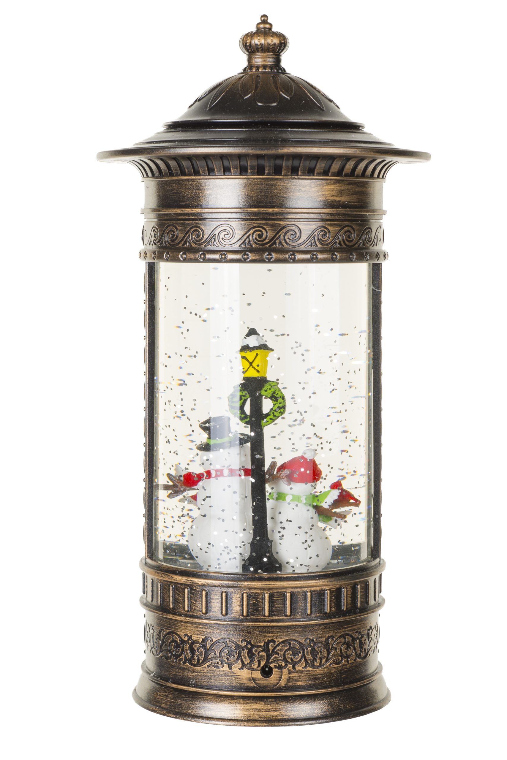 • Description: 11" Musical Circular Bronze and White Plastic Snowman's Lamp Post Warm White LED Snow Globe with Swirling Silver Glitter
