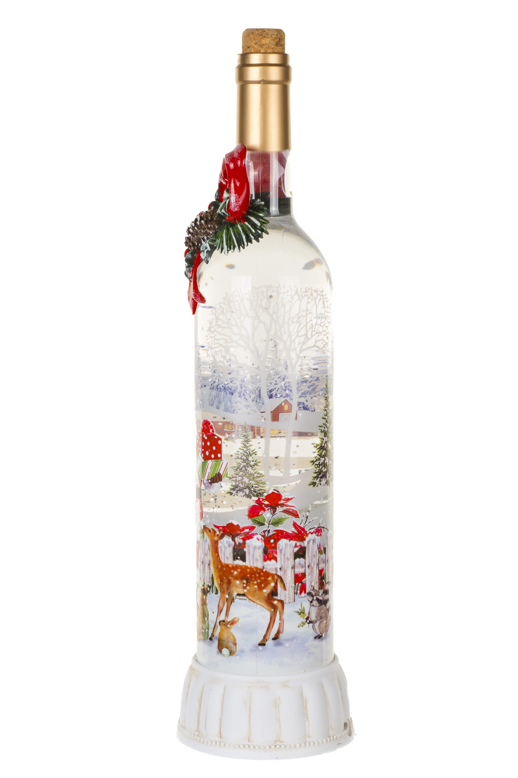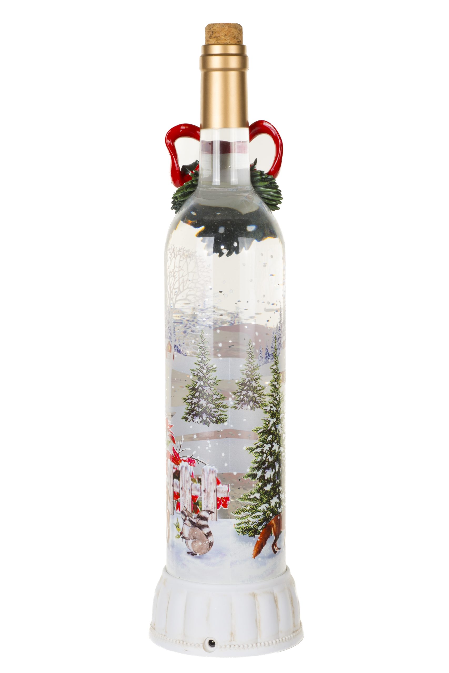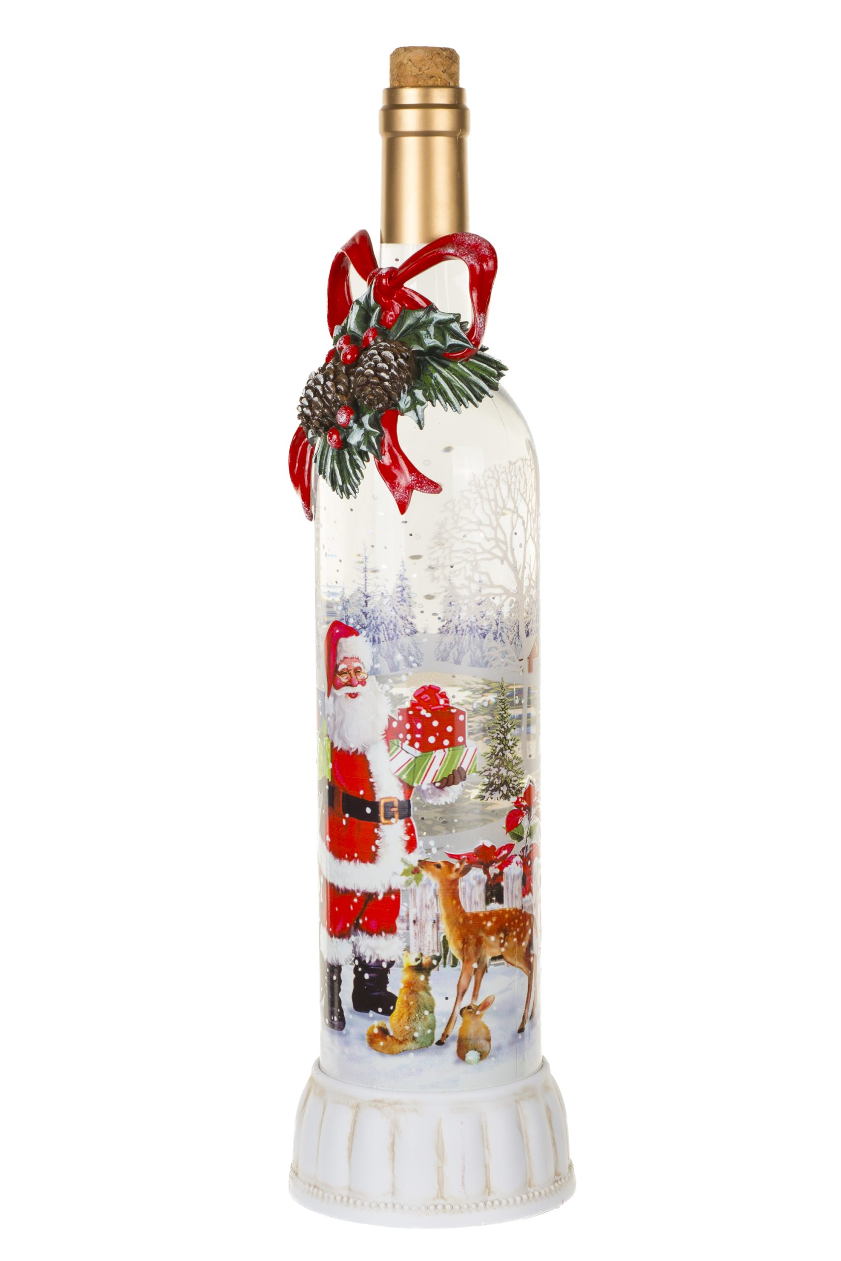 • Description: 14.75" Musical Cream and Red Plastic Champagne Bottle Warm White LED Snow Globe with Santa