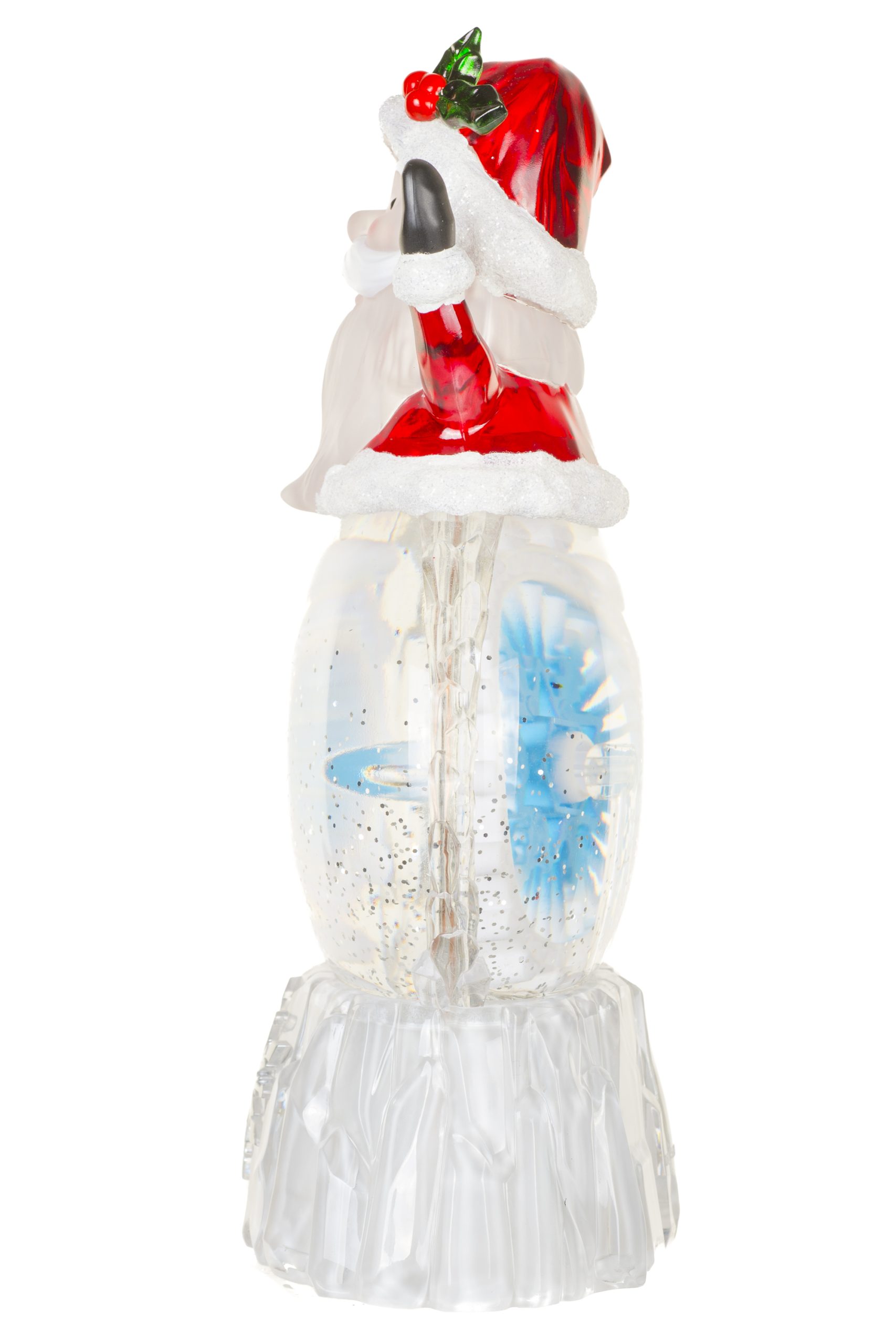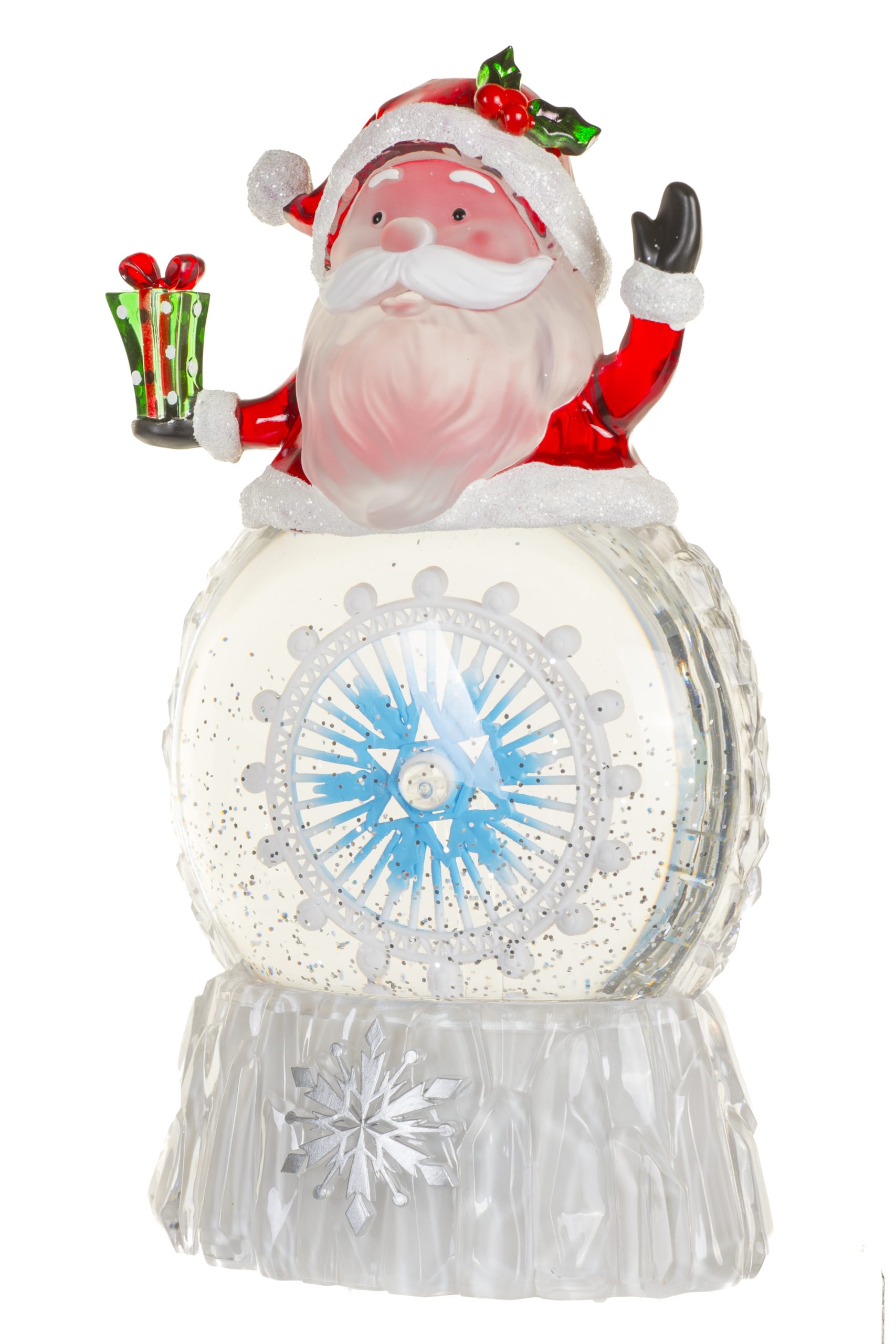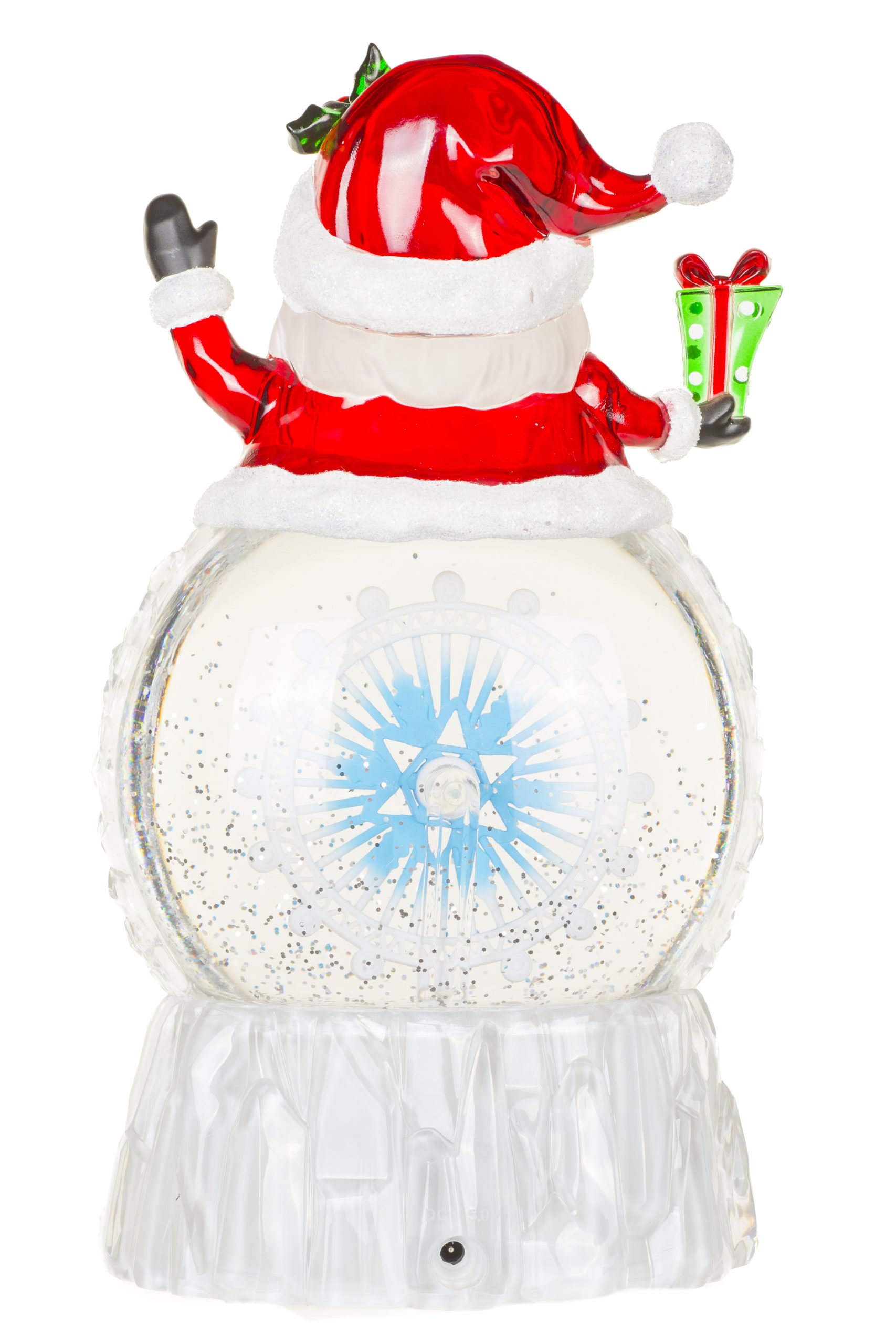 • Description: 9.75" Musical White and Red Acrylic Santa Cool White LED Snow Globe with Spinning Ship's Helm