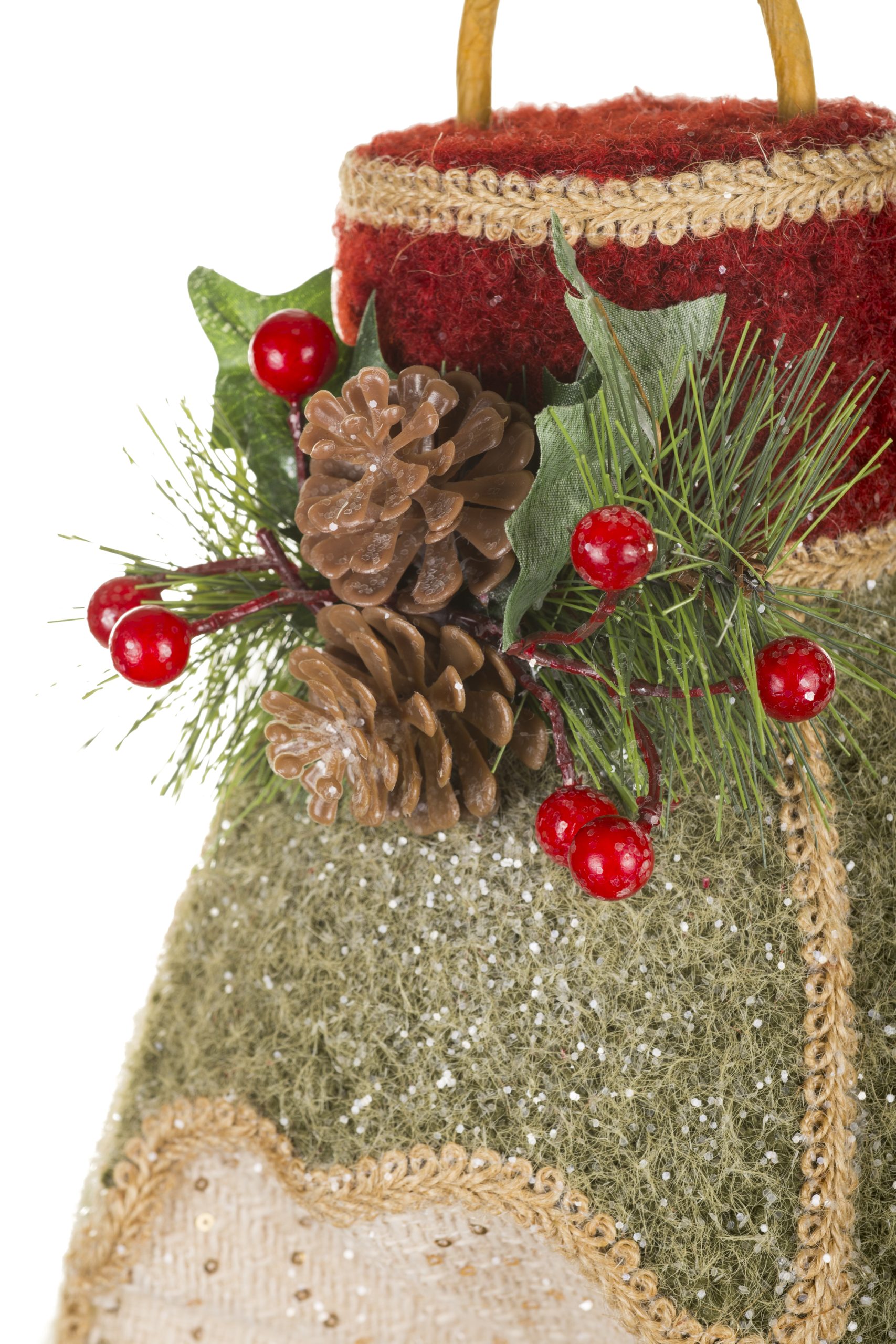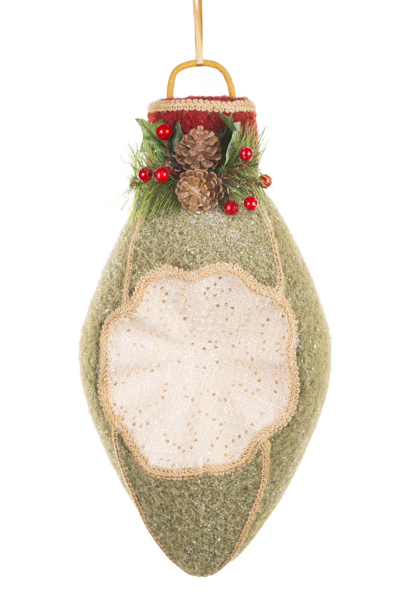 • Description: 17.5" Hanging Olive and Cream Fabric Reflector-Style Light Ornament with Pinecones