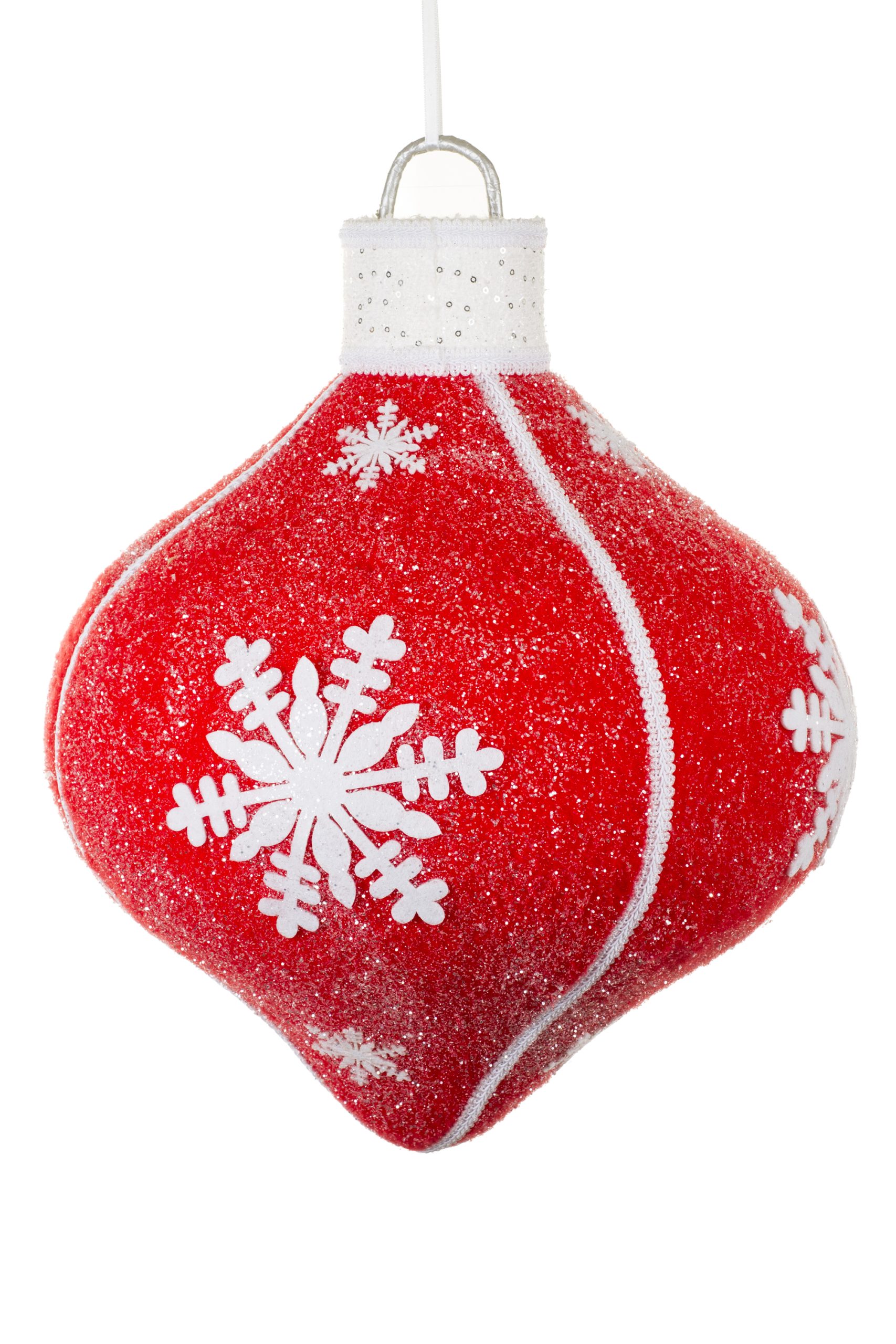 • Description: 18.5" Oversized Glittery Hanging Red and White Cloth Onion-Style Ornament with Snowflake Design