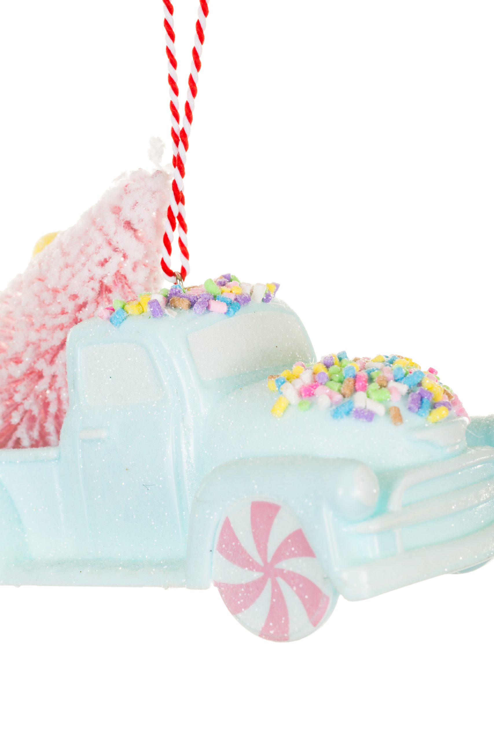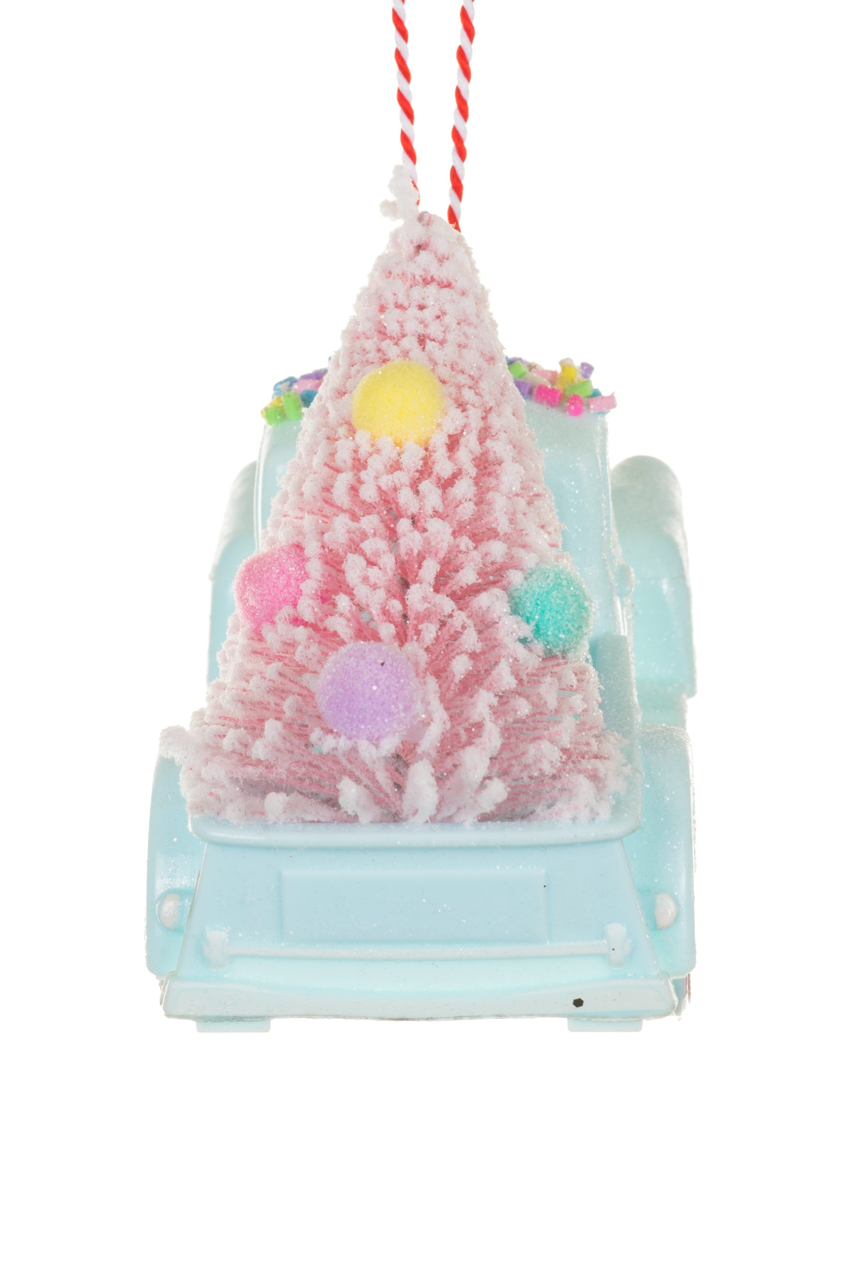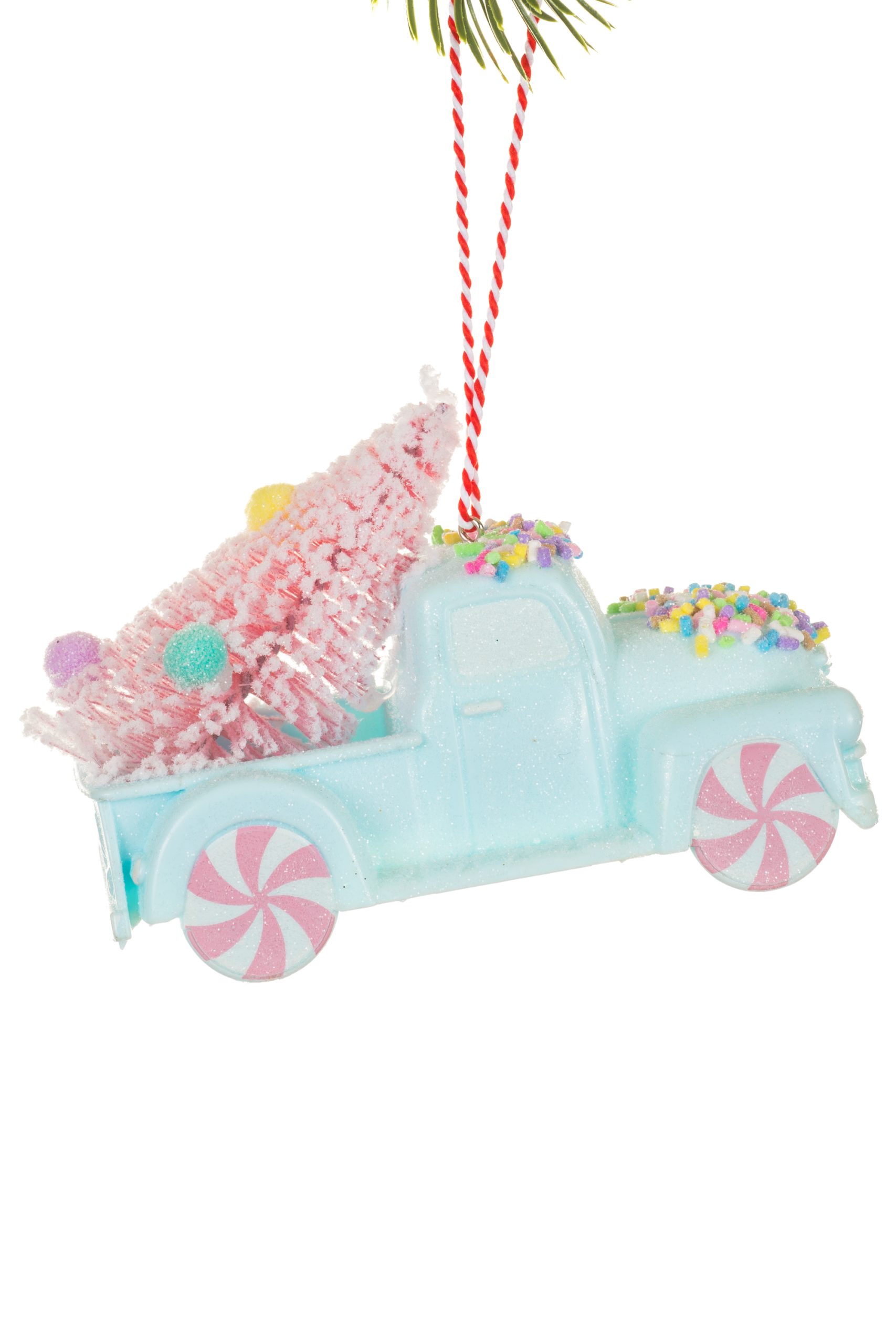 • Description: 4.75" Glittery Hanging Pastel Blue Plastic Pickup Truck Ornament with Christmas Tree & Peppermint Wheels