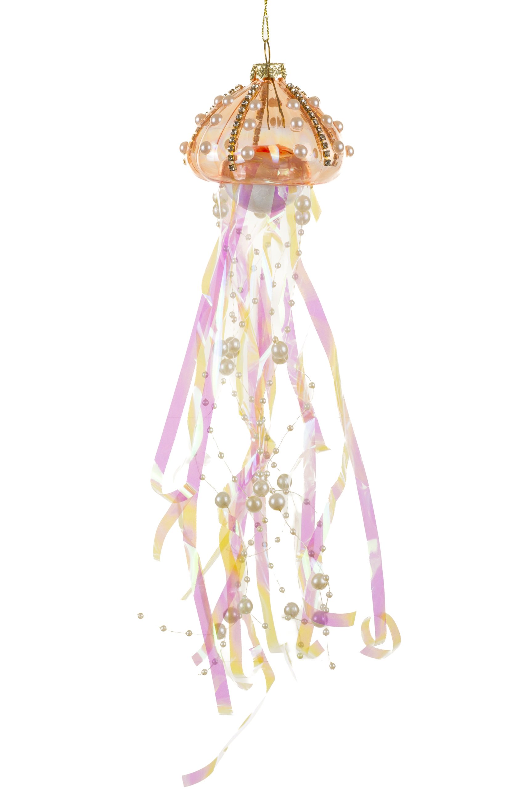 • Description: 11" Hanging Pink and Clear Glass Jellyfish Ornament with Translucent Strips & Beads