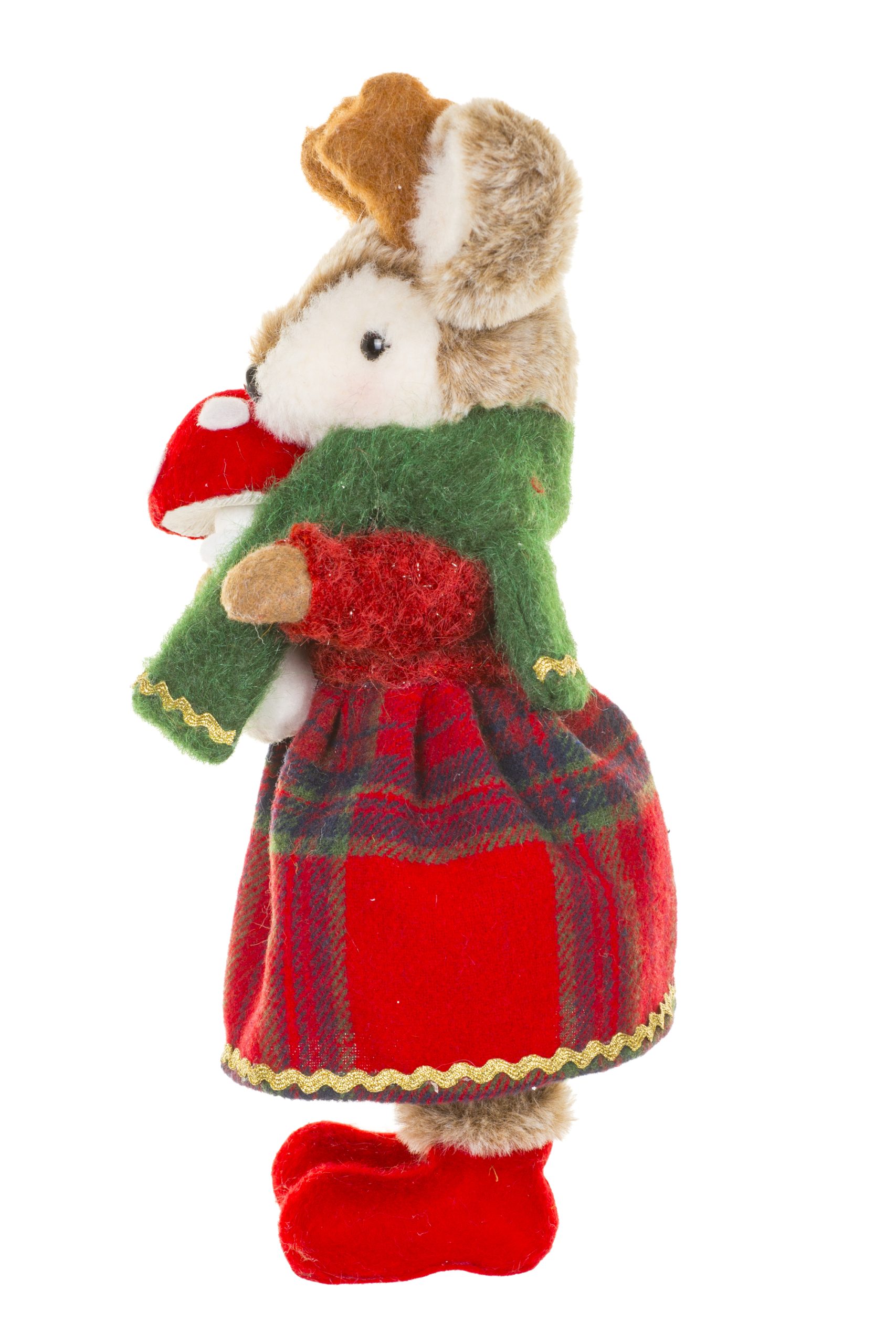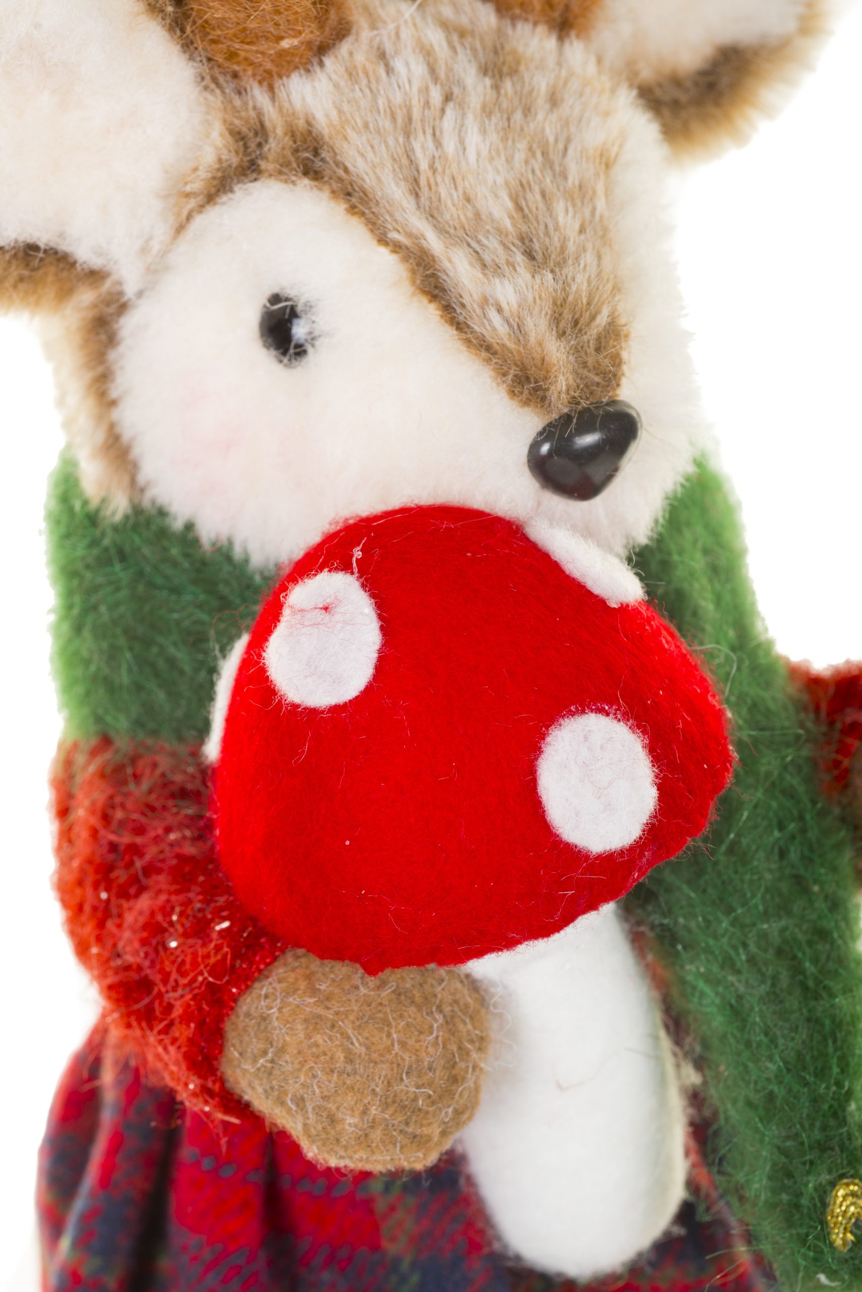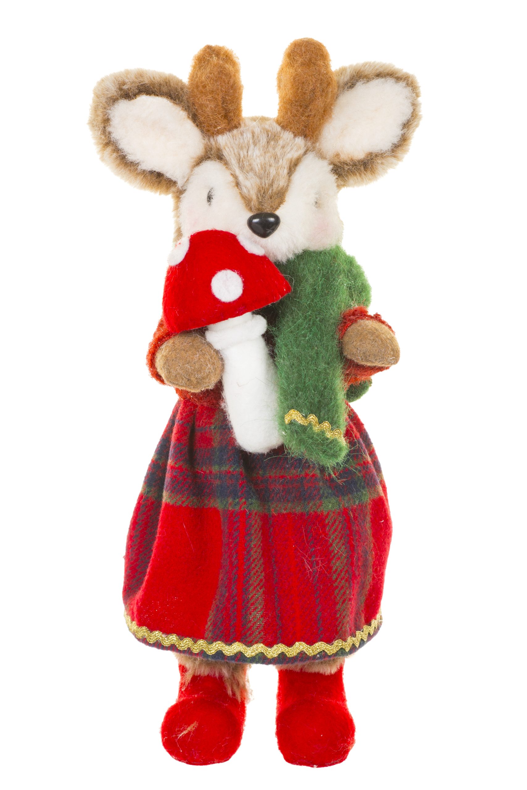 • Description: 13" Tartan Red and Green Fabric Adorable Fawn Figurine with Little Mushroom
