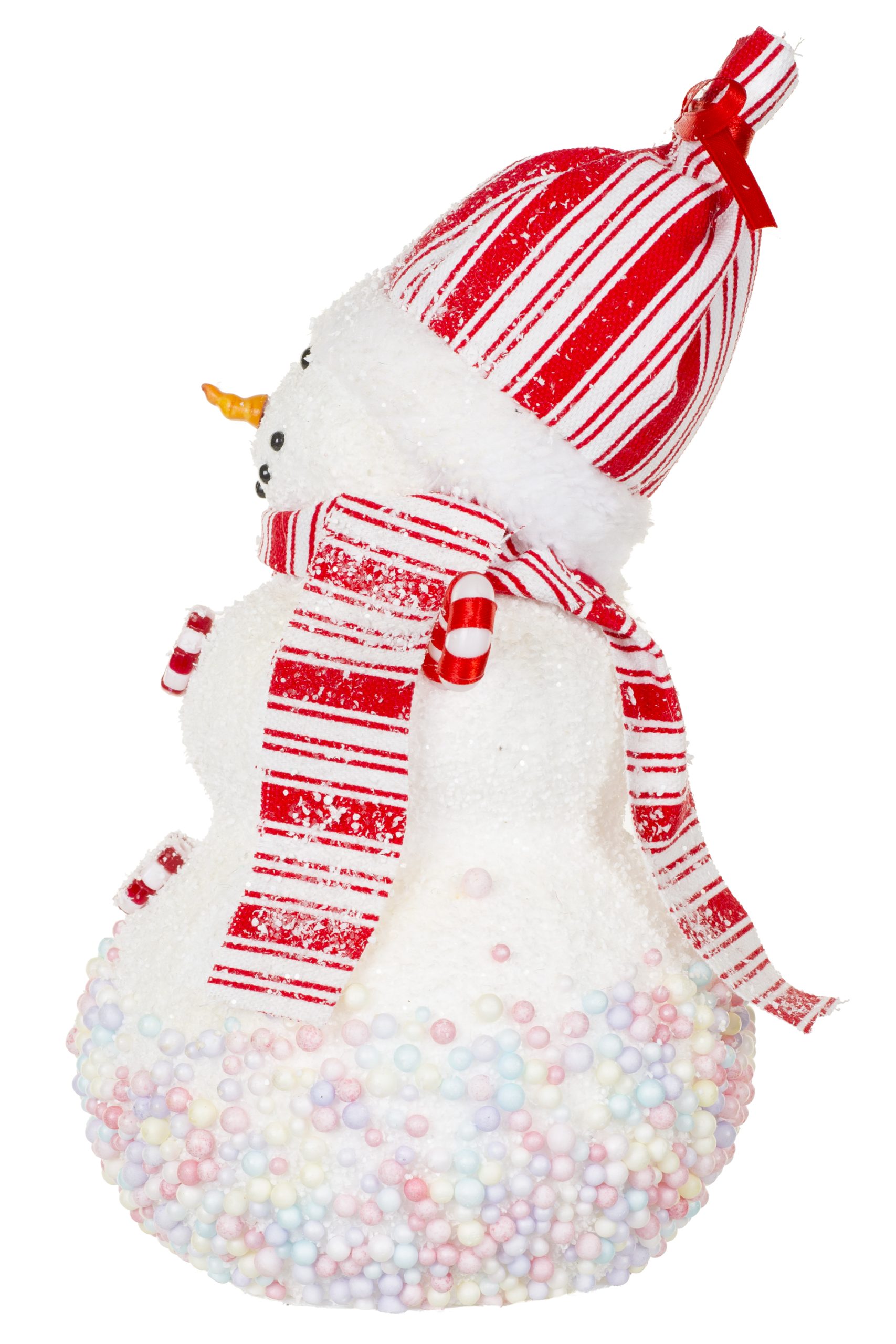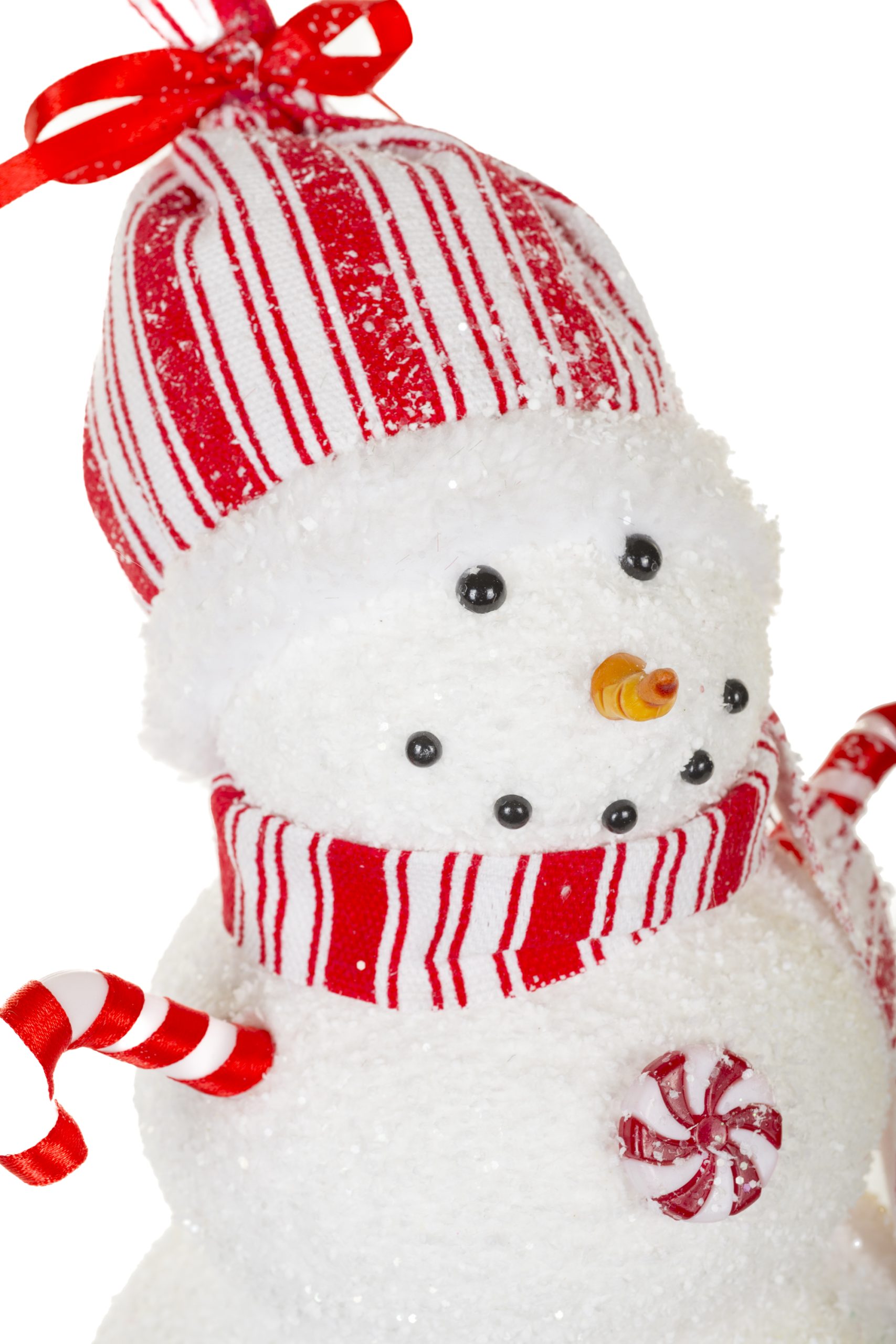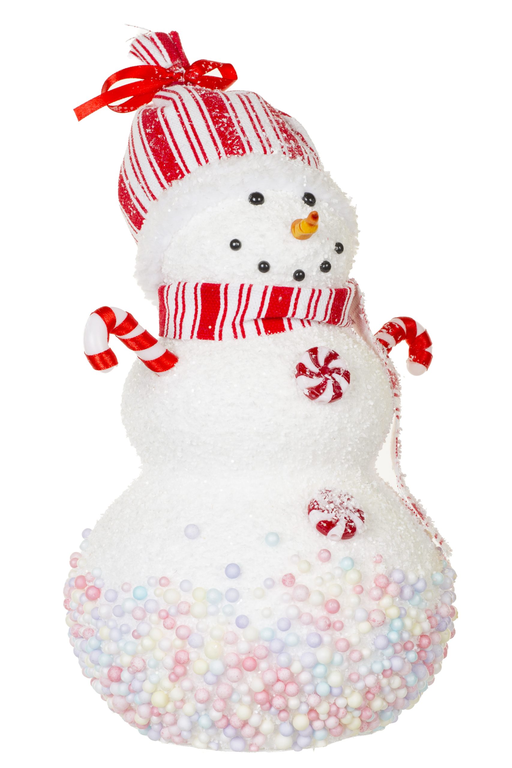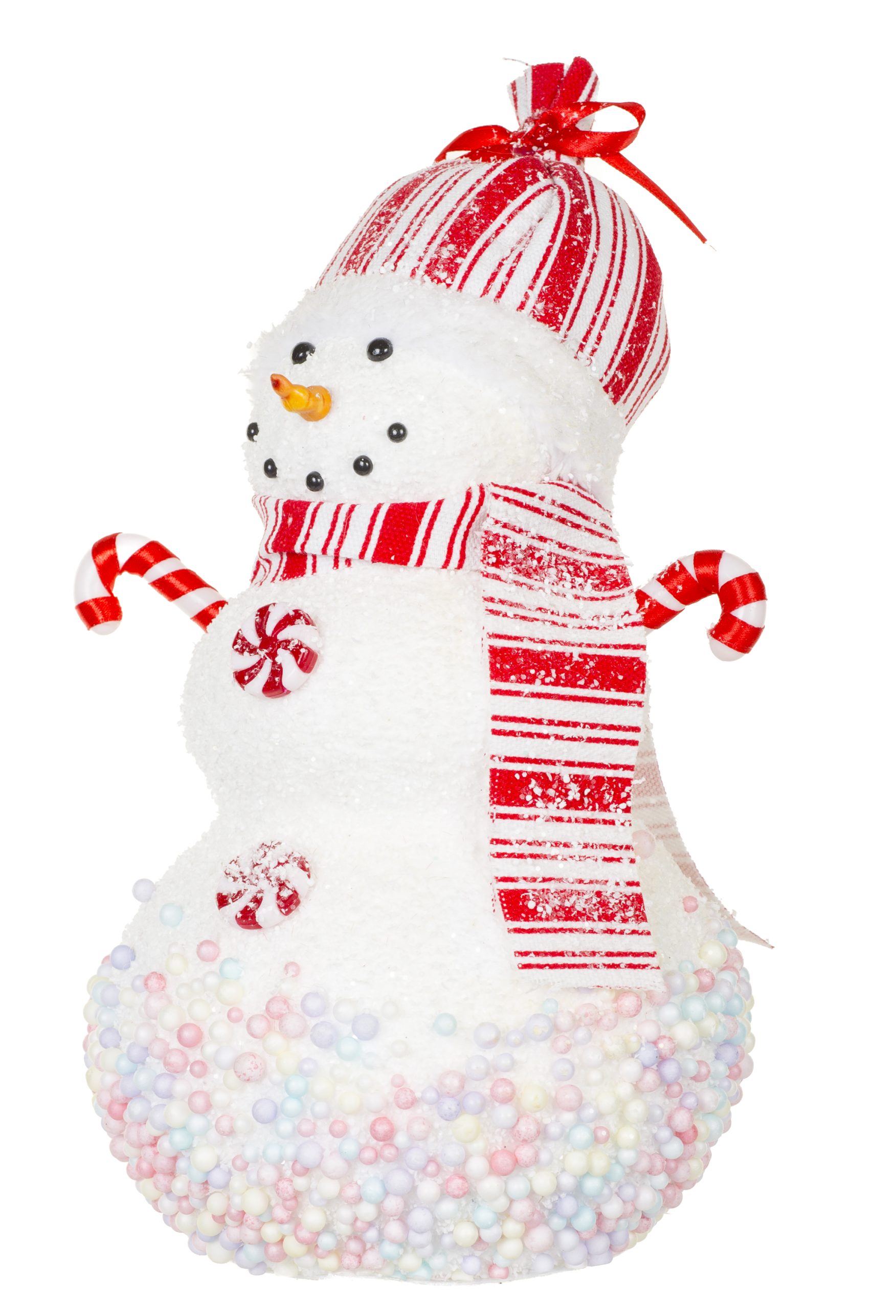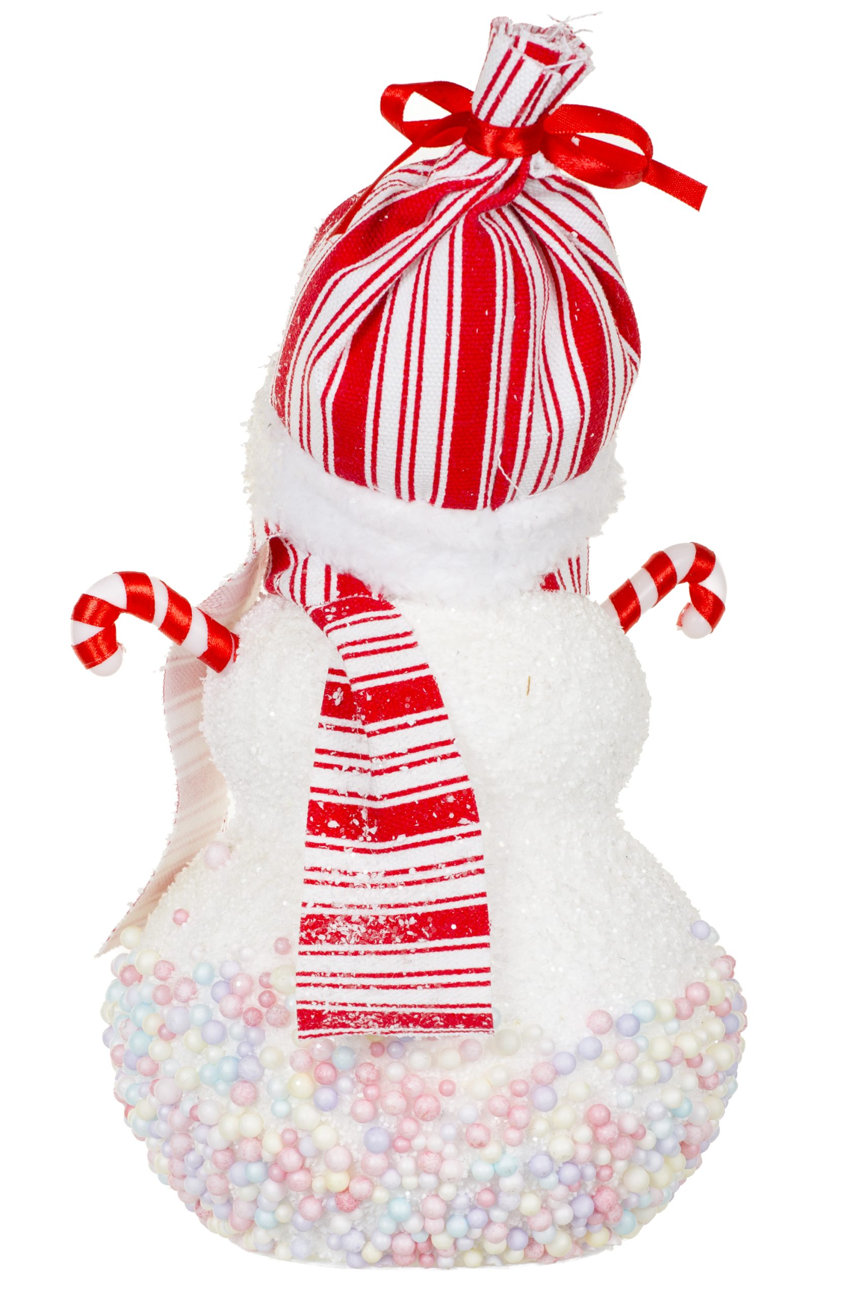 • Description: 11" Red and White Foam Candied Snowman Figurine with Candycane Arms & Toque
