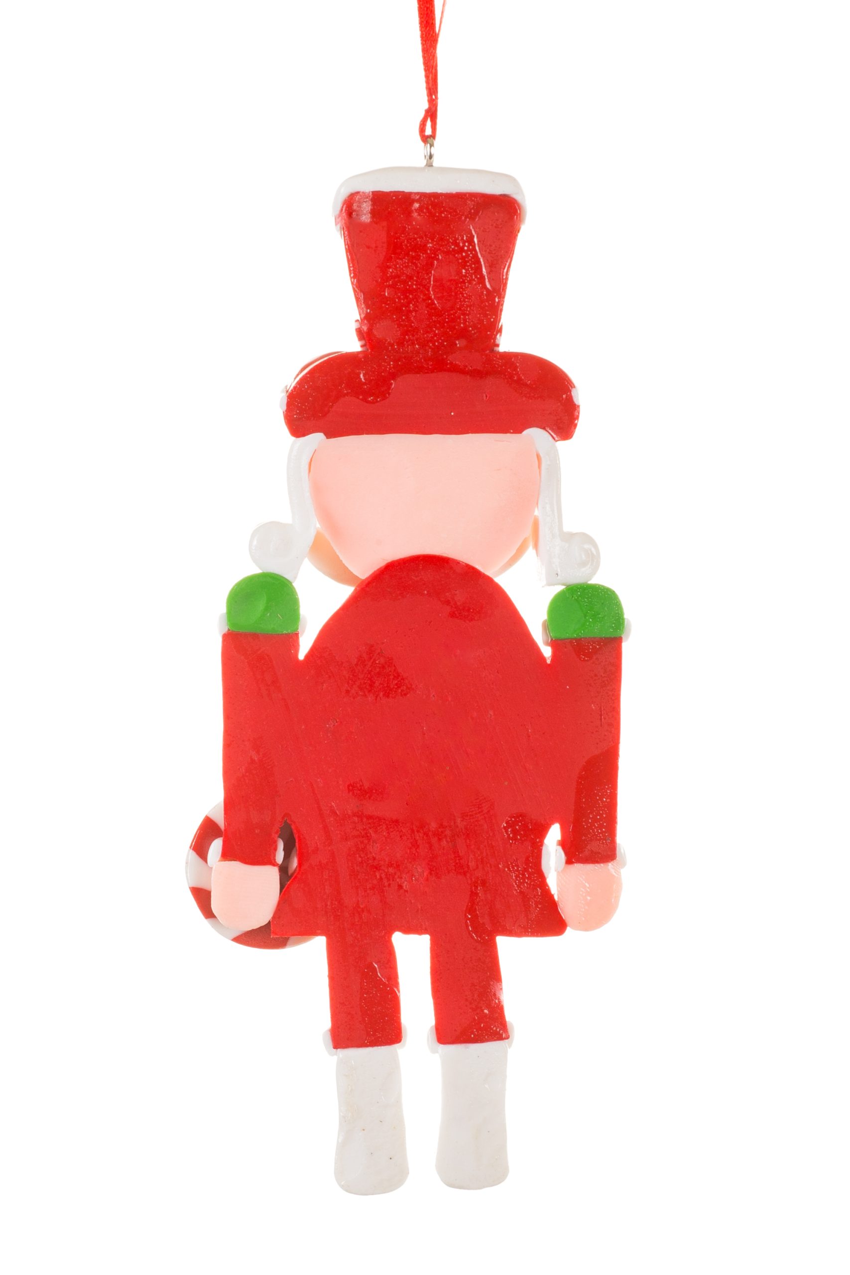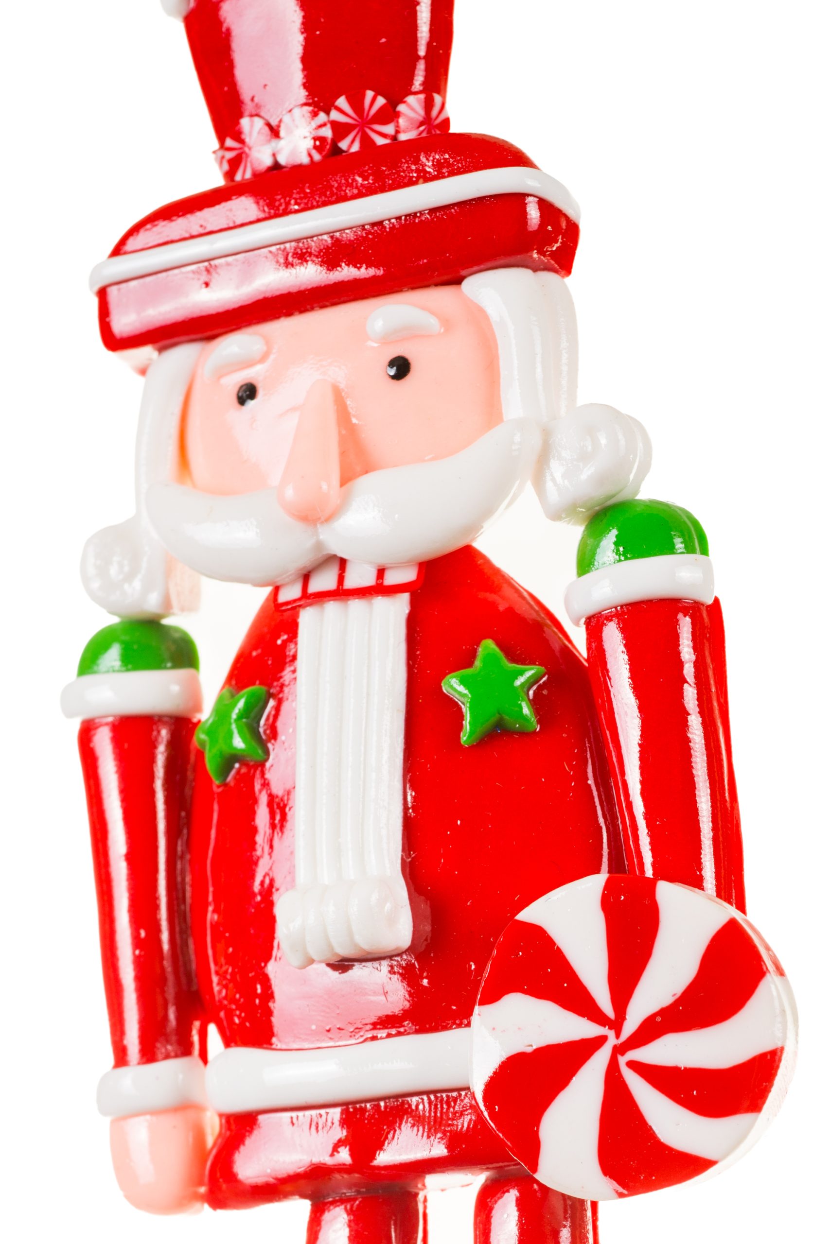 • Description: 6" Hanging Red and White Acrylic Candyman Nutcracker Ornament with Peppermint Present