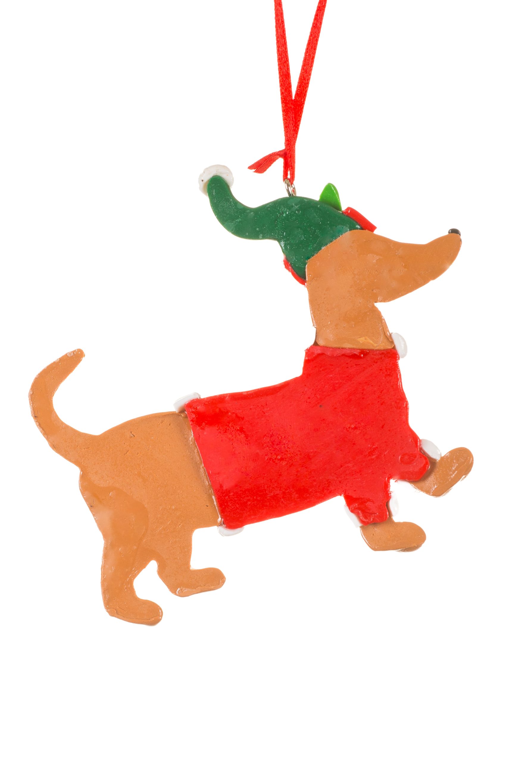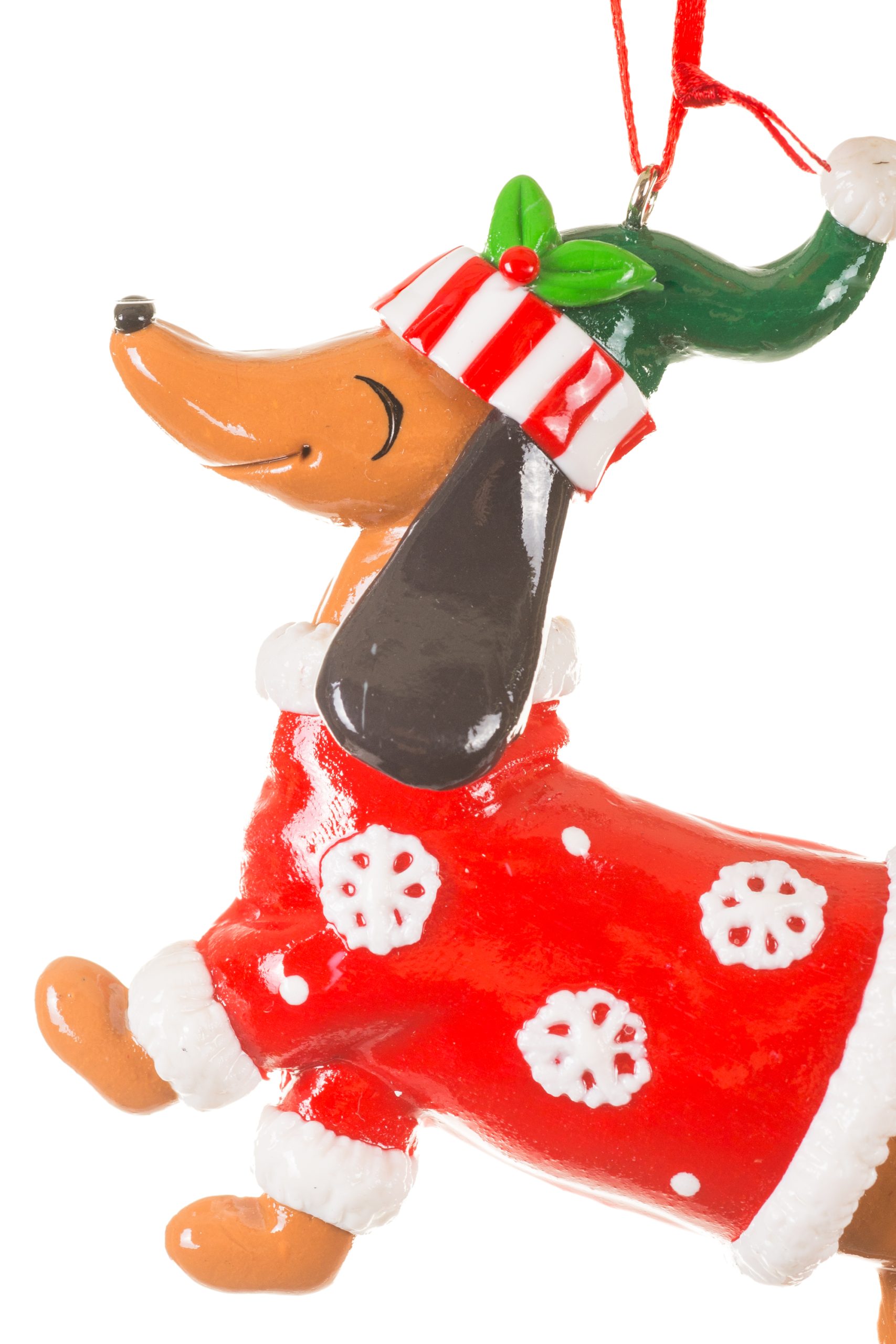 • Description: 4" Hanging Red and Brown Acrylic Doodle Dog Ornament with Snowflake Sweater