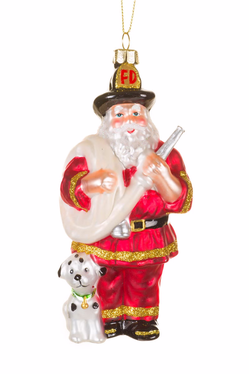 • Description: 6" Hanging Red Glass Fireman Santa Ornament with Dalmatian